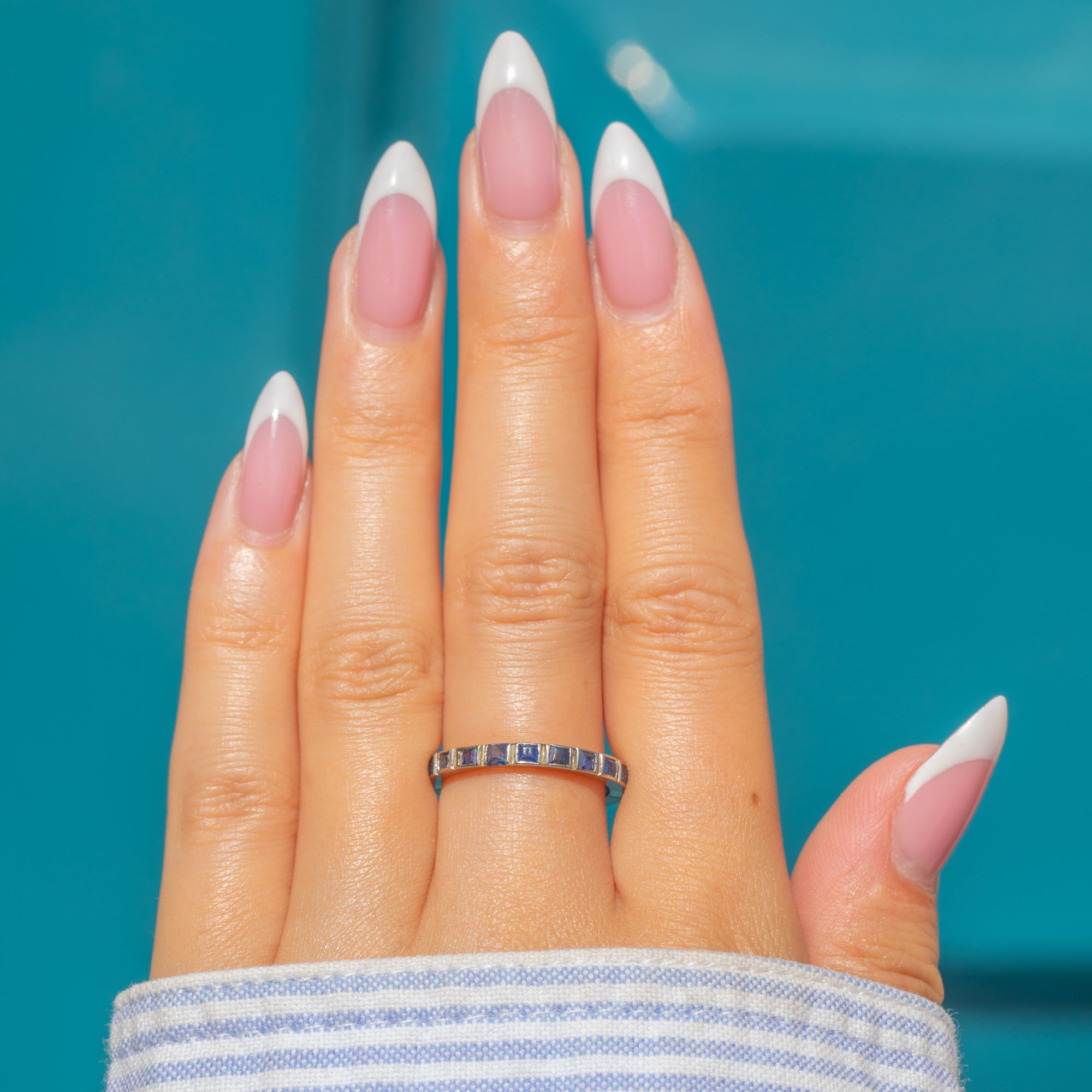 This elegant Art Deco eternity ring is set with a continuous row of twenty deep blue Sapphires, weighing approximately 0.70ct in total. Each square Sapphire creates a beautifully even, uninterrupted band of colour, and the gemstones are mounted in a combination of Platinum and 18ct Yellow Gold, with its sleek geometric pattern characteristic of the Art Deco era.