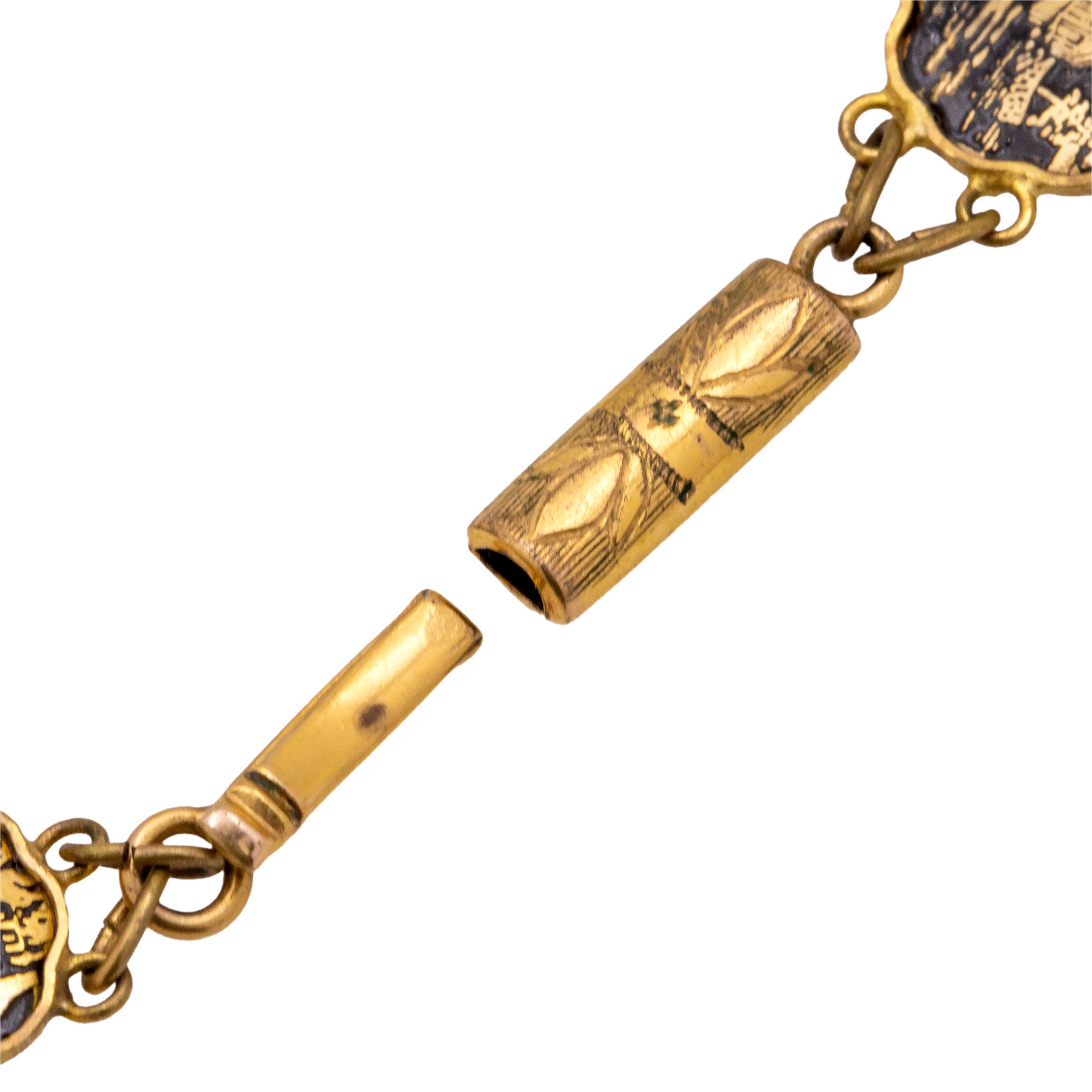 MATERIALS: Tests as Gold tone metal with 24kt Gold, Shakudo Damascene.