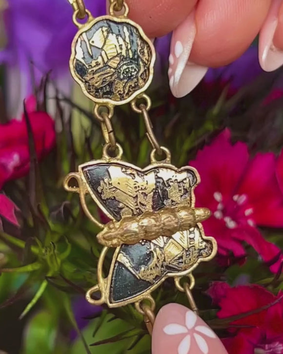This Art Deco Japanese Shakudo Damascene butterfly bracelet is a work of art! Crafted during the early half of the 20th century, each fan-shaped link tells its own story with beautiful Japanese motifs using a technique called Damascene. Damascene involves inlaying metal into an oxidised steel backdrop, to create intricate and beautiful designs such as these!