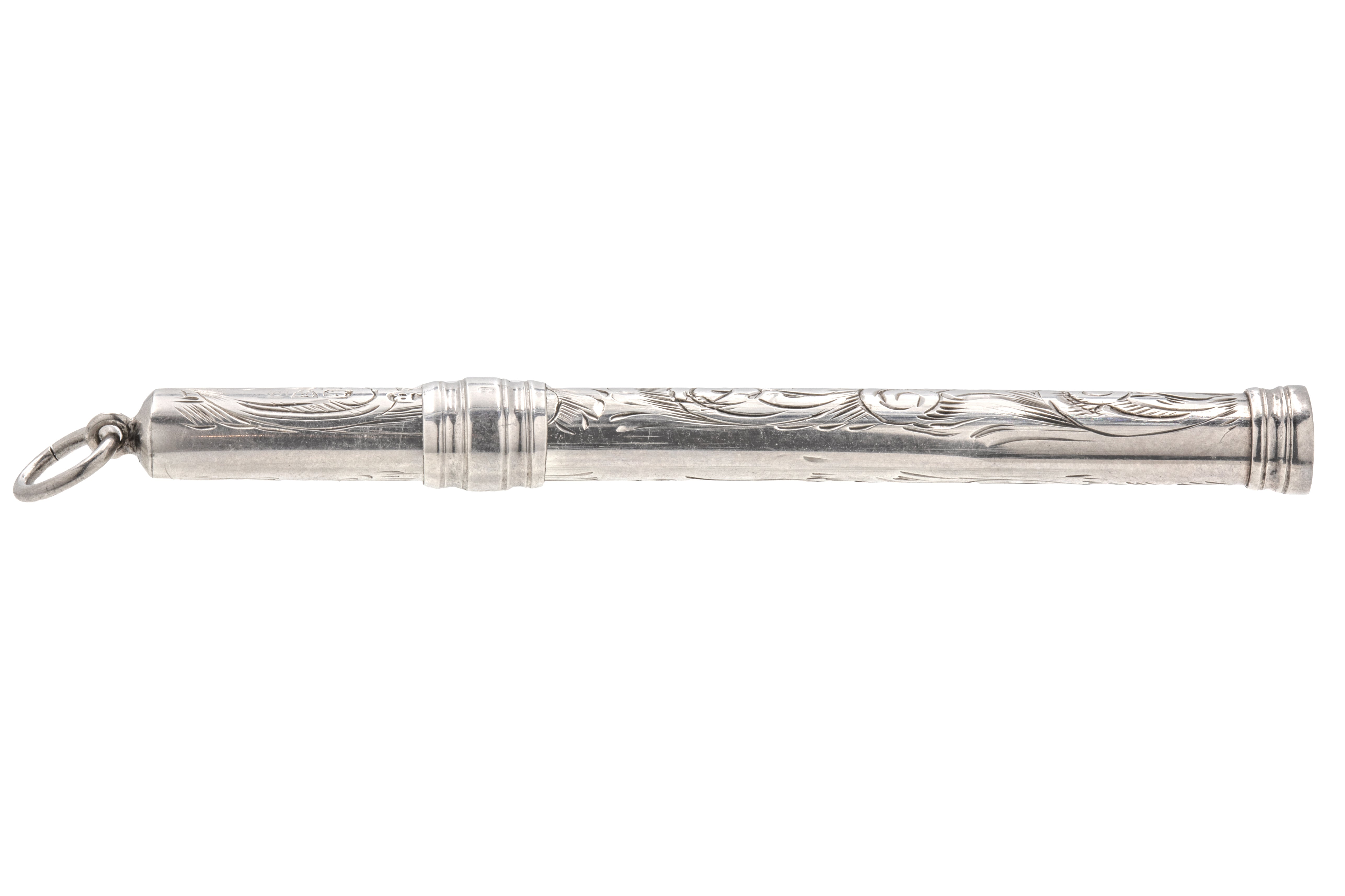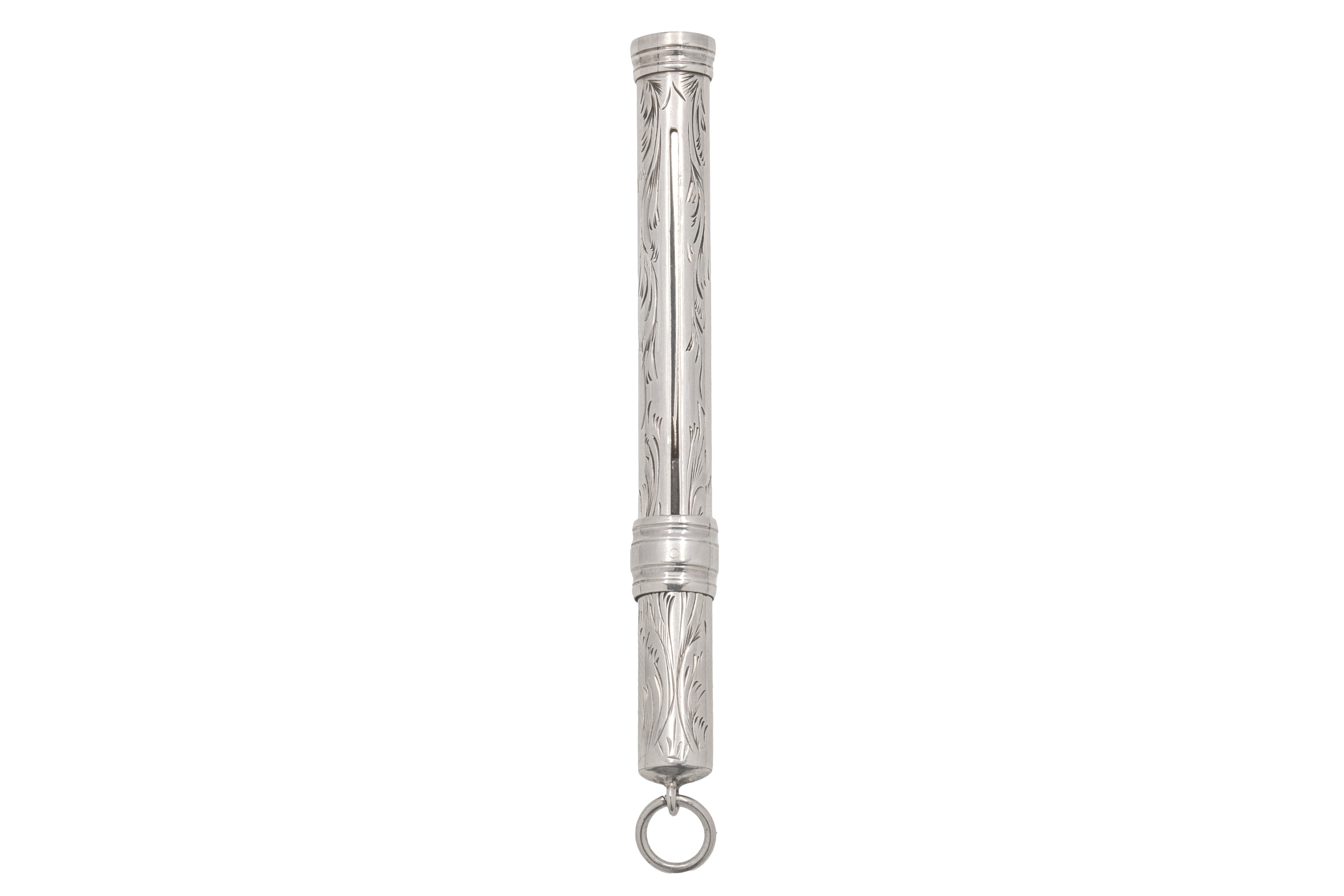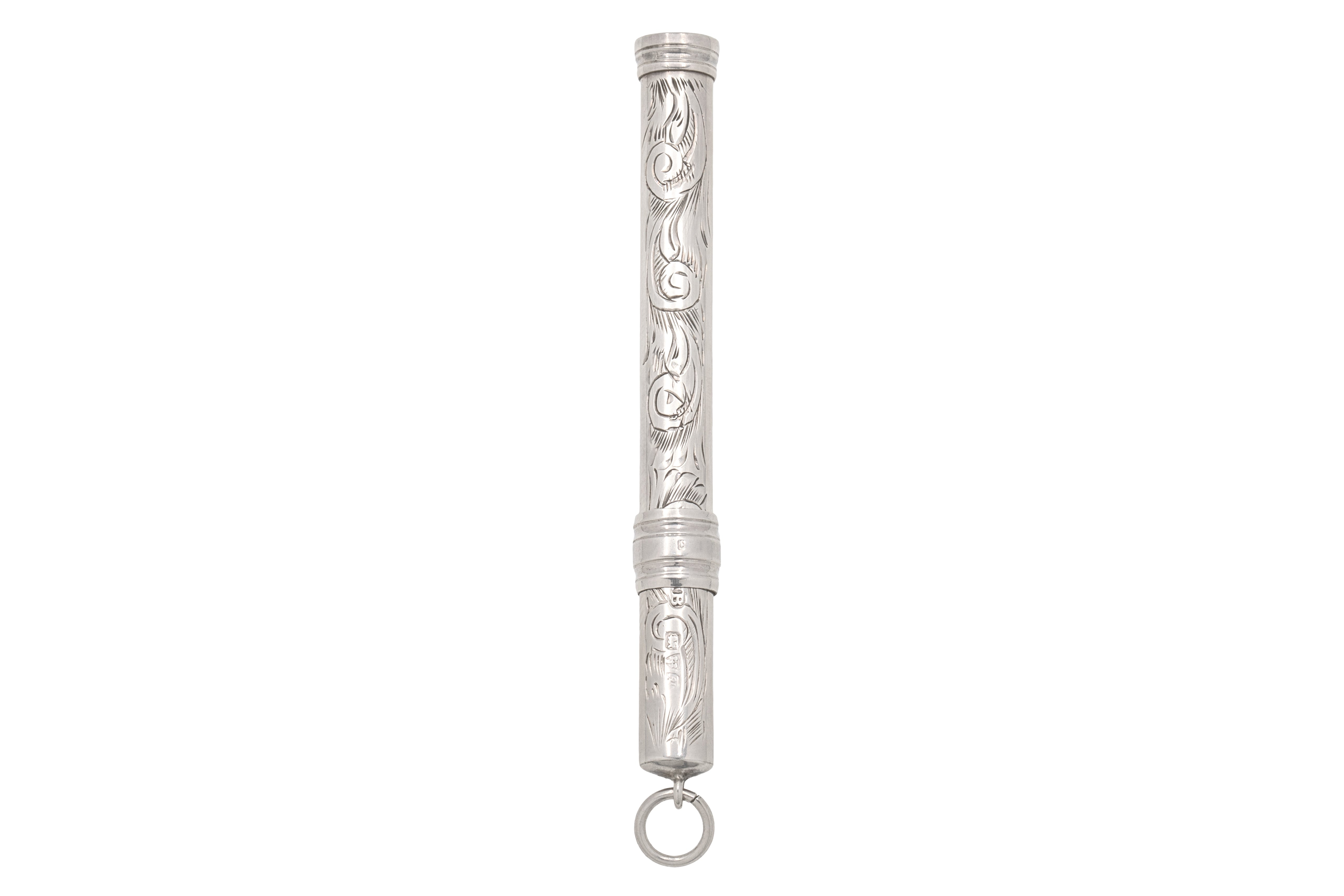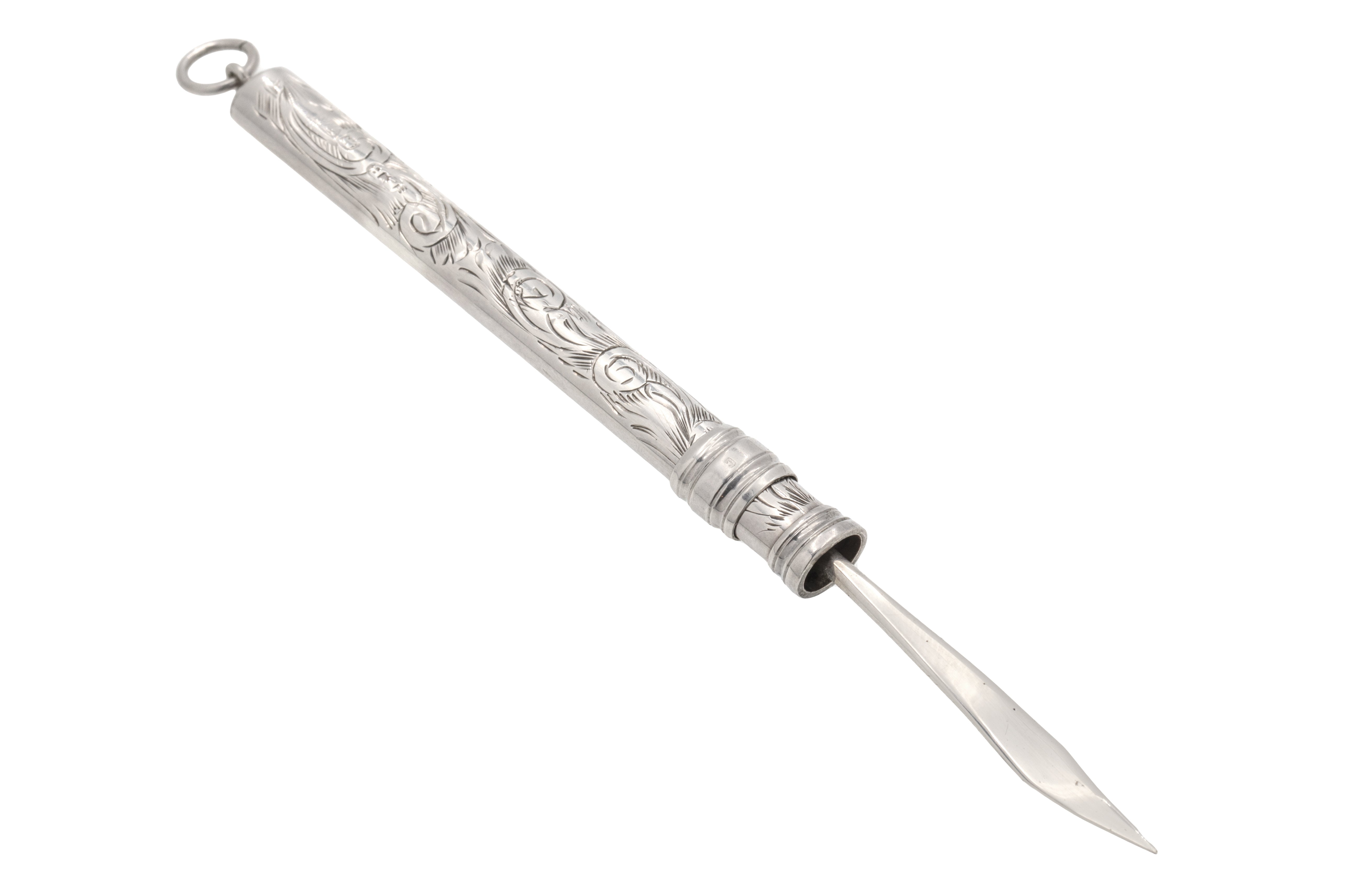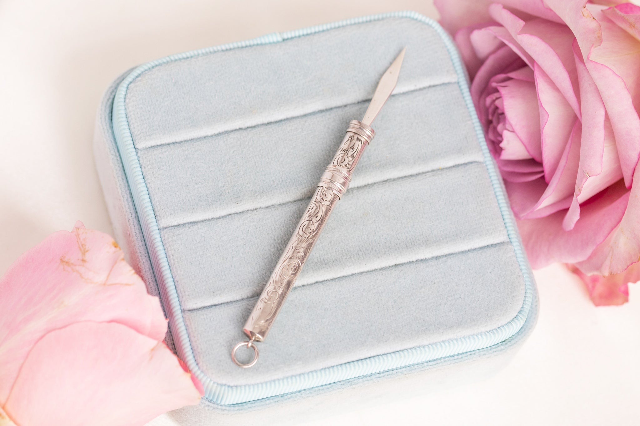 EXCELLENT. This Art Deco Silver engraved toothpick pendant is in excellent condition! The Sterling Silver is beautifully crisp and the engravings have remained immaculate. The slider, which is the band running around the body of the toothpick, works perfectly allowing for the knife to be revealed - just slide up and down with care! Her toothpick remains incredibly sharp making her just as functional as when she was first created.