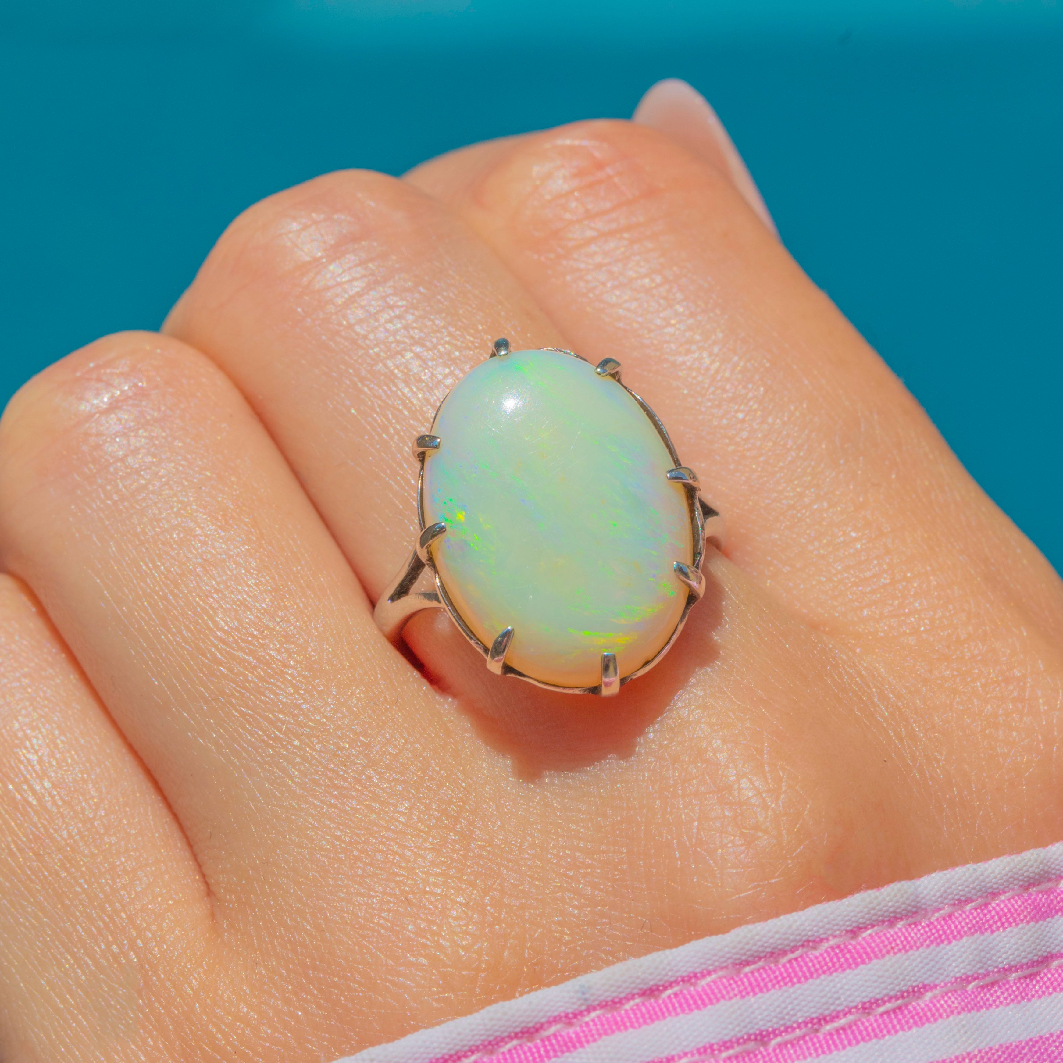 Art Deco Silver Opal Cabochon Dress Ring, 4.60ct Natural Solid Opal
