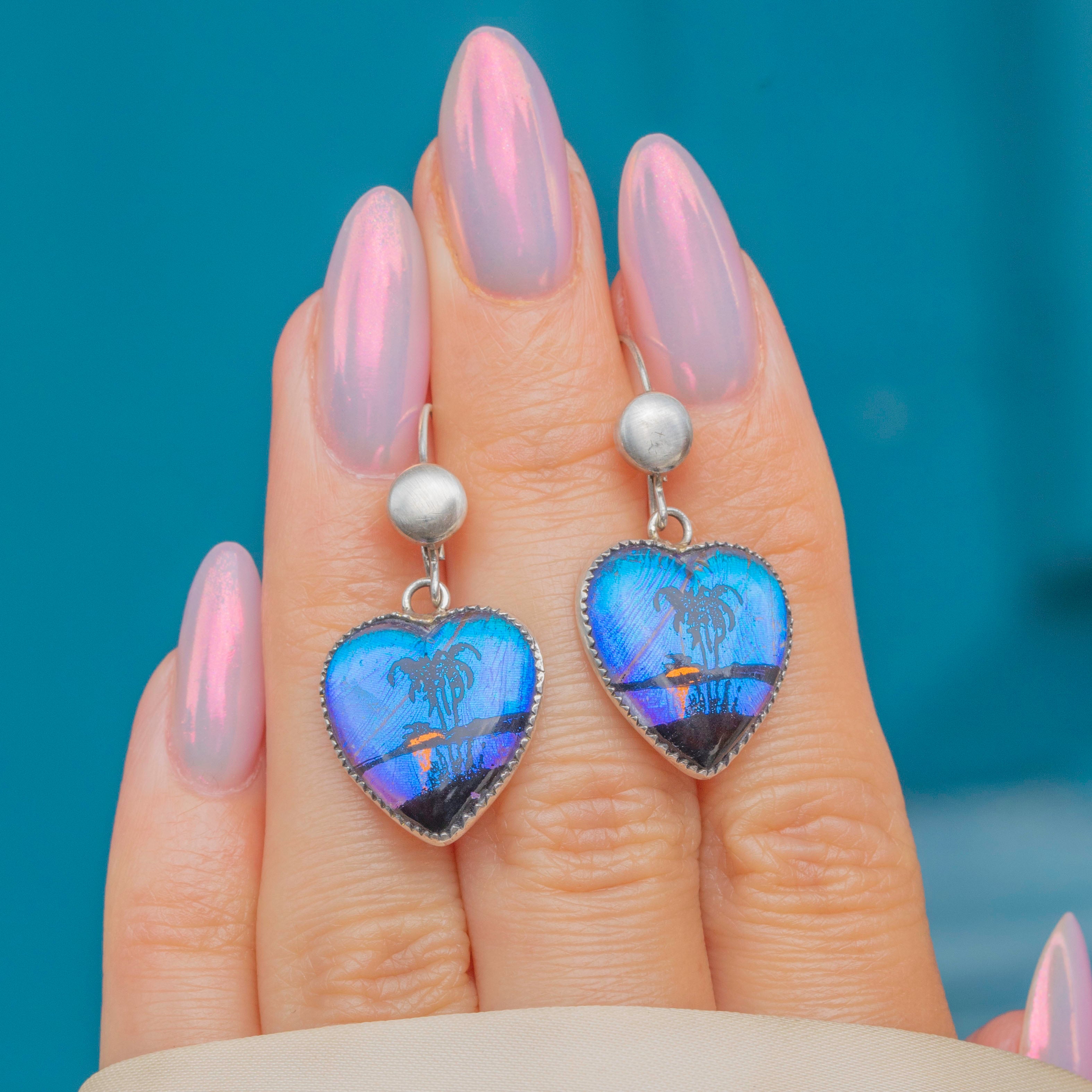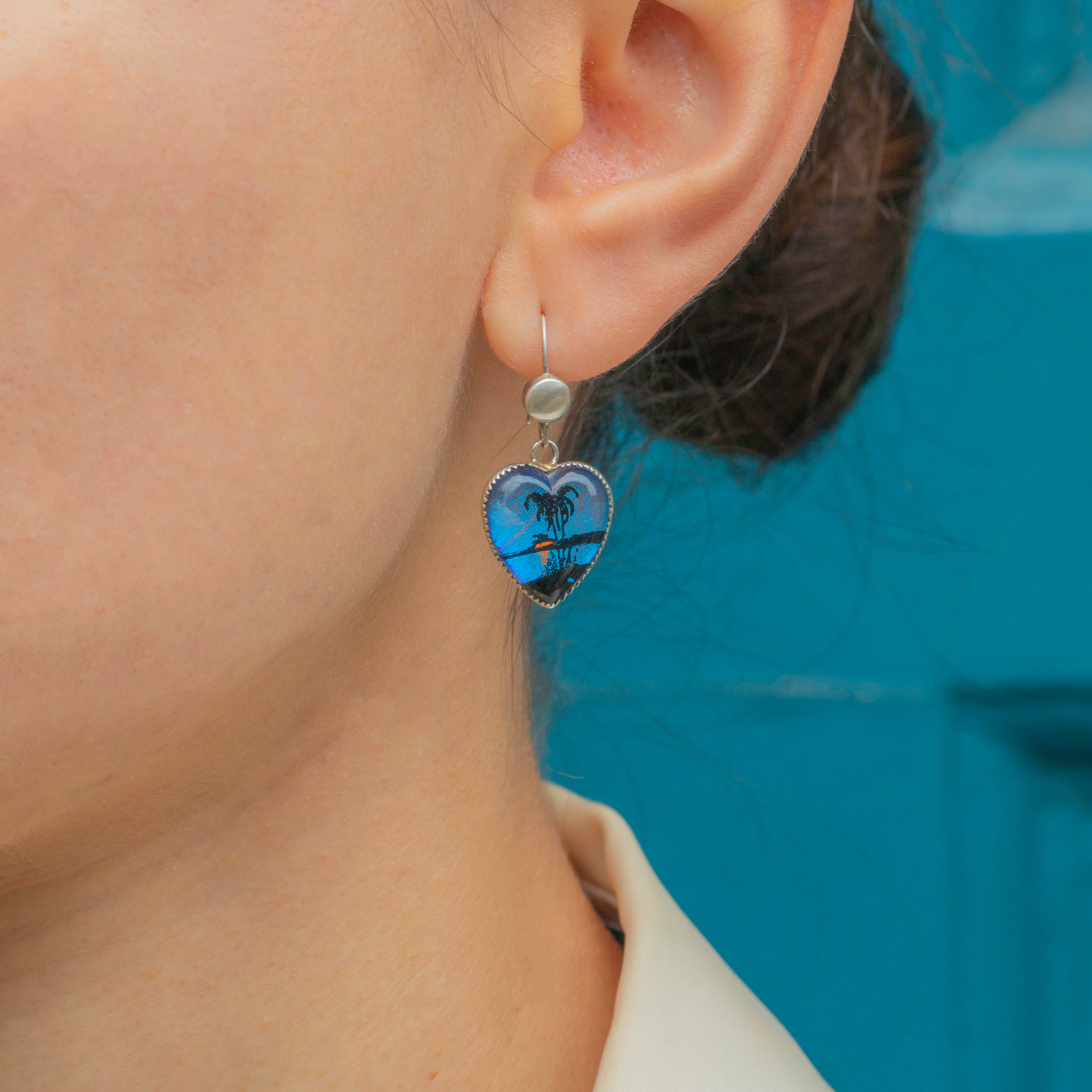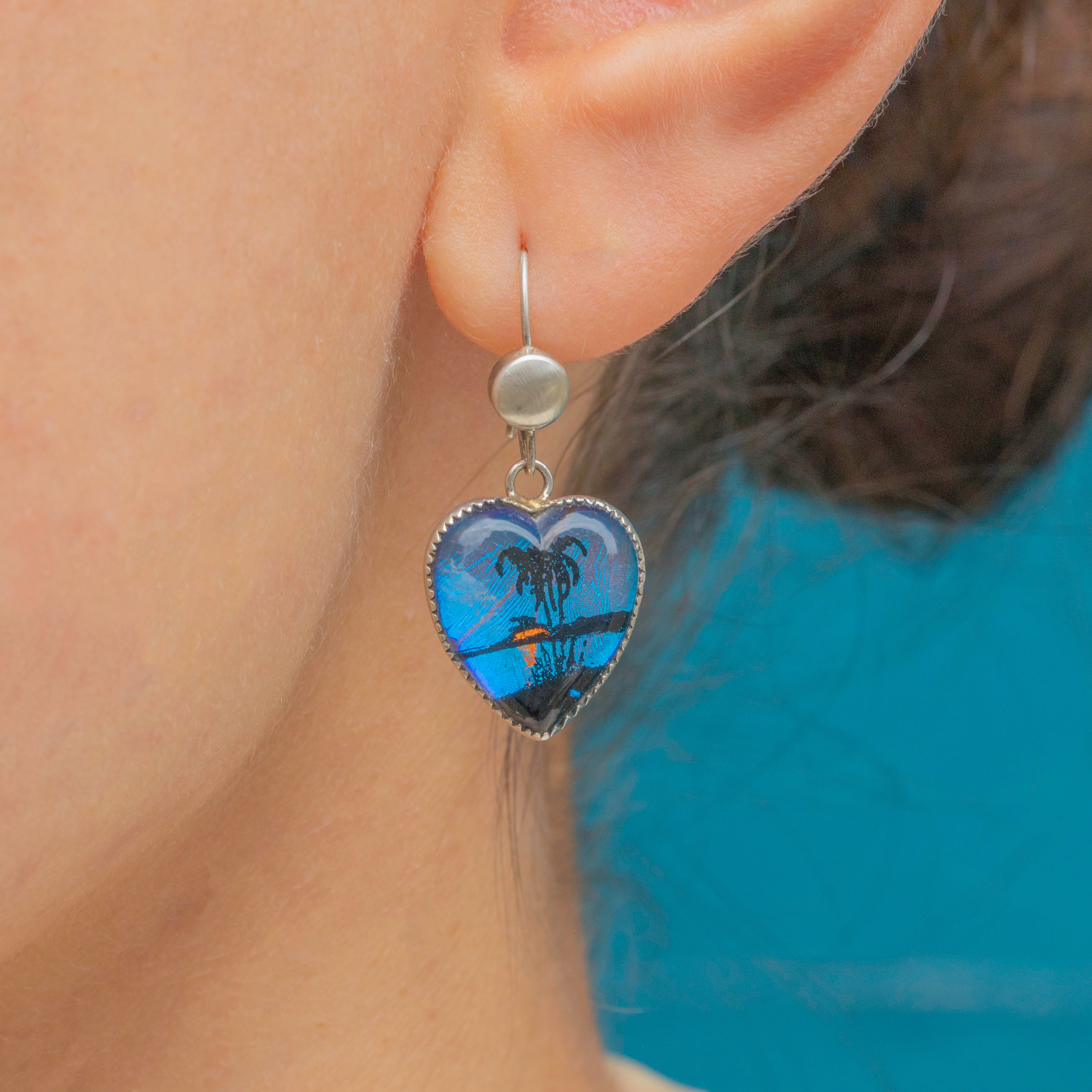 These are a special pair of Art Deco Silver tropical scene butterfly wing heart earrings! Inlaid beneath the island scene are precious Morpho butterfly wings, boasting a beautiful blue luminescence.