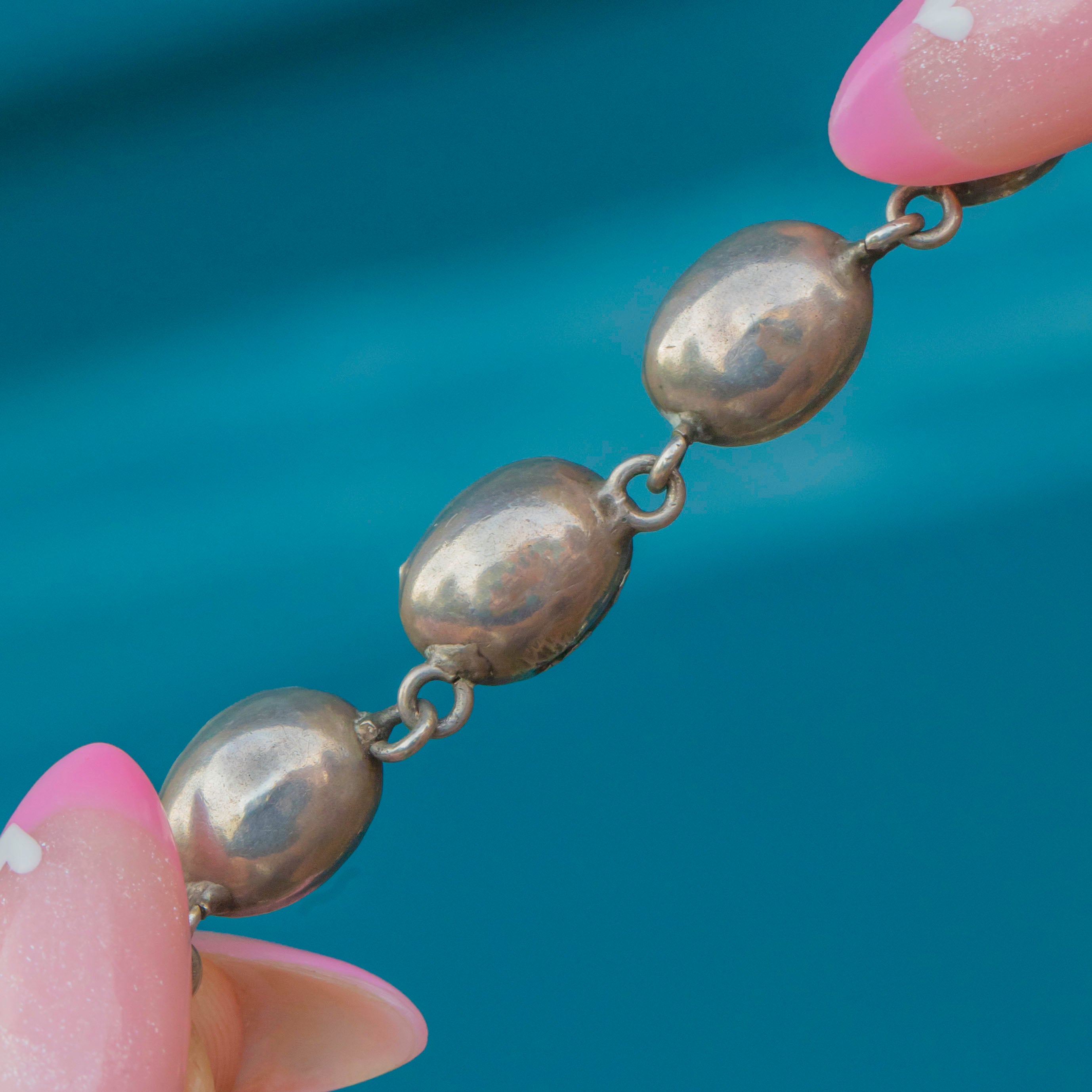 At 15" long, this antique Paste necklace will rest elegantly across your clavicle, perfectly accentuating your neckline. Giving you the option to wear her either way around, you could turn this necklace over and display a row of smooth Silver domes instead!