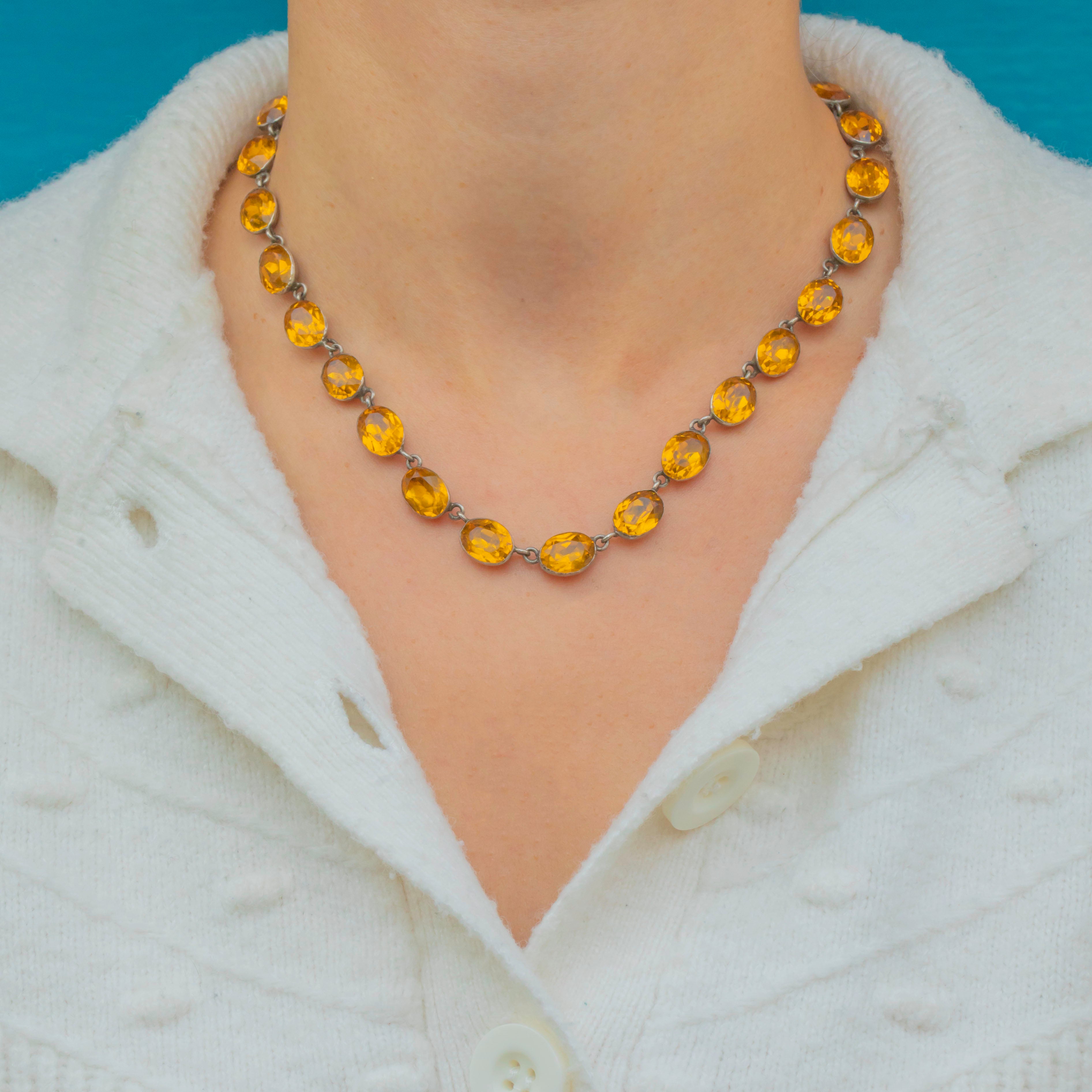 This Art Deco Silver Yellow Paste riviere necklace is resplendent in every way! Emanating lively honeycomb hues, this antique necklace has exquisite yellow foiled Paste gems, akin to the delights of Citrine and Topaz.