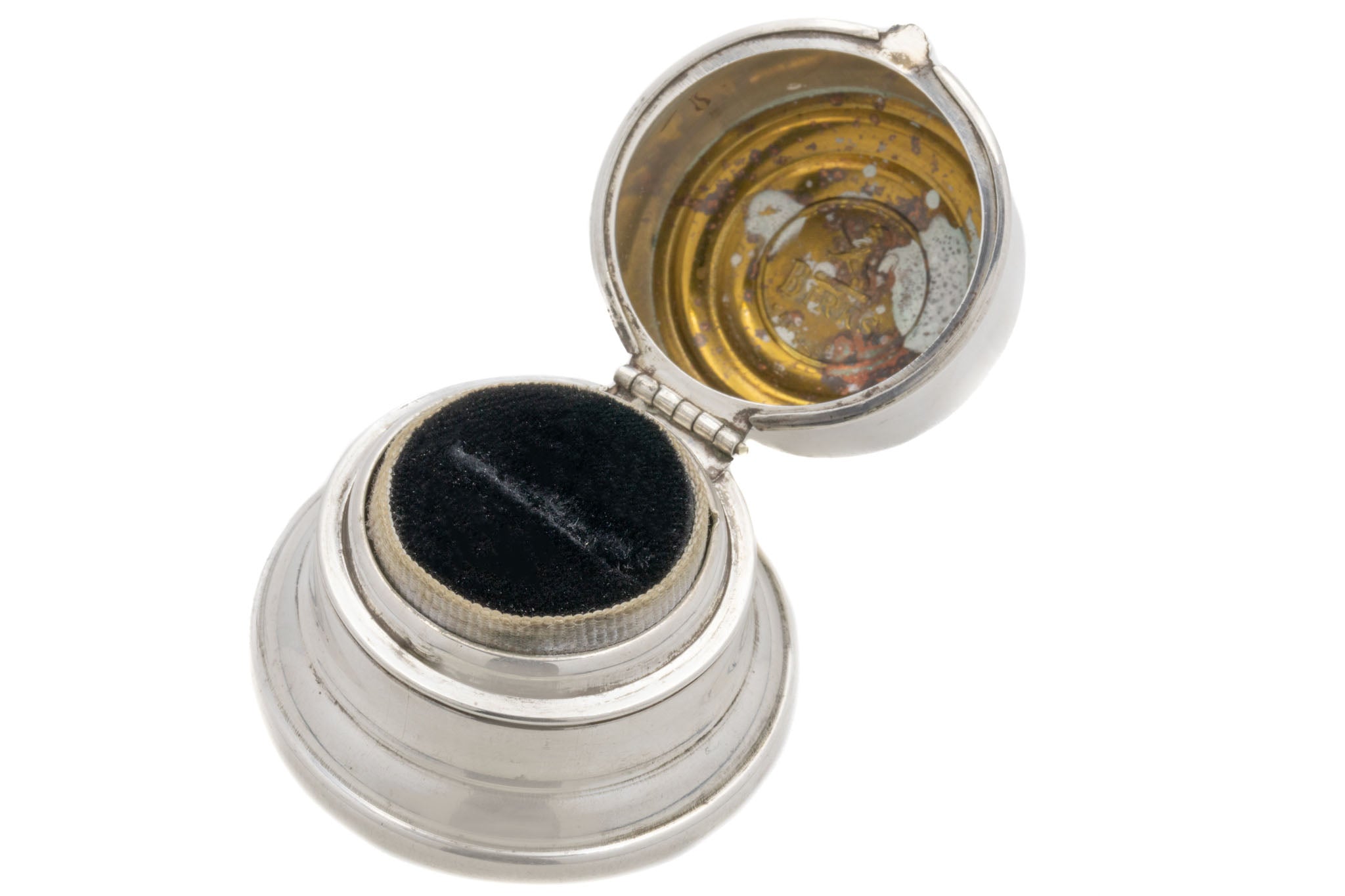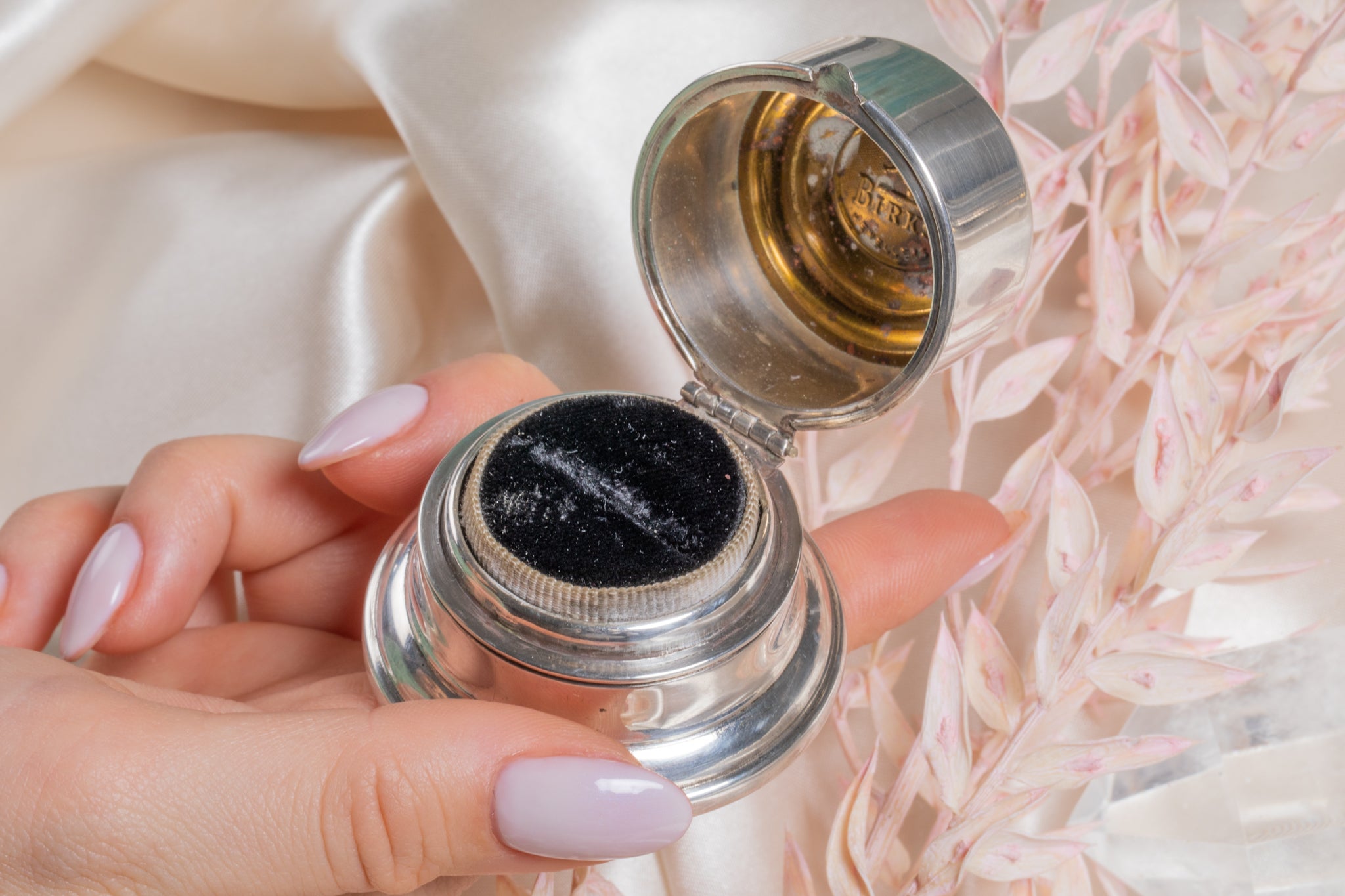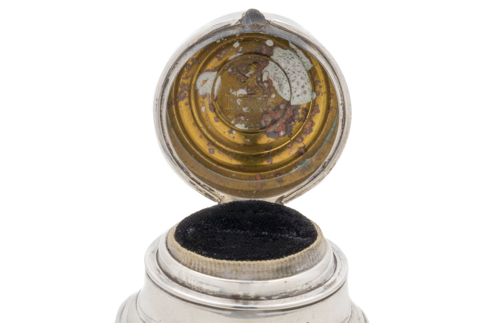 VERY GOOD. This Art Deco Sterling Silver 'Birks' ring box is in very good condition. Her Sterling Silver has got a beautiful luster, with only a few darkened spots on her underside. The hinge mechanism is in great working order and with her lid closing with a 'click', you can keep your chosen ring safely inside. When opened there is some rusting to the inside of her lid and the white ribbon has some staining, commensurate with age, but this does not detract from her overall beauty. She is the perfect part of history to bring into your future!