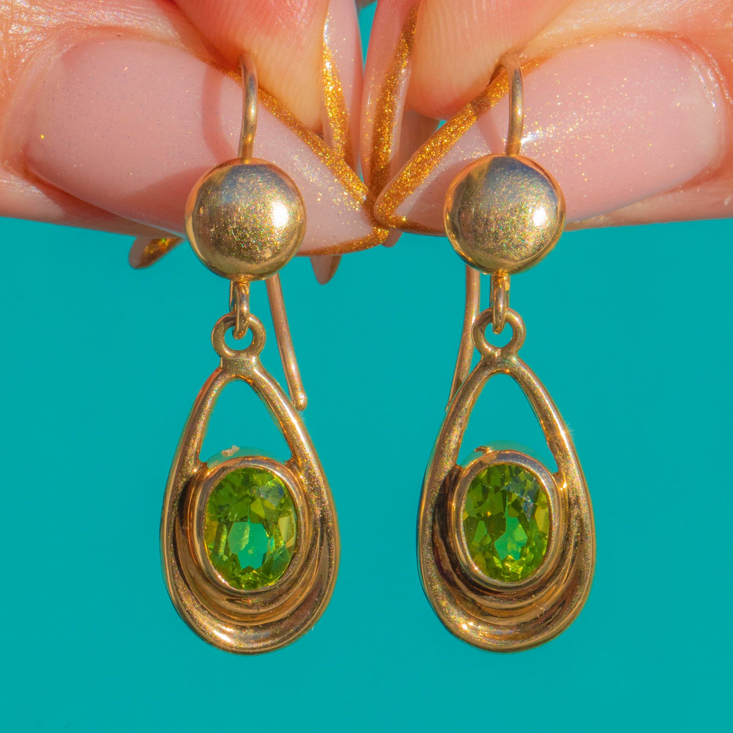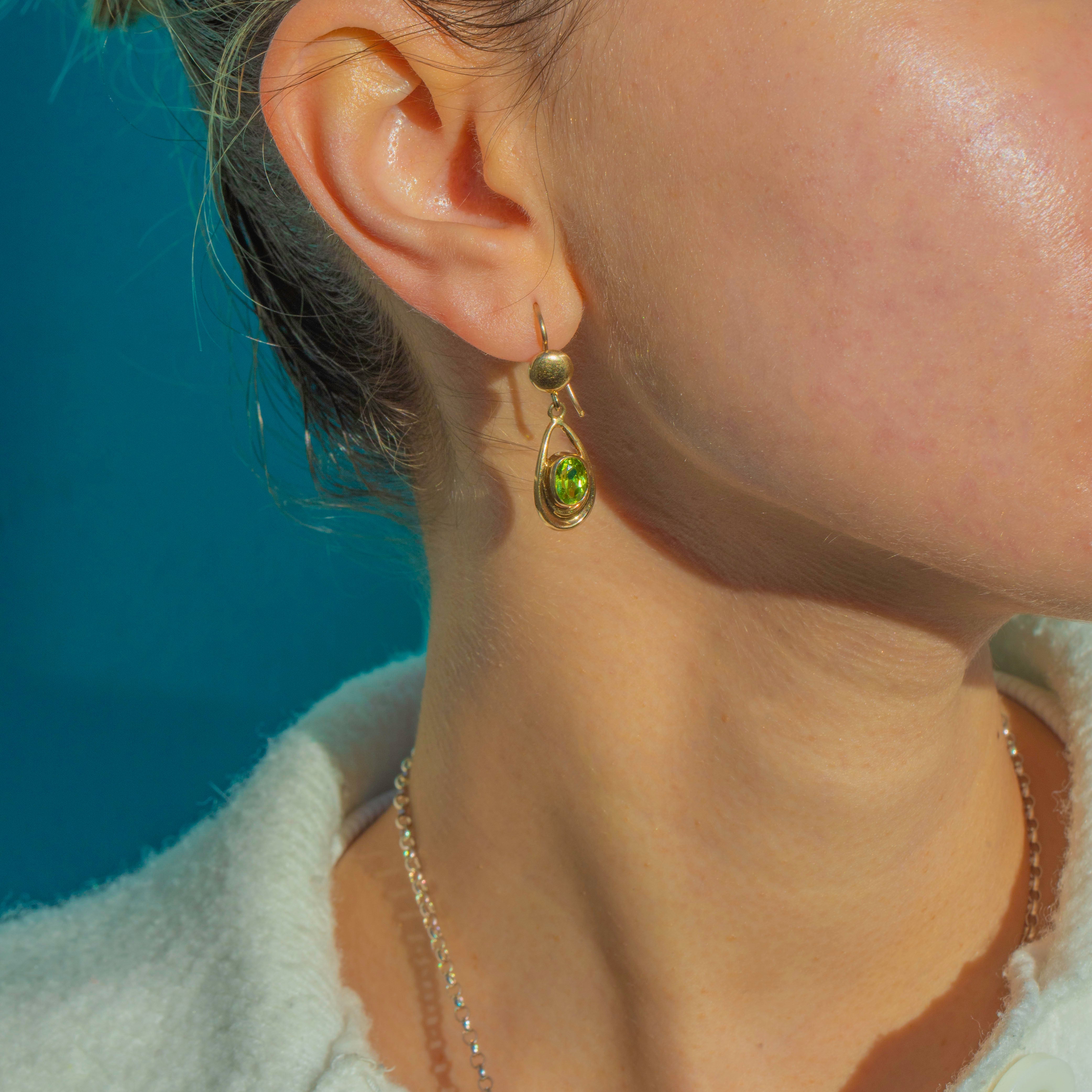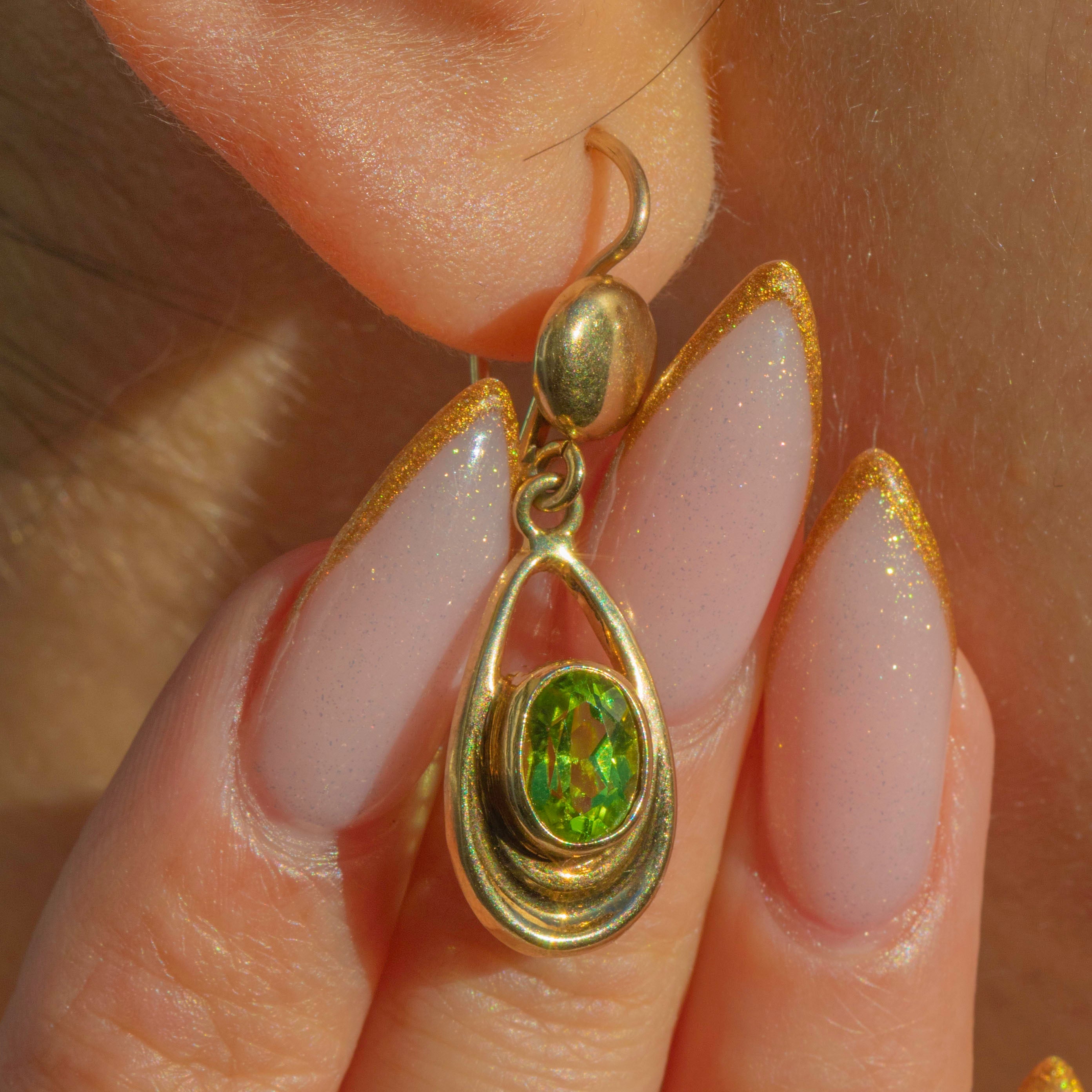 These dreamy Art Nouveau drop earrings are all about movement, line and luminous colour. Crafted in rich 14ct Gold, each earring features an open teardrop frame that curves gracefully around a vivid green Peridot, creating that soft, organic silhouette the era is so loved for.