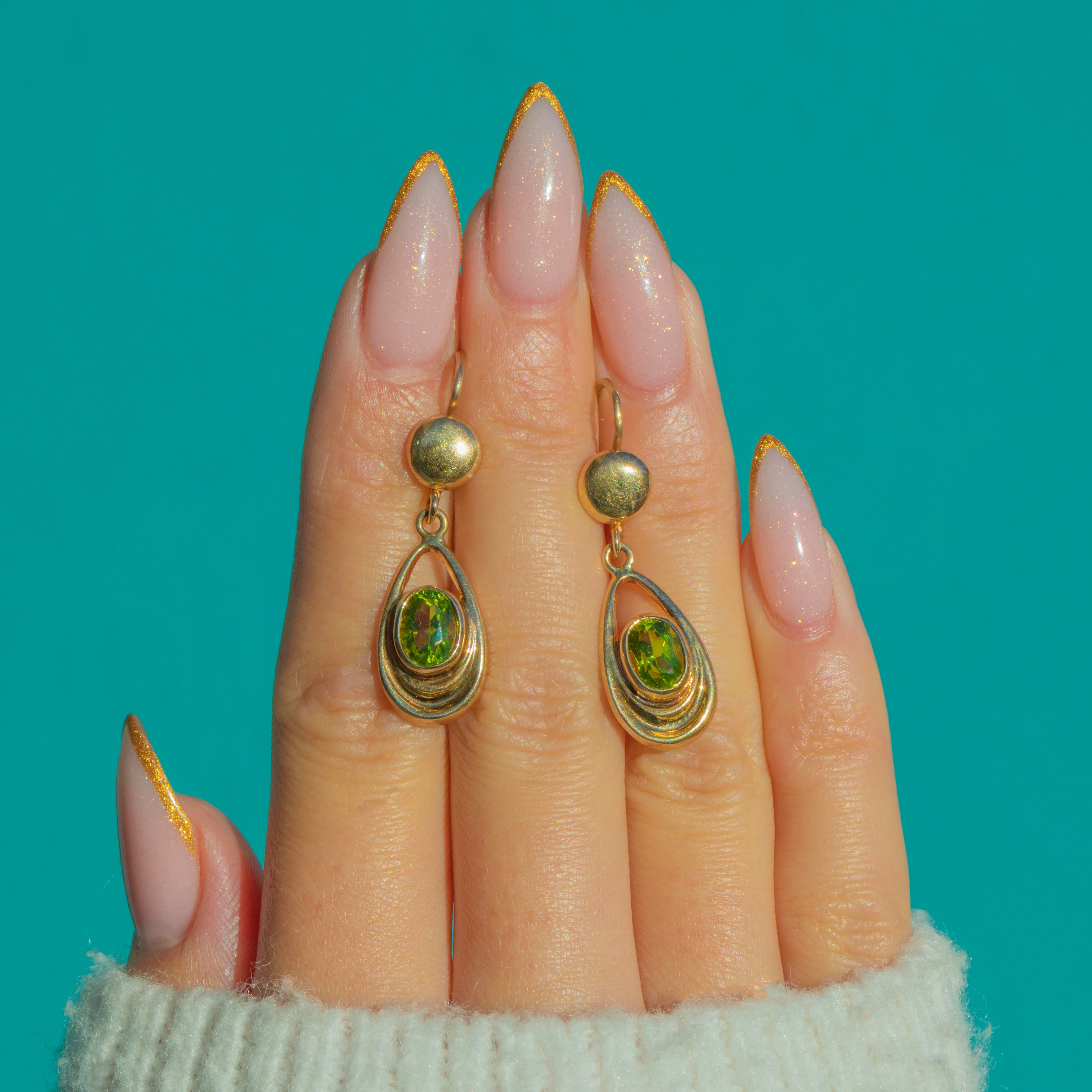These dreamy Art Nouveau drop earrings are all about movement, line and luminous colour. Crafted in rich 14ct Gold, each earring features an open teardrop frame that curves gracefully around a vivid green Peridot, creating that soft, organic silhouette the era is so loved for.