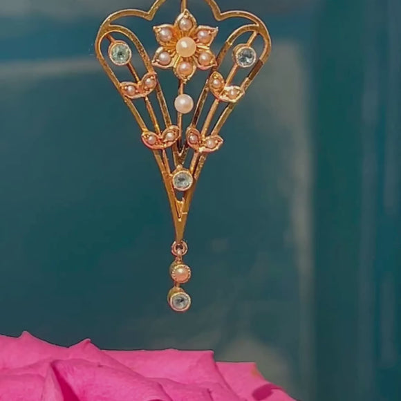 Art Nouveau 18ct Gold Aquamarine Pearl Drop Pendant