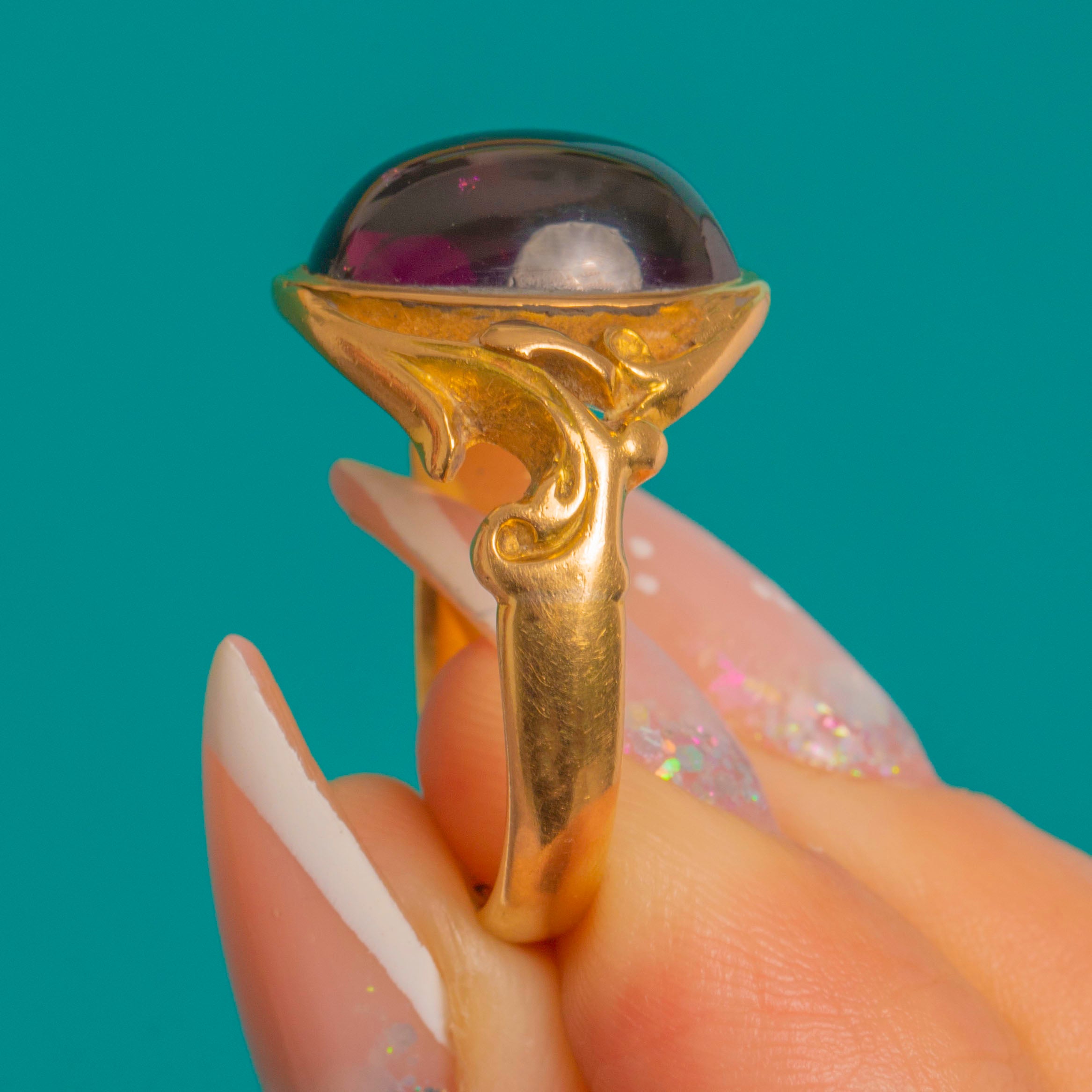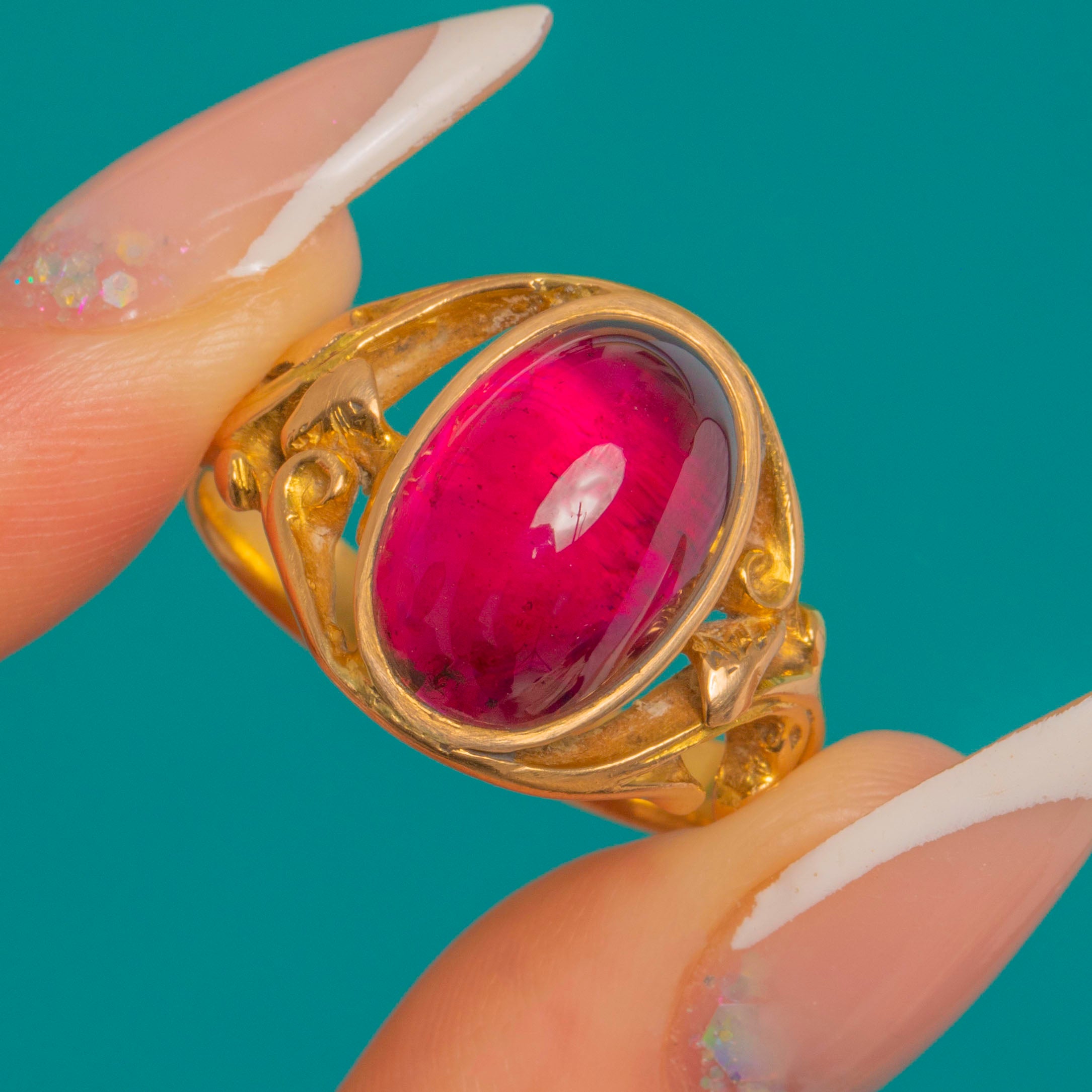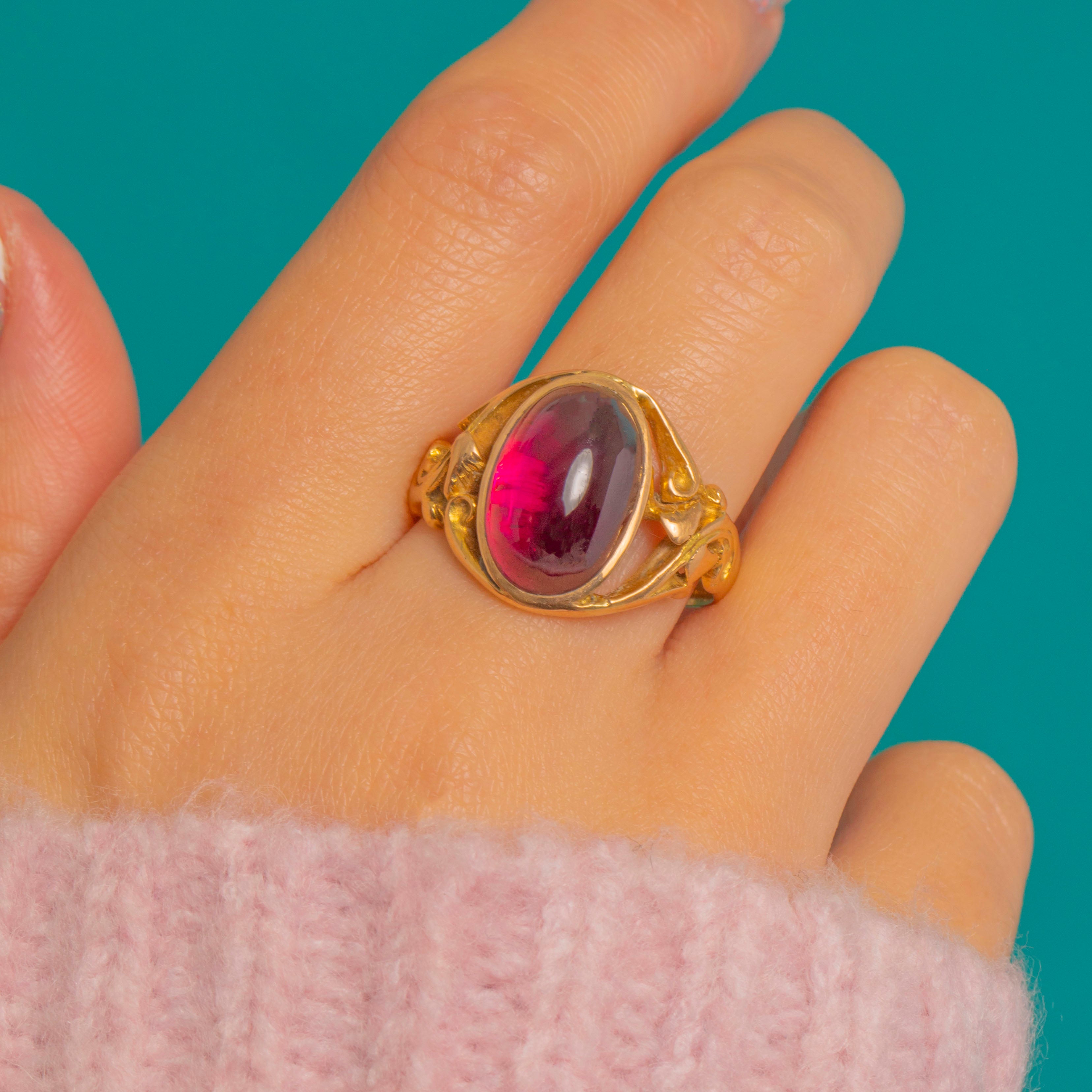 Sculptural and romantic, this Art Nouveau ring showcases a high-domed oval Garnet cabochon wrapped in a smooth bezel of glowing 18ct Gold. The gemstone dazzles with deep raspberry-to-red‑purple tones, while the flowing openwork shoulders unfurl in whiplash foliate scrolls with delicate bead accents—bold yet elegant from every angle.