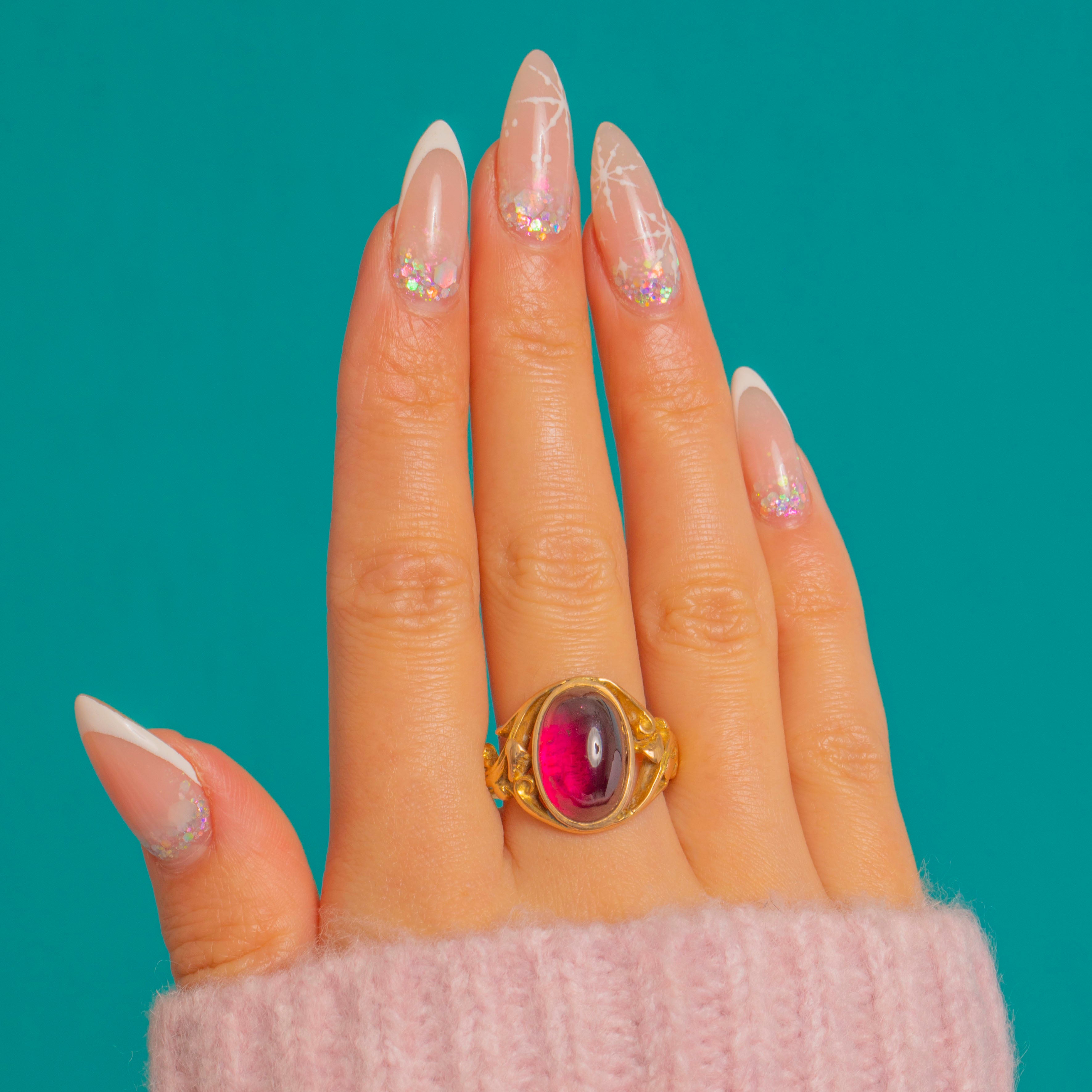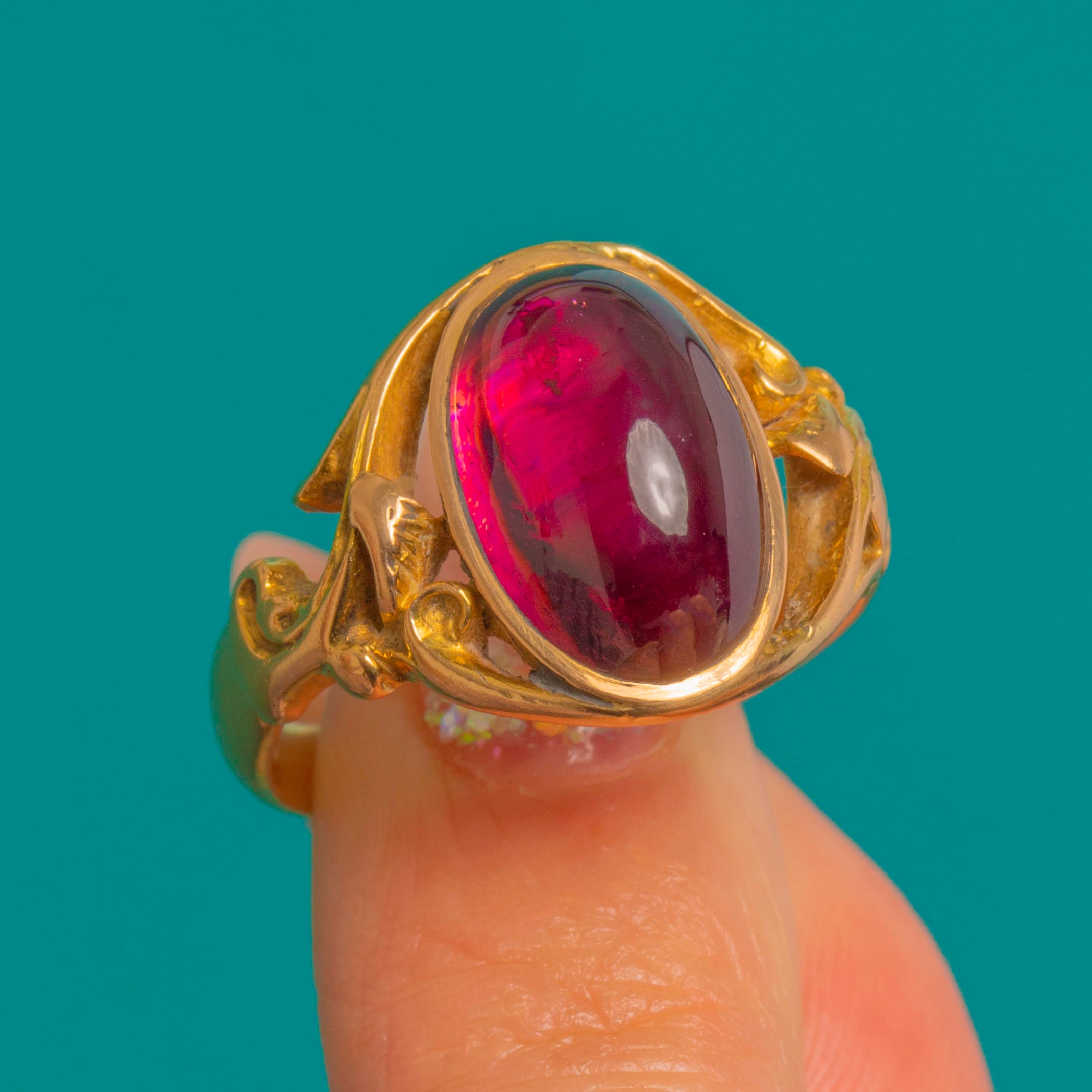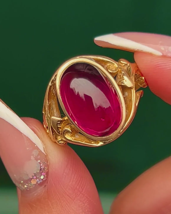 Sculptural and romantic, this Art Nouveau ring showcases a high-domed oval Garnet cabochon wrapped in a smooth bezel of glowing 18ct Gold. The gemstone dazzles with deep raspberry-to-red‑purple tones, while the flowing openwork shoulders unfurl in whiplash foliate scrolls with delicate bead accents—bold yet elegant from every angle.