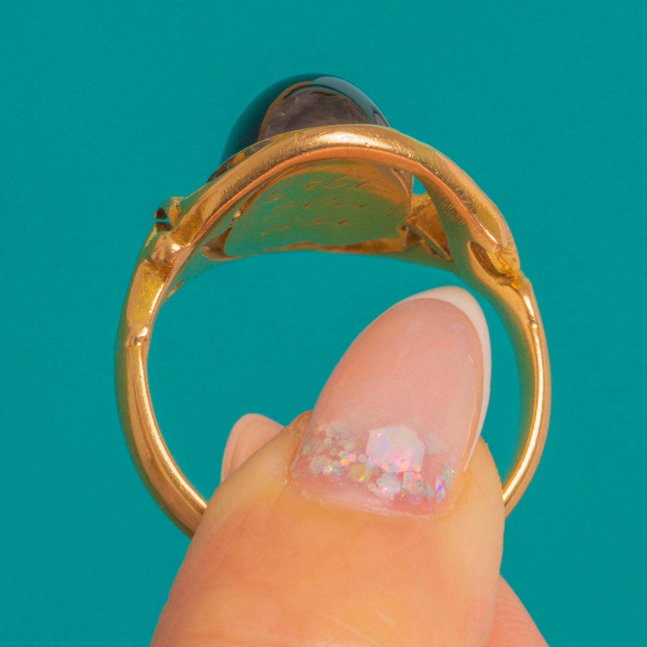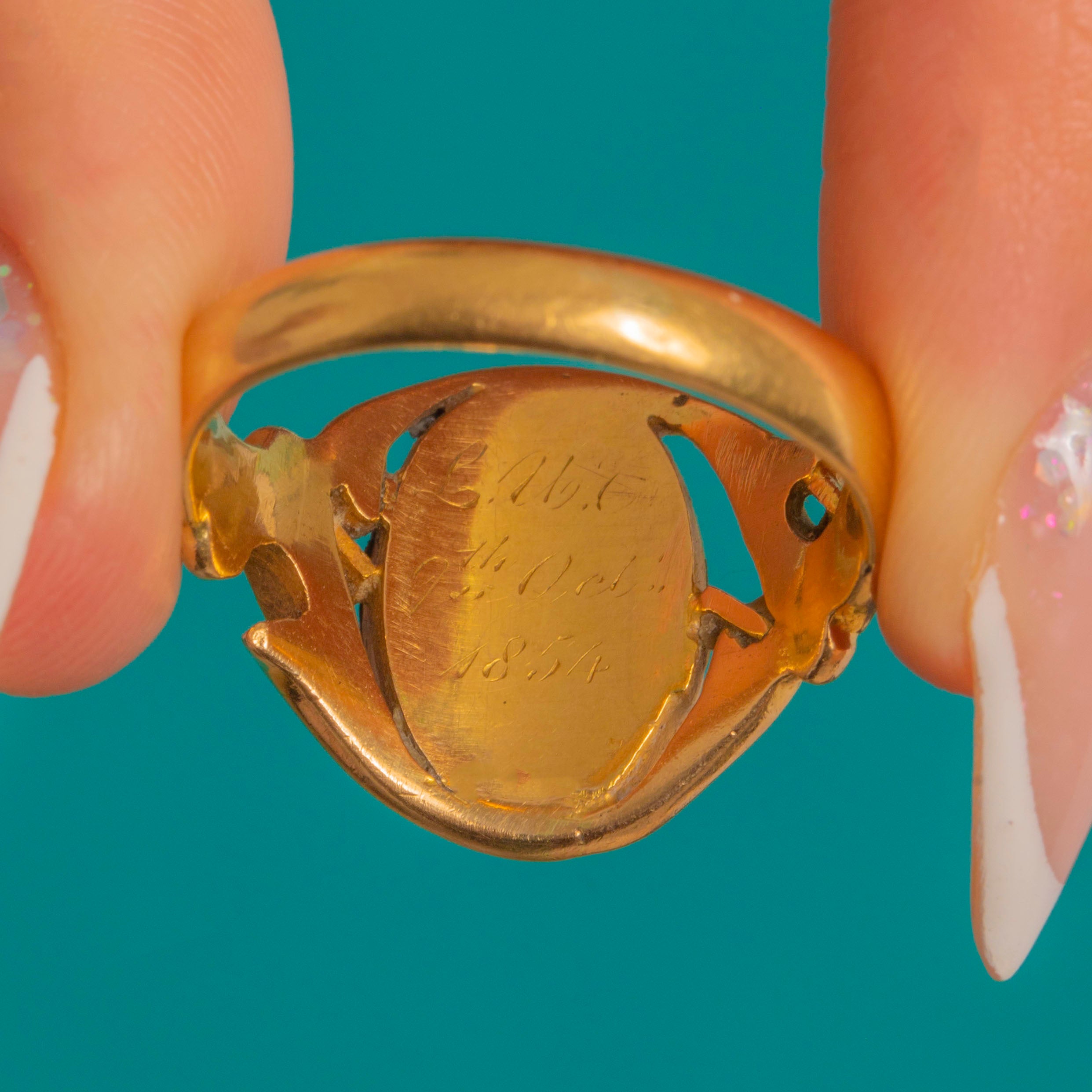 The closed back setting enhances the saturated colour, and a hand-engraved plaque carries worn initials and the date 9th Oct 1854, adding a charming personal history. With an “18ct” stamp to the inner band and a satisfying 8.2g in weight, this is a luxurious, characterful statement ring that wears beautifully.