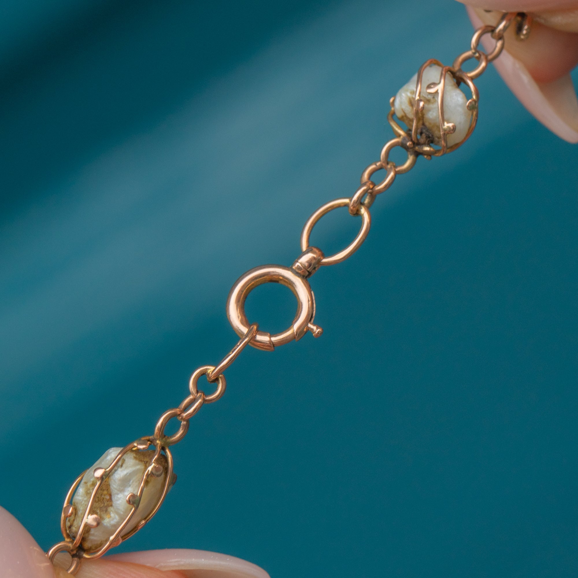 This Art Nouveau 9ct Gold necklace showcases a graceful arrangement of Matrix Turquoise and Baroque Pearls, beautifully graduating in size along the 16" chain.