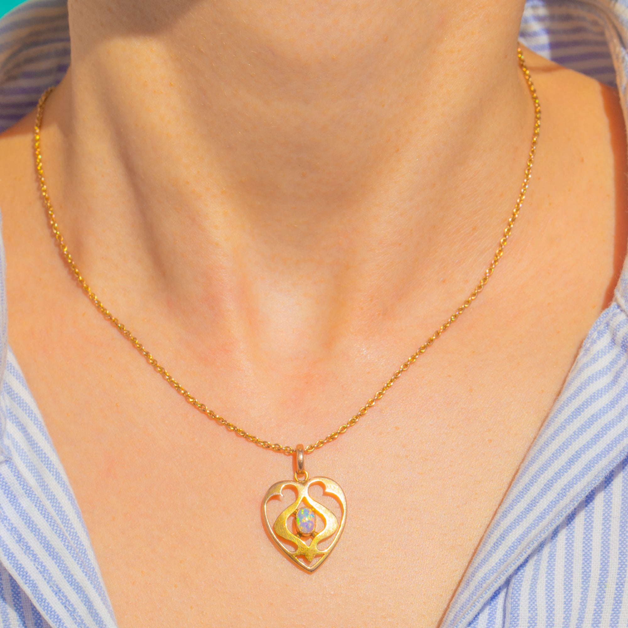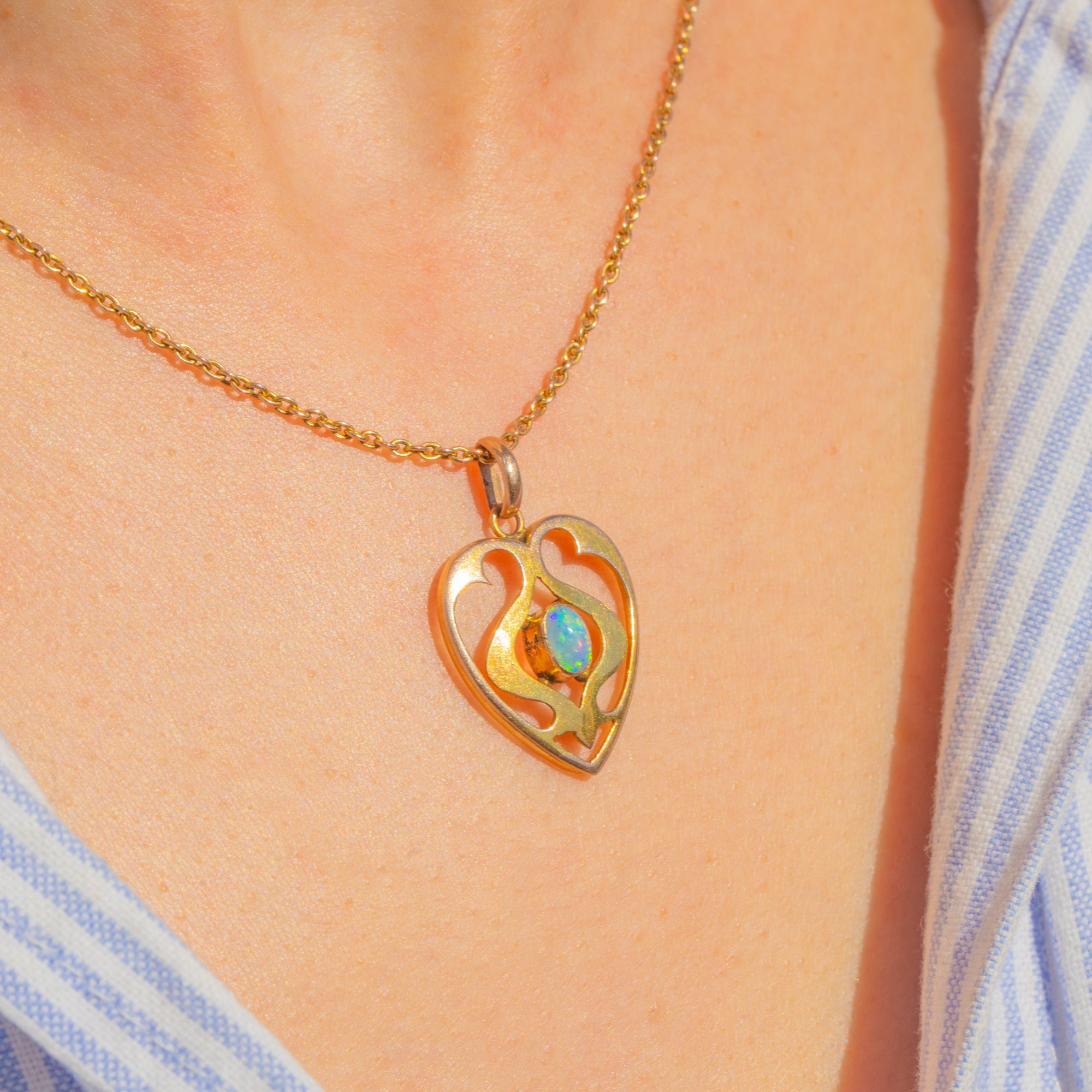 Art Nouveau 9ct Gold Opal Openwork Heart Pendant