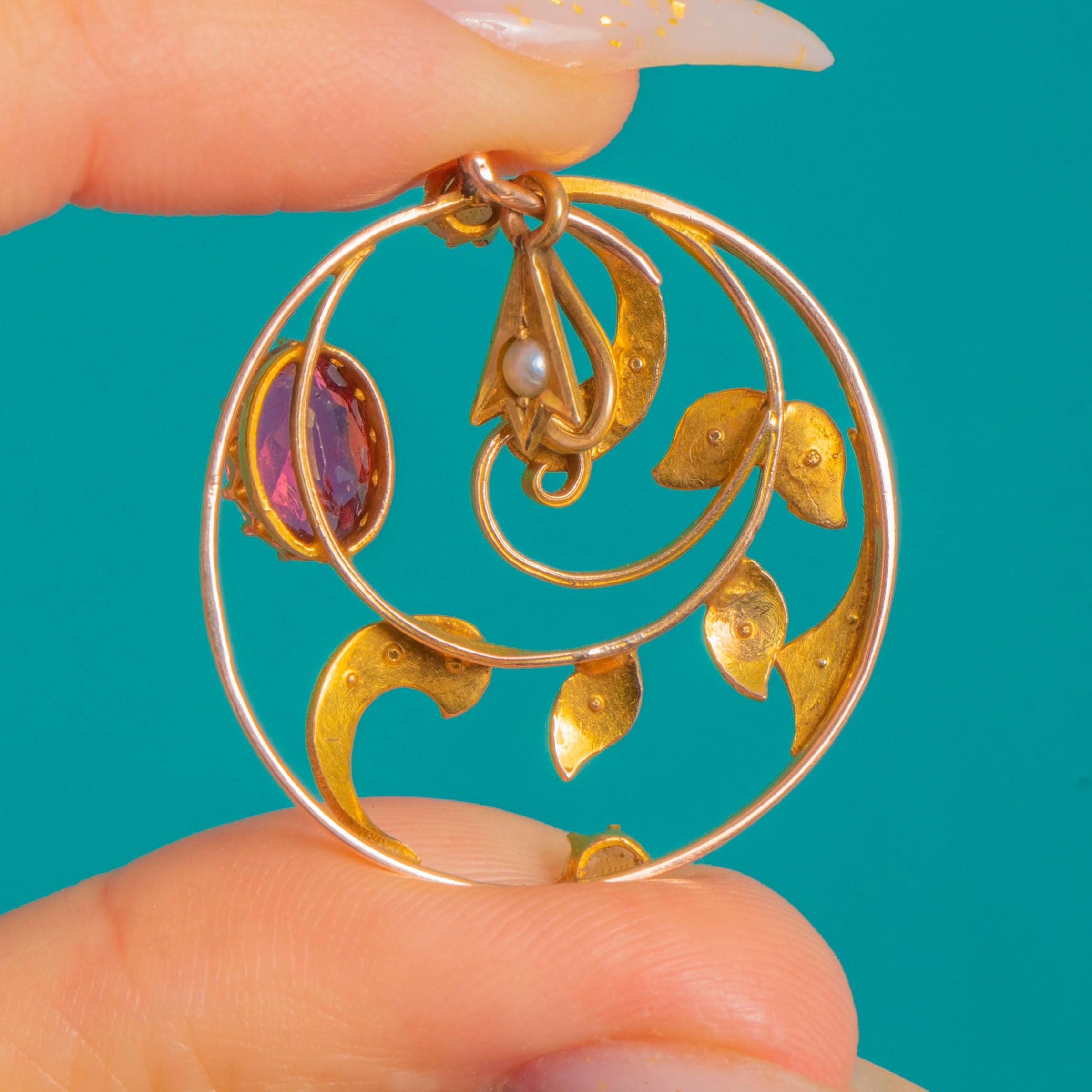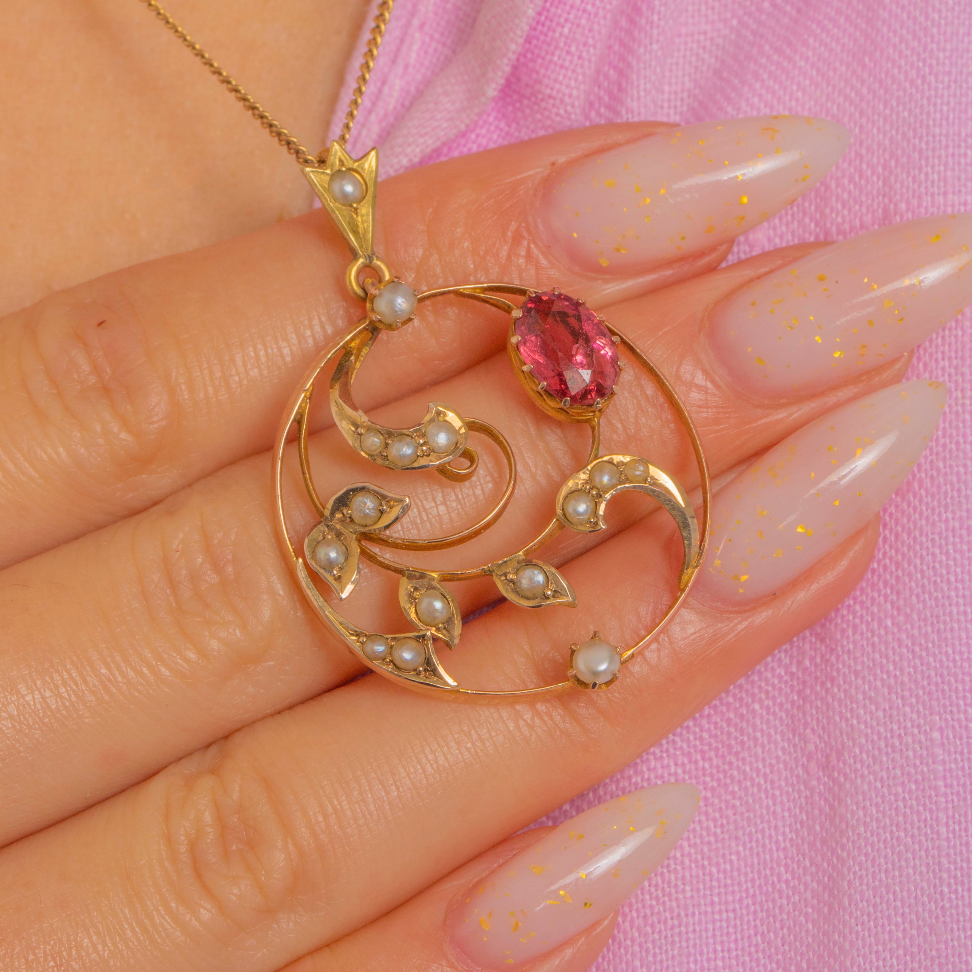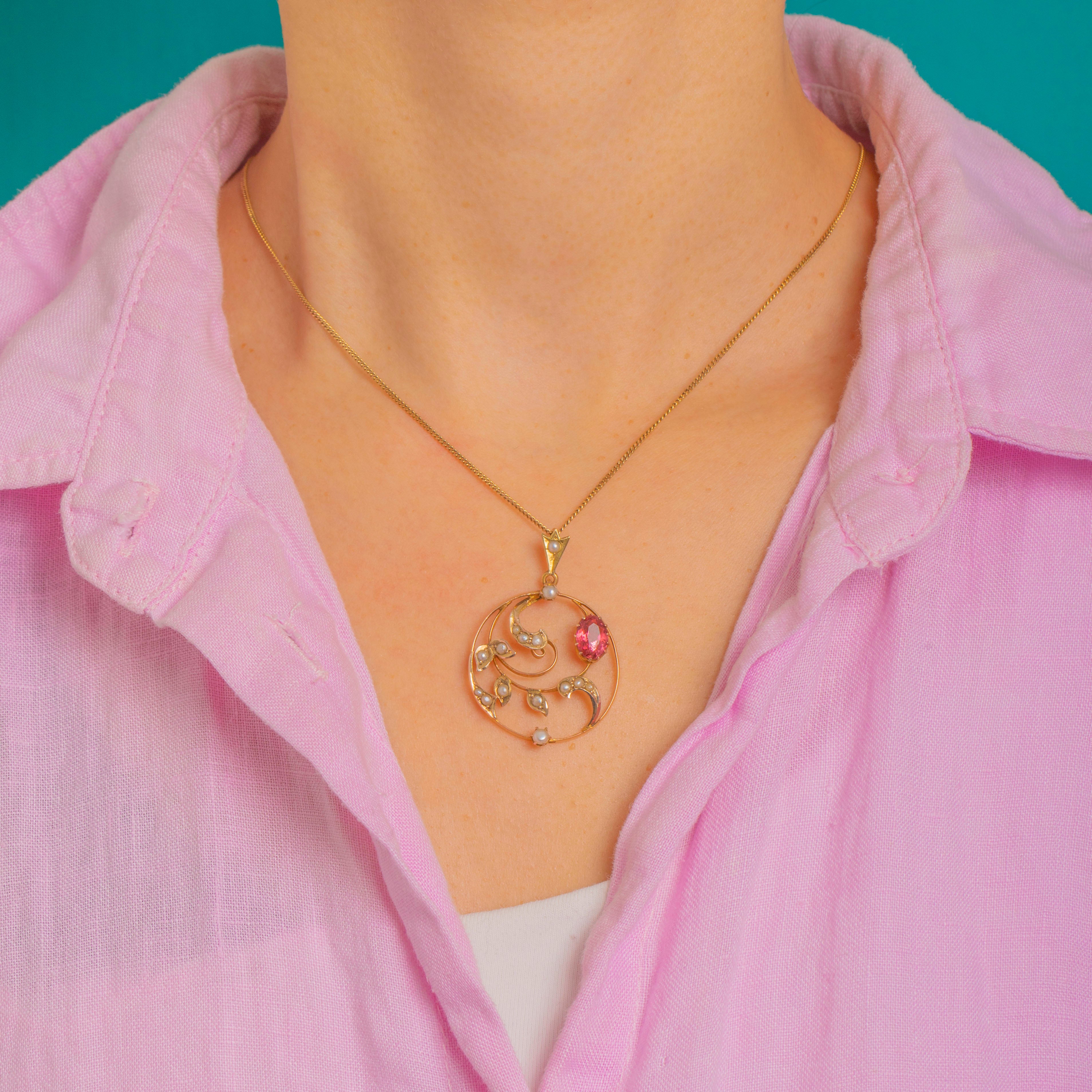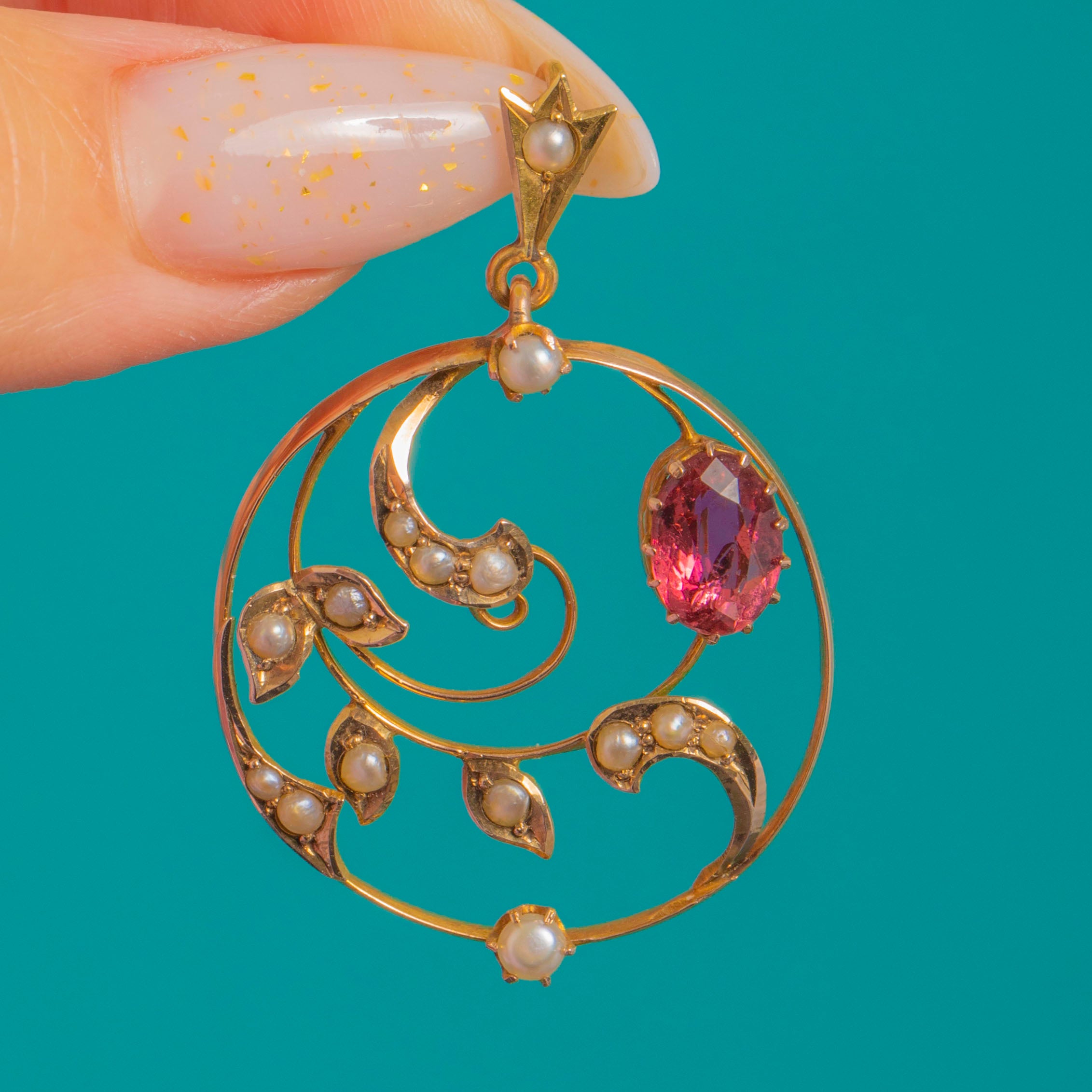 A poetic jewel from the Art Nouveau era, this 9ct Gold pendant traces an airy circle of sinuous whiplash scrolls and delicate foliate accents, punctuated by glimmering Pearls. At its heart sits an offset oval Peach Tourmaline, its warm hue glowing against the rich yellow Gold and creamy Pearls for a look that feels both romantic and refined.