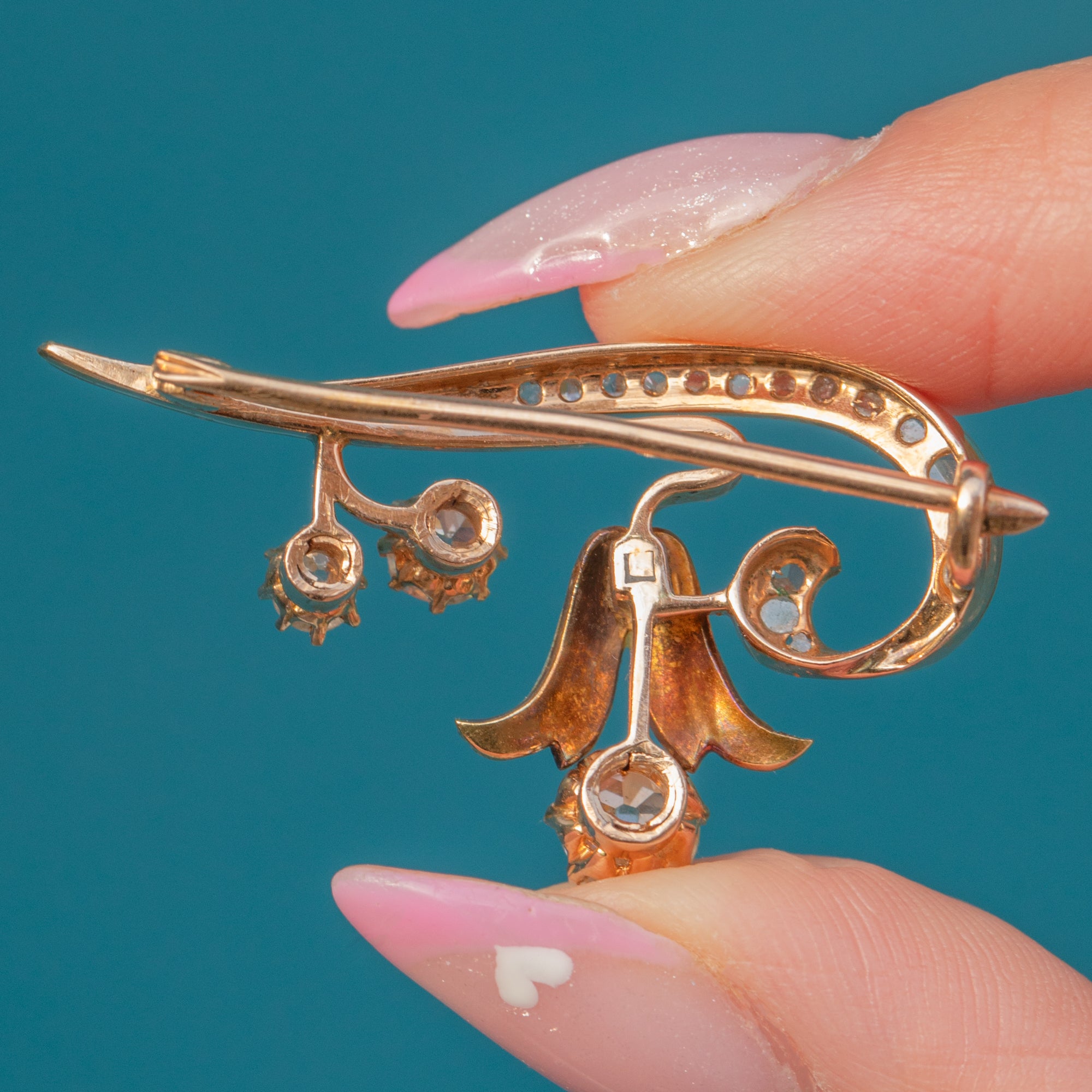 This exquisite Art Nouveau brooch captures the organic beauty and femininity of the early 20th century. Crafted in rich 15ct Gold, the brooch features delicate green enamel accents and glistening old-cut Diamonds arranged in a softly curving, floral-inspired design.