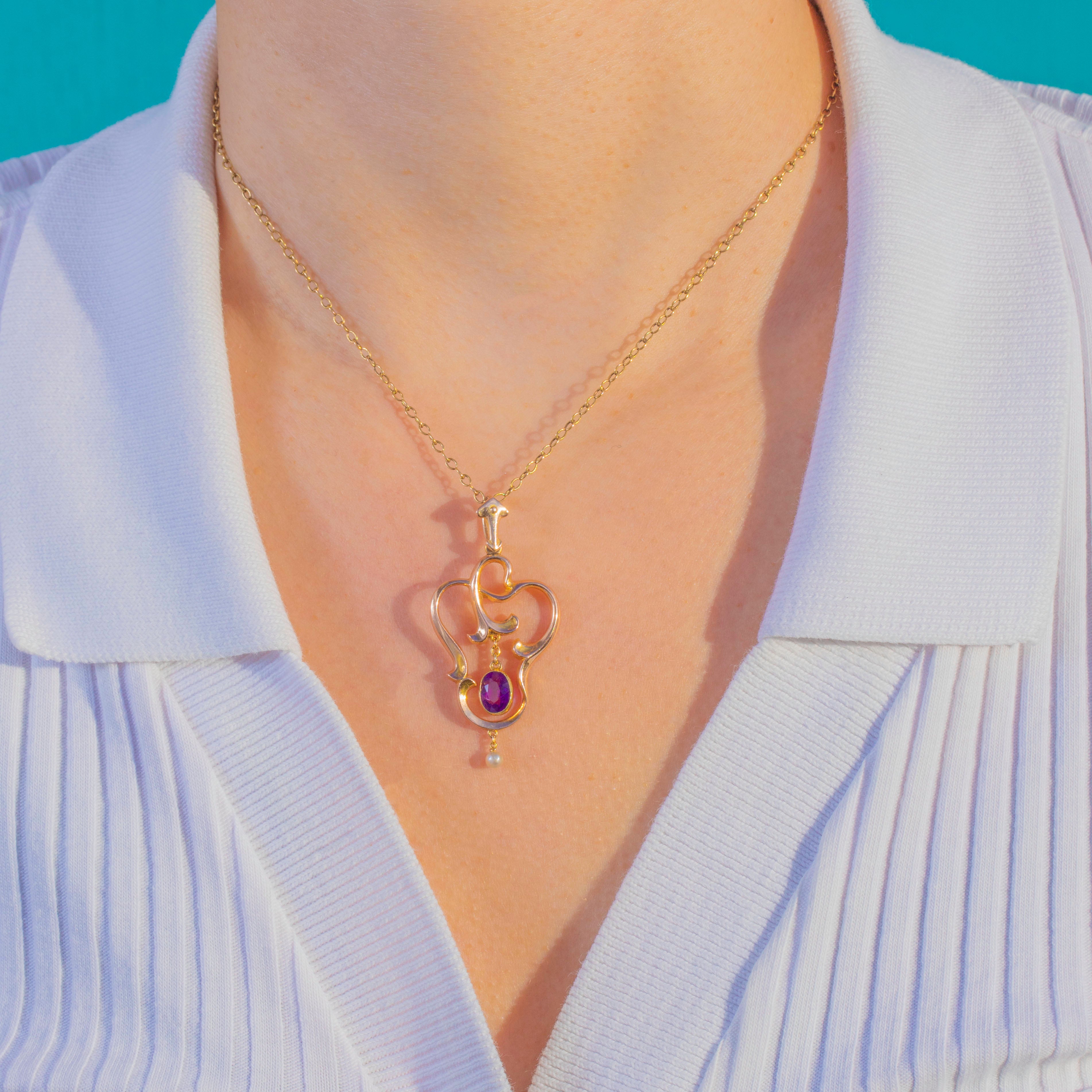 Sinuous, whiplash curves and airy openwork define this elegant Art Nouveau lavalier. Crafted in 9ct Gold, the flowing lines frame a vivid oval Amethyst held in a smooth bezel, allowing the stone to shimmer and sway with the light.