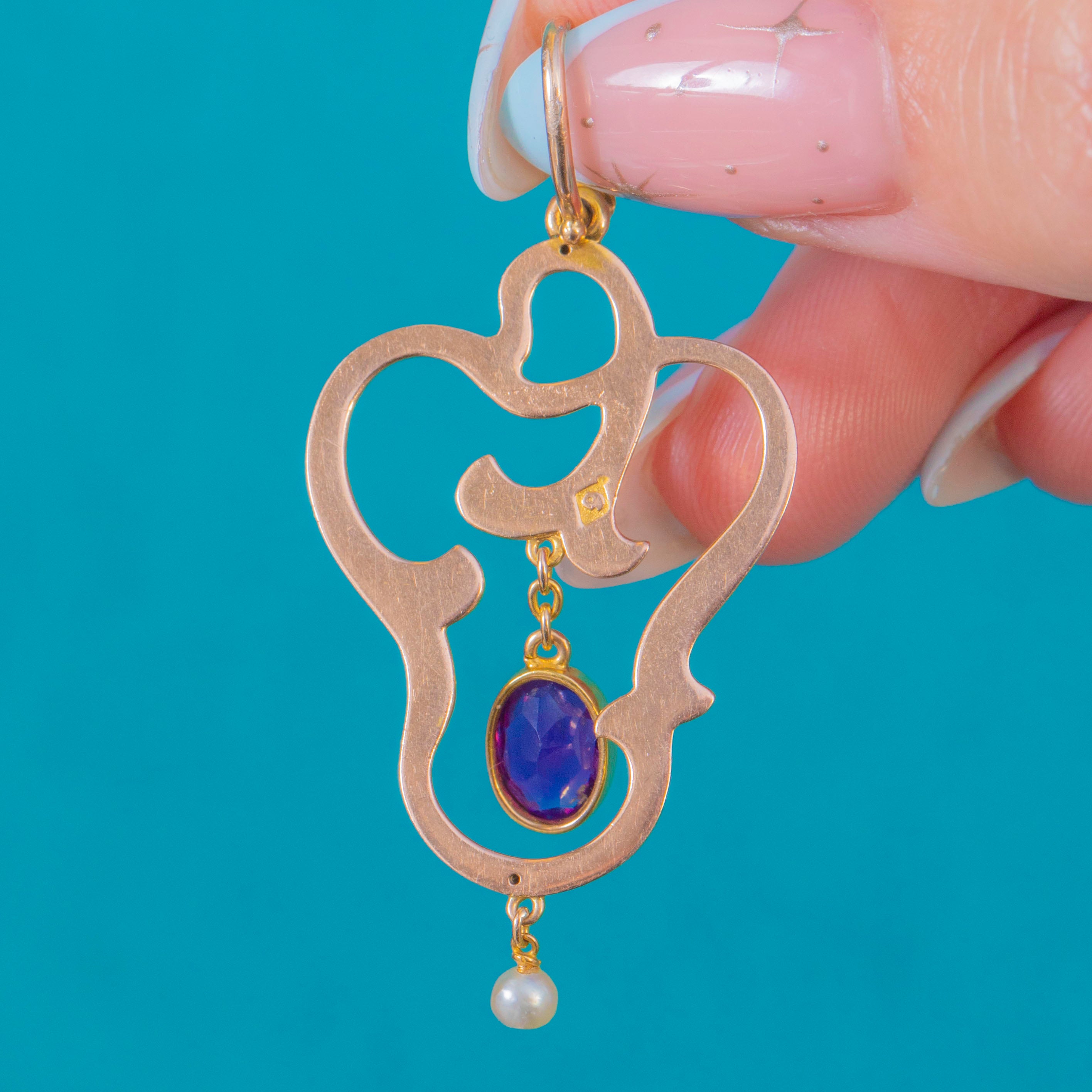 Art Nouveau Era 9ct Gold Amethyst Pearl Drop Pendant