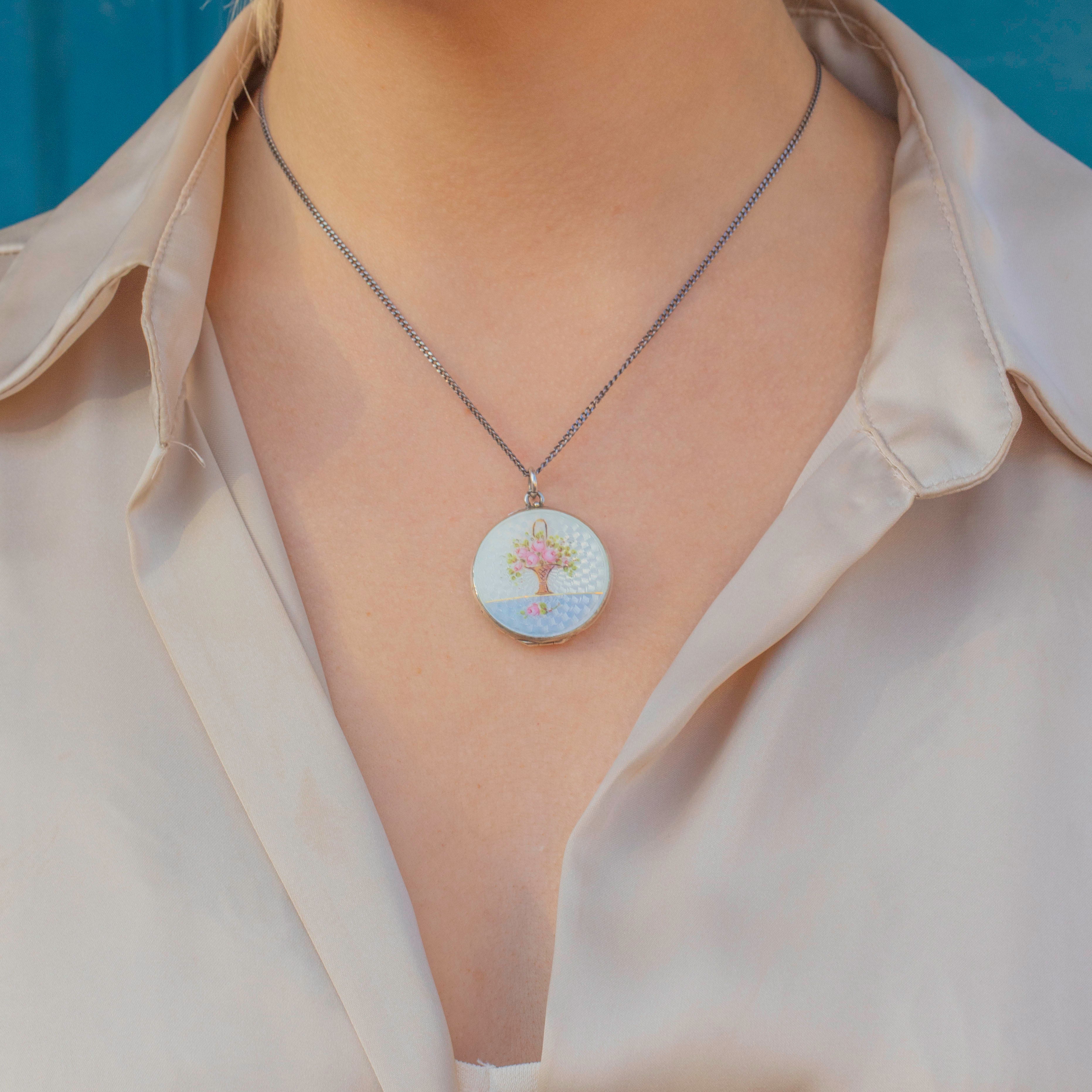 This exquisitely crafted Art Nouveau Guilloche Enamel bouquet of flowers locket will make a romantic addition to your collection! Both the front and back of this antique locket display Guilloche Enamel, a technique combining mechanical engravings with Enamels to create a decorative surface. The geometric patterns catch the light sending mesmerising shimmers cascading across its smooth surfaces.