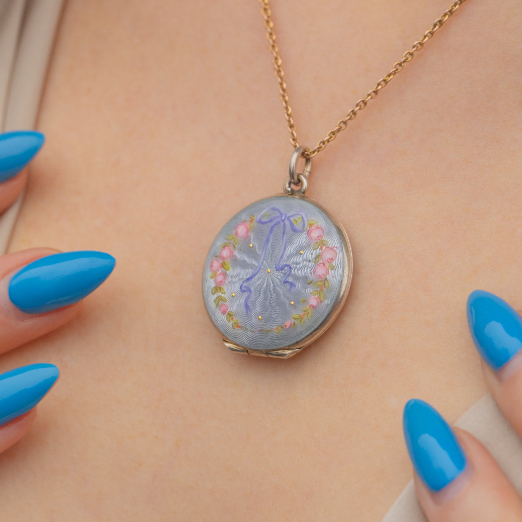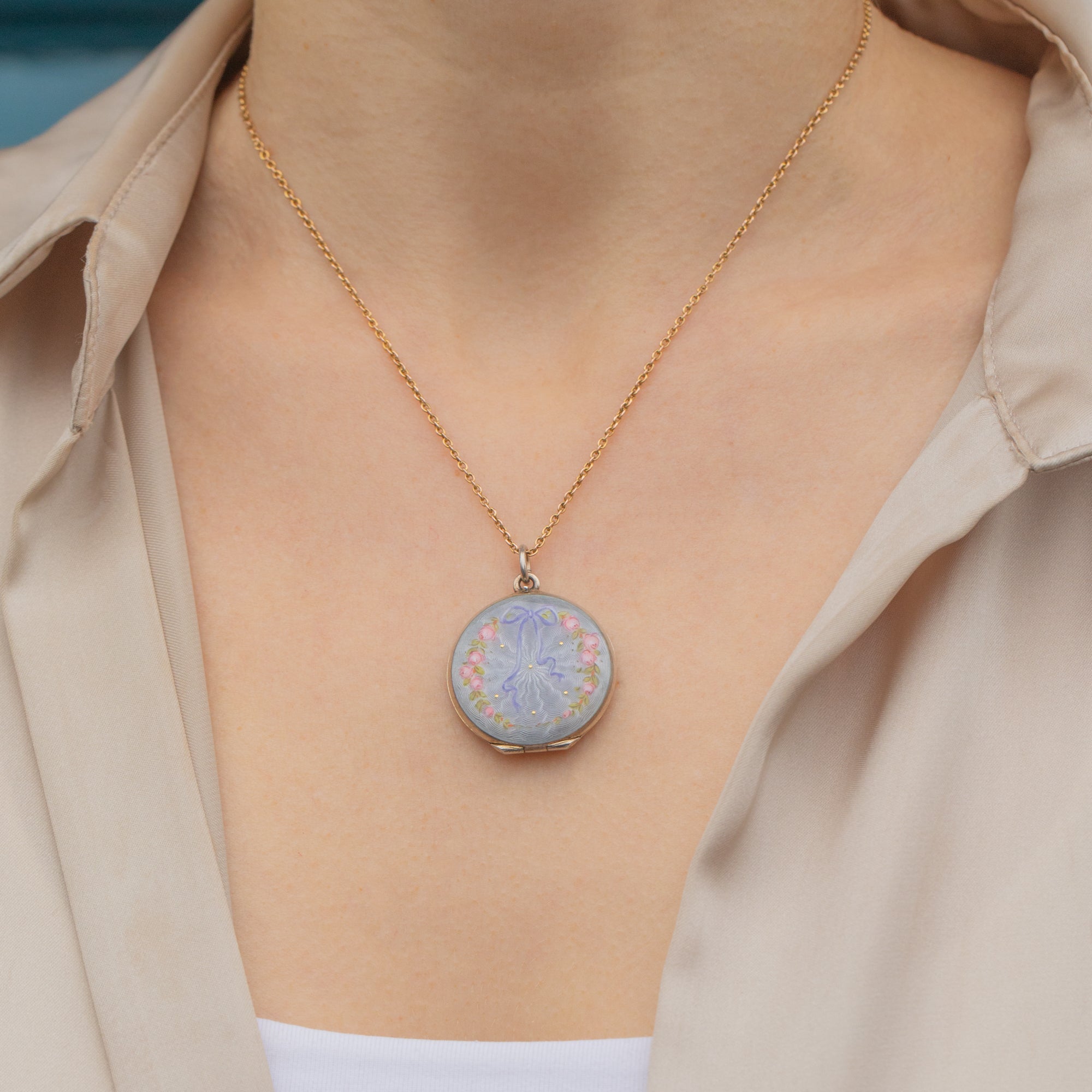 Art Nouveau Guilloche Enamel Locket with Ribbon & Roses