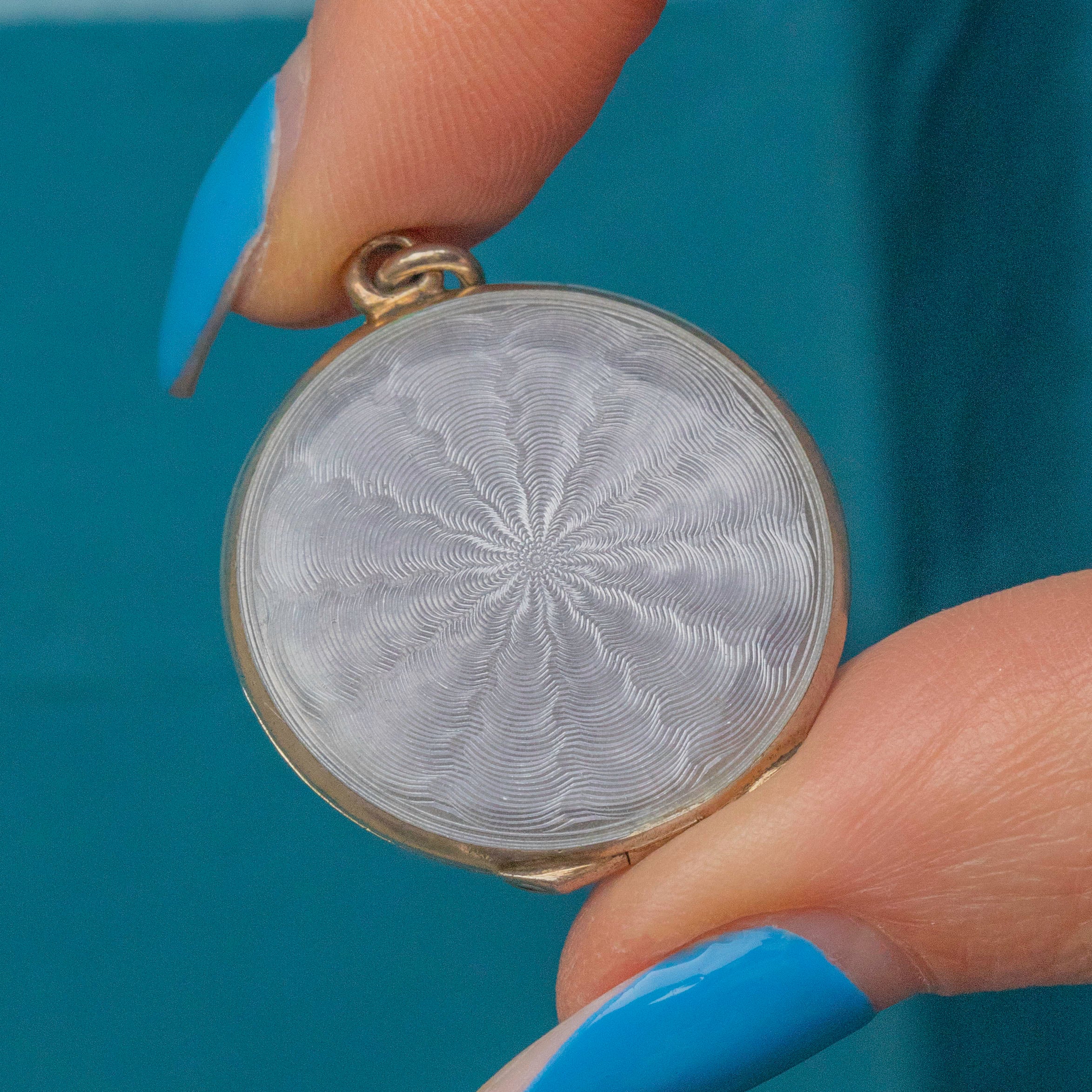 This Art Nouveau Silver Guilloche Enamel locket is incredibly charming! Her shimmering powder blue wave pattern radiates from her intricate surface, and is accented by twinkling golden Enamel beads, captivating anyone who lays eyes on her.