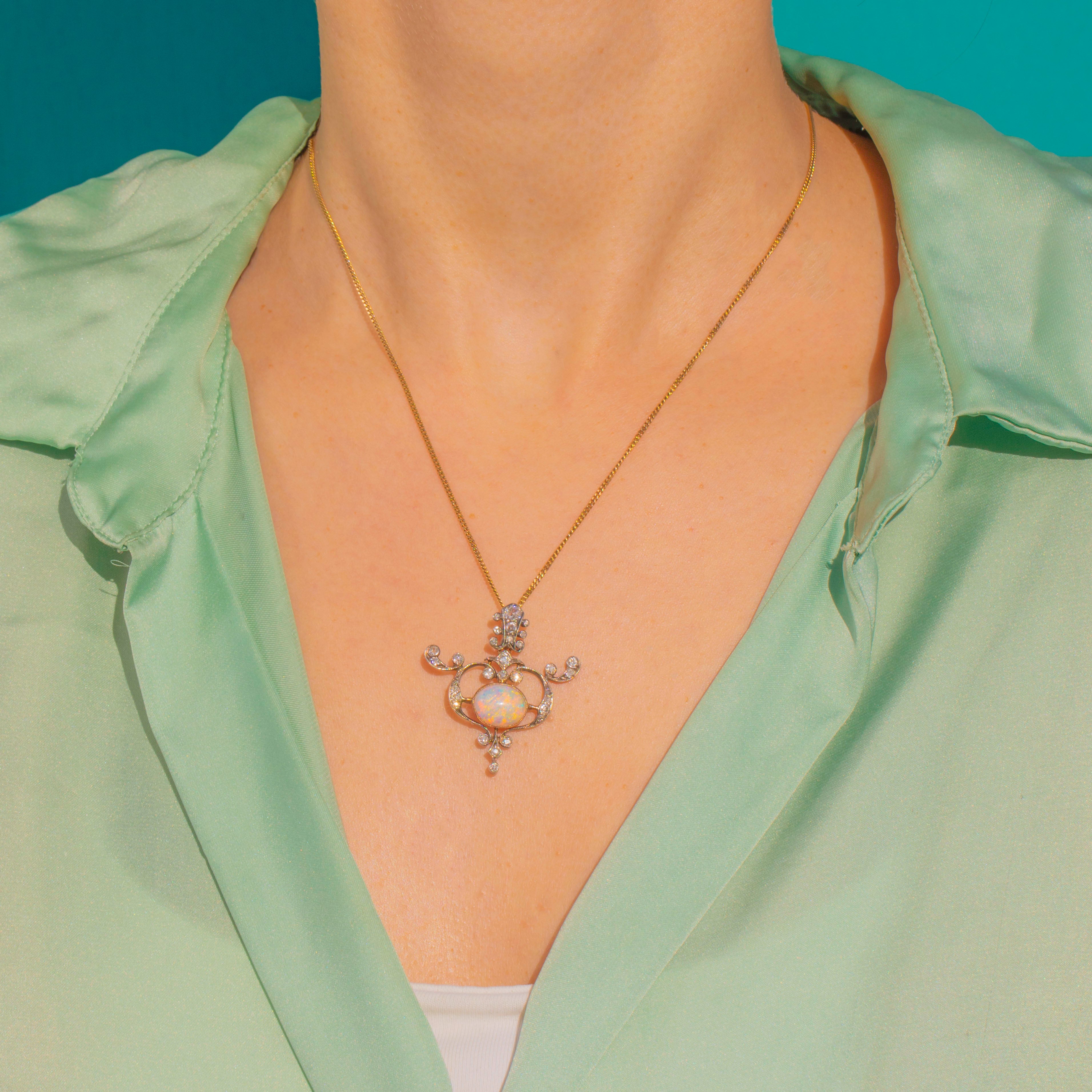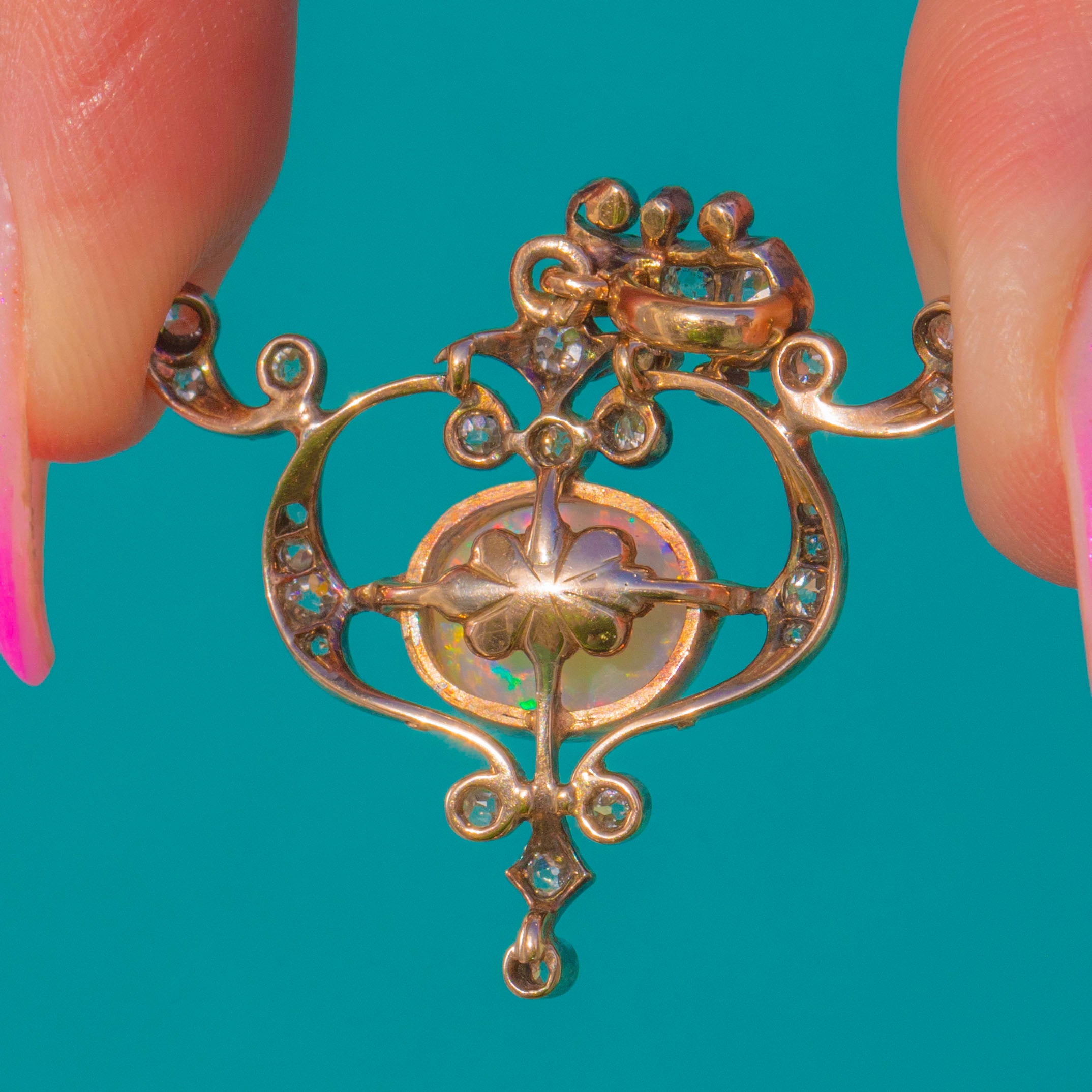 Art Nouveau Opal Diamond Pendant, 1.60ct Natural Solid Opal