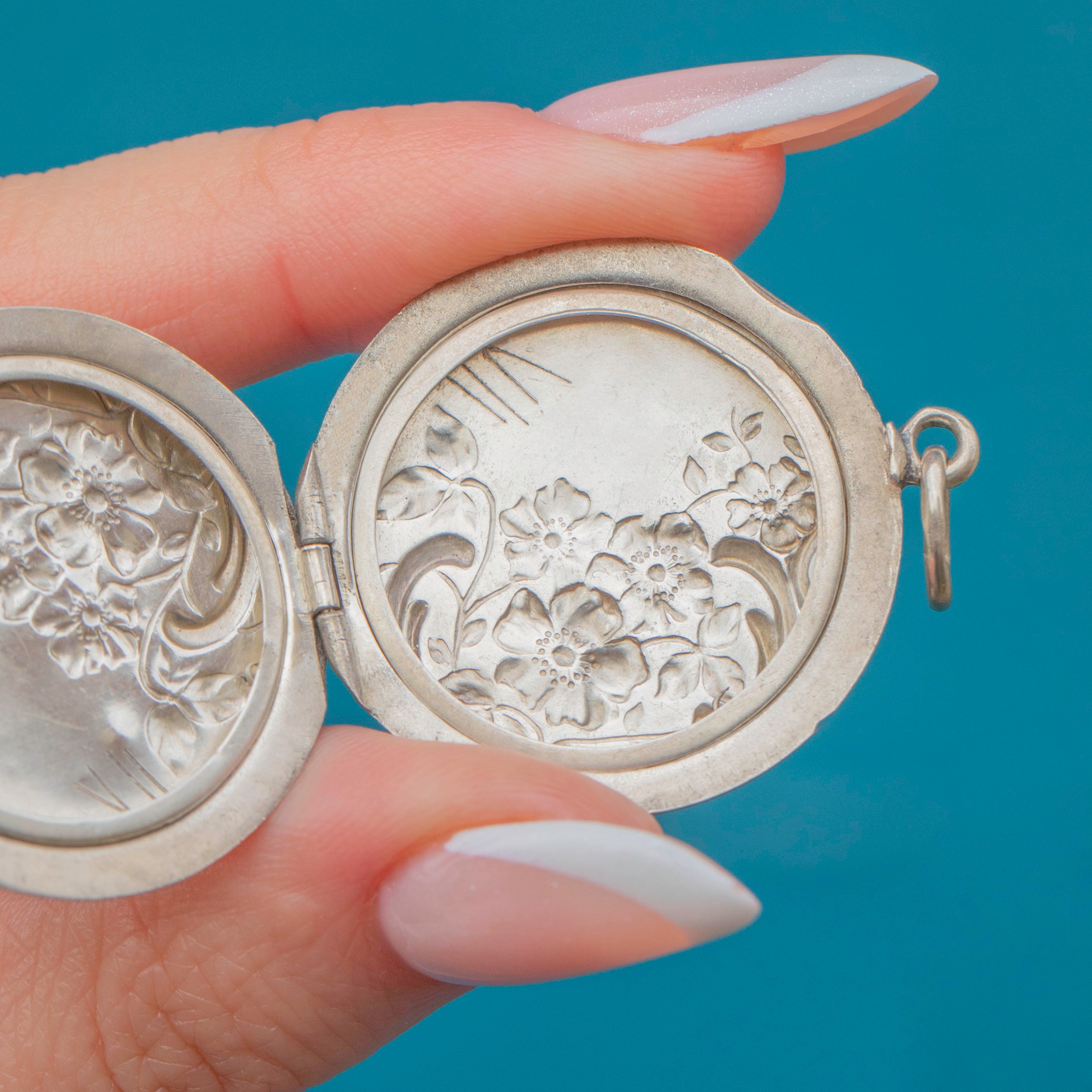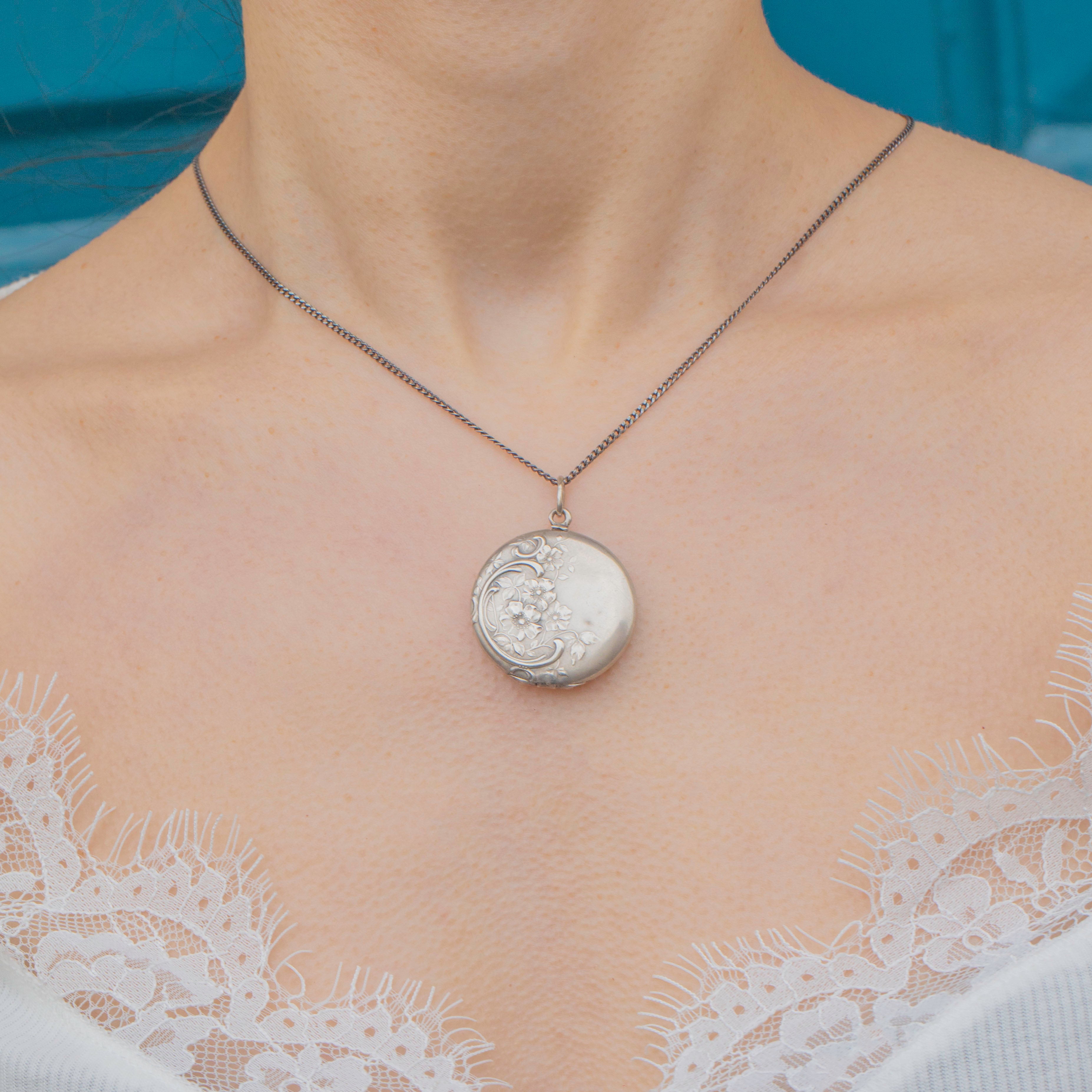 This Art Nouveau Silver floral locket is a botanic beauty with a whimsical floral design. Her 800 Silver exudes elegance and grace, enhanced by the sweet and intricate repoussé details.
