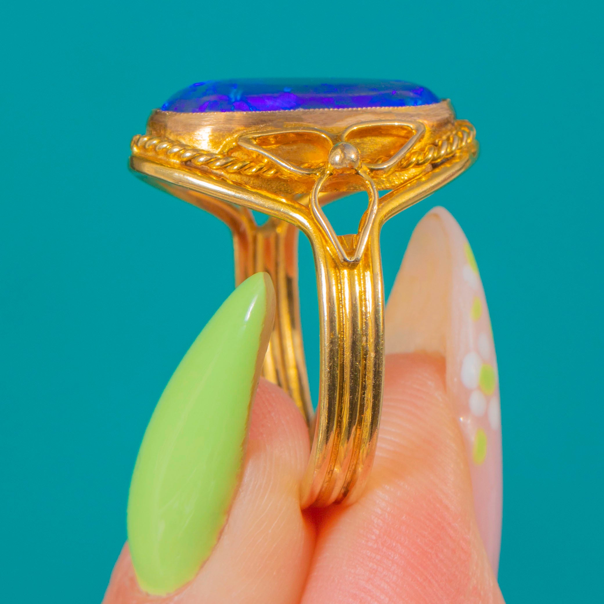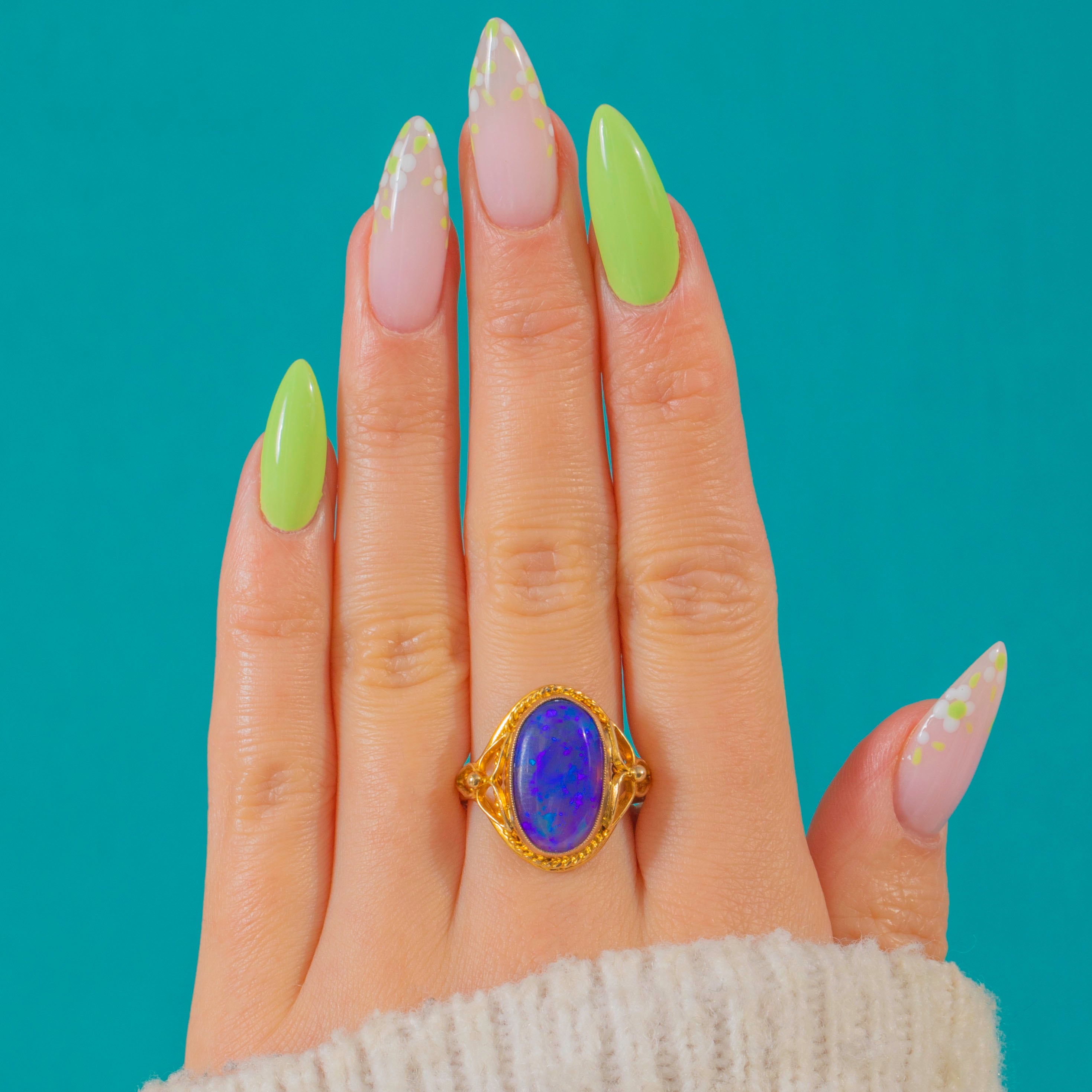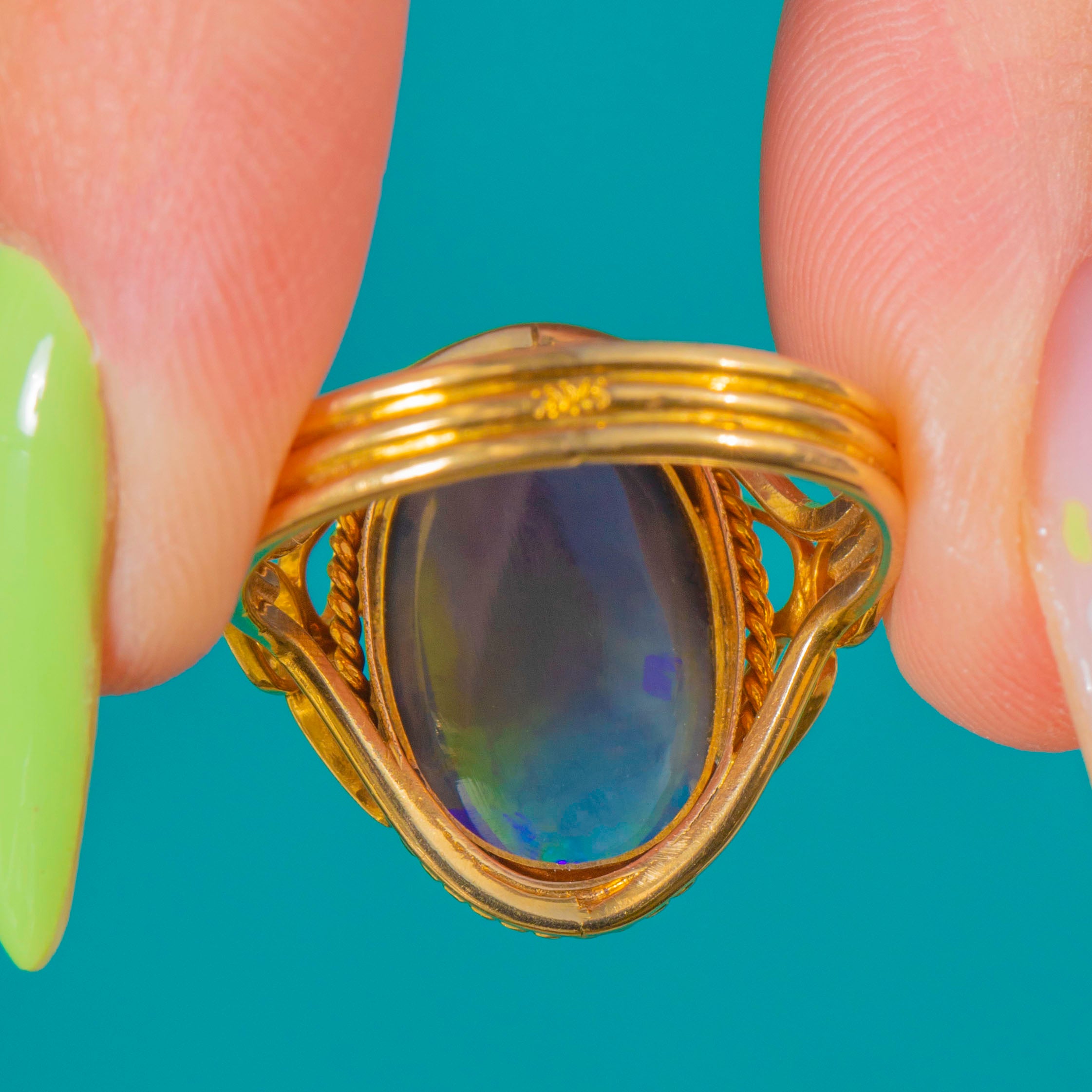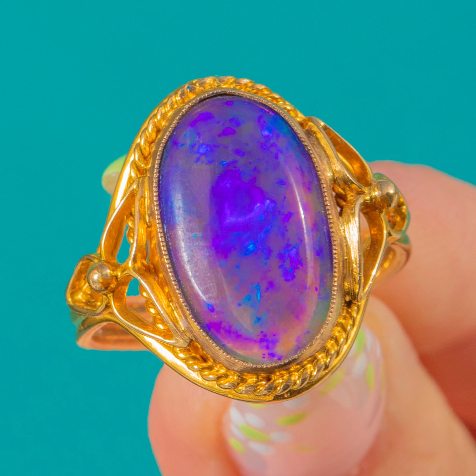 Glowing with an electric play-of-colour, this Arts and Crafts ring showcases a 2.60ct solid Black Opal in rich 9ct Gold. The high-domed oval cabochon shimmers violet-blue with vivid flashes of green, captured in a protective bezel framed by an applied twisted-rope border. Pierced foliate and scrollwork shoulders lead to a sculptural split, triple-wire shank, lending the piece its romantic, hand-wrought character.