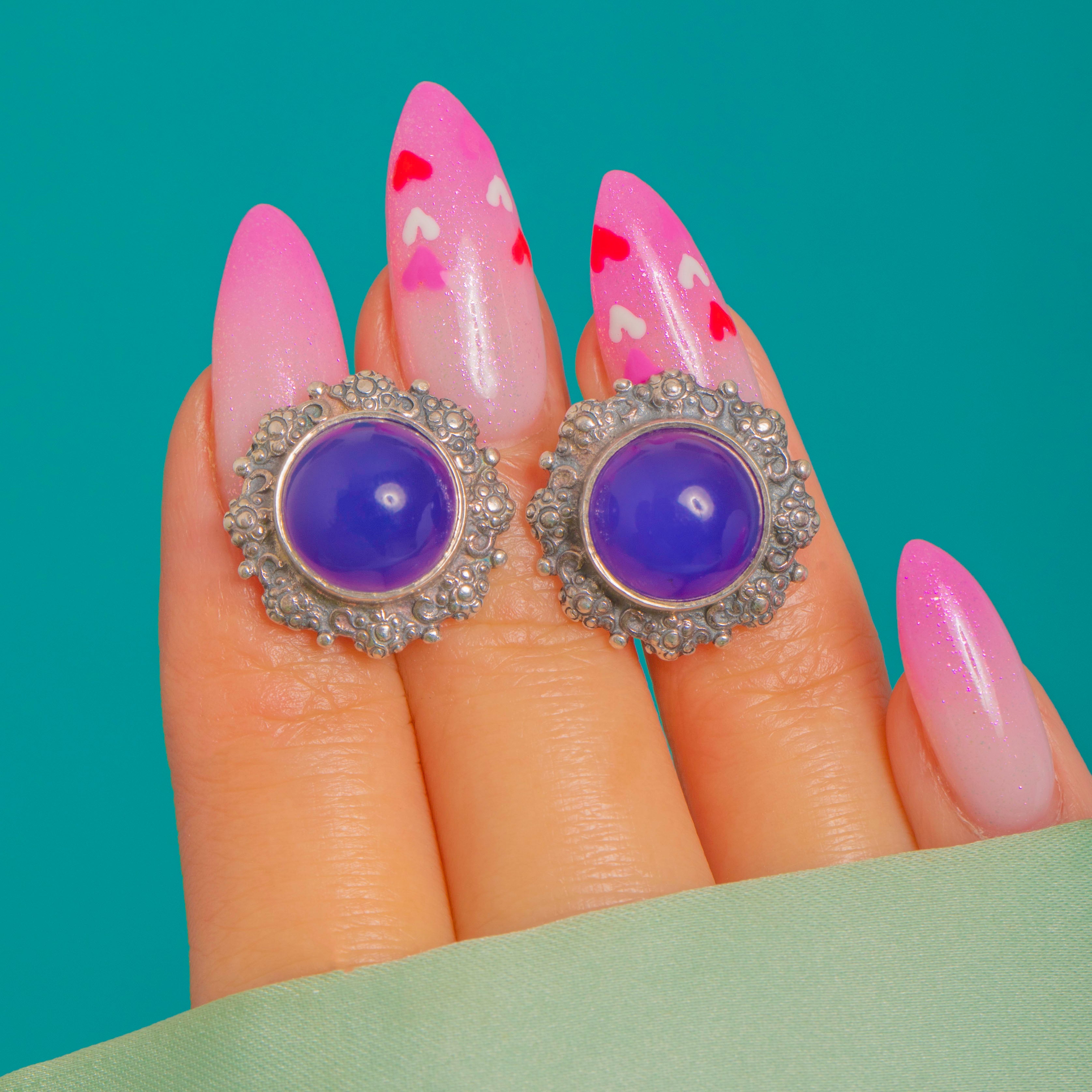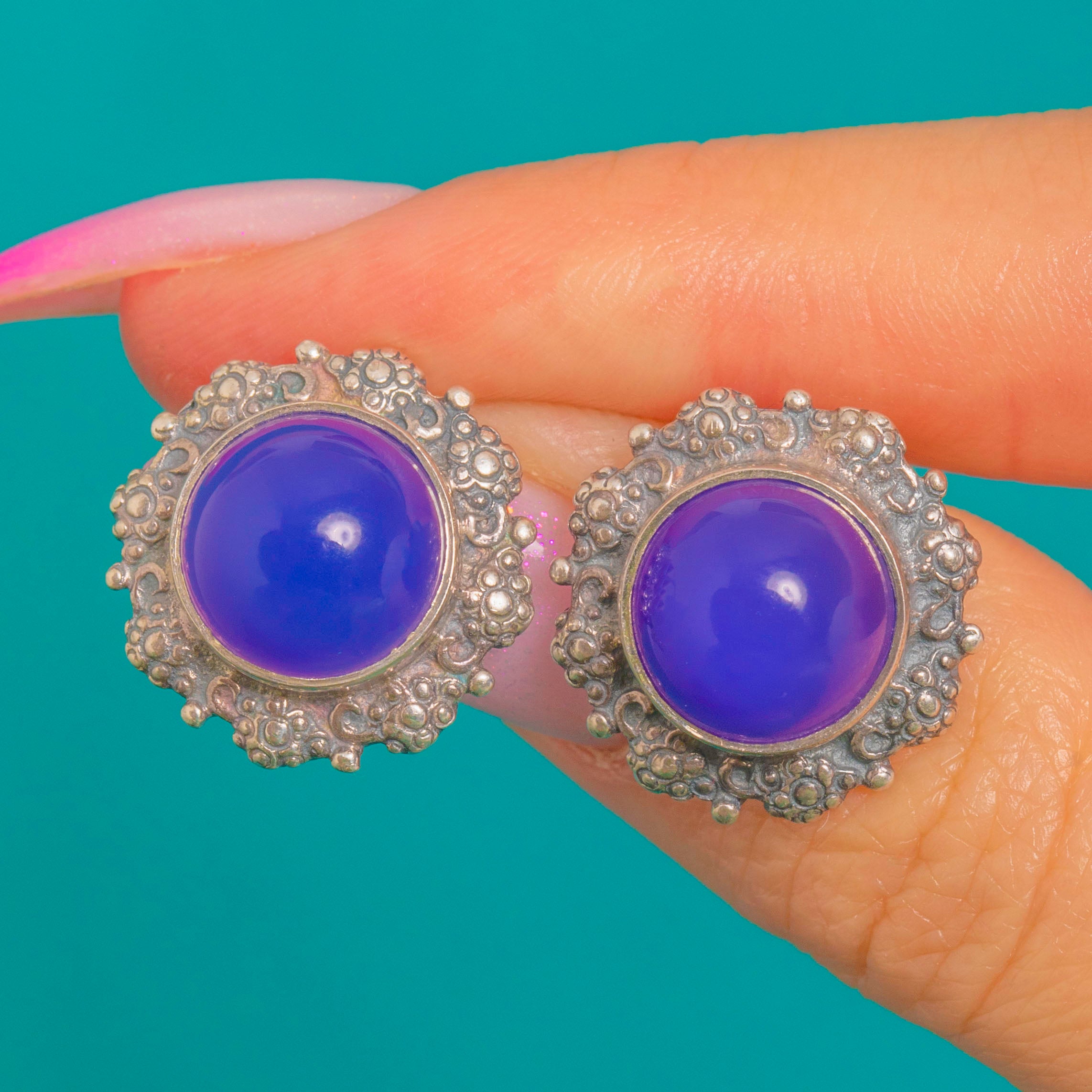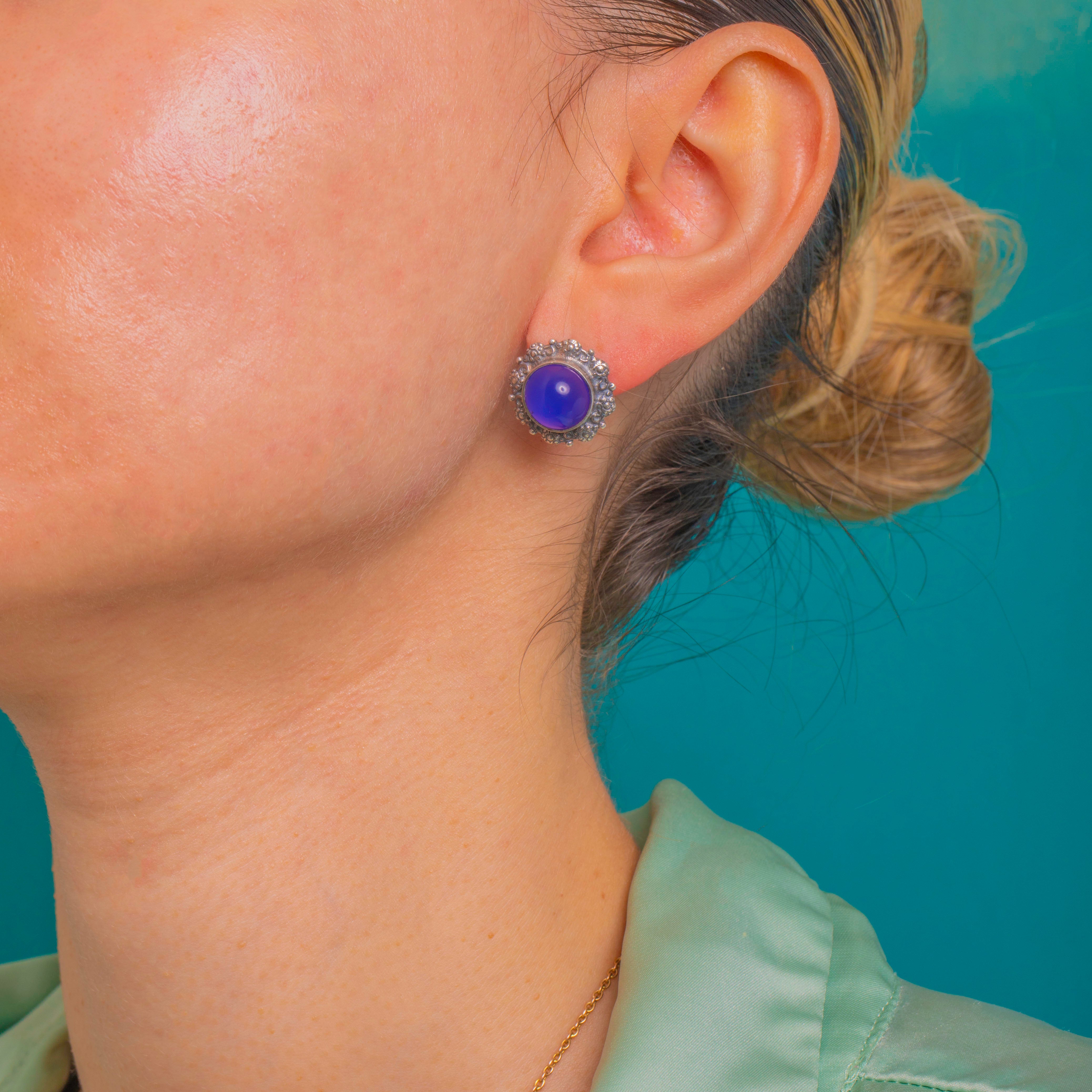 EXCELLENT: The Chalcedony cabochons are bright and glossy with no chips or noteworthy abrasions visible. The Silver settings are crisp with light surface wear and a pleasing patina in the recesses; posts and butterfly backs are secure and in fine order. No signs of restoration or repair, and overall wear is minimal, suggesting the earrings have been well cared for.