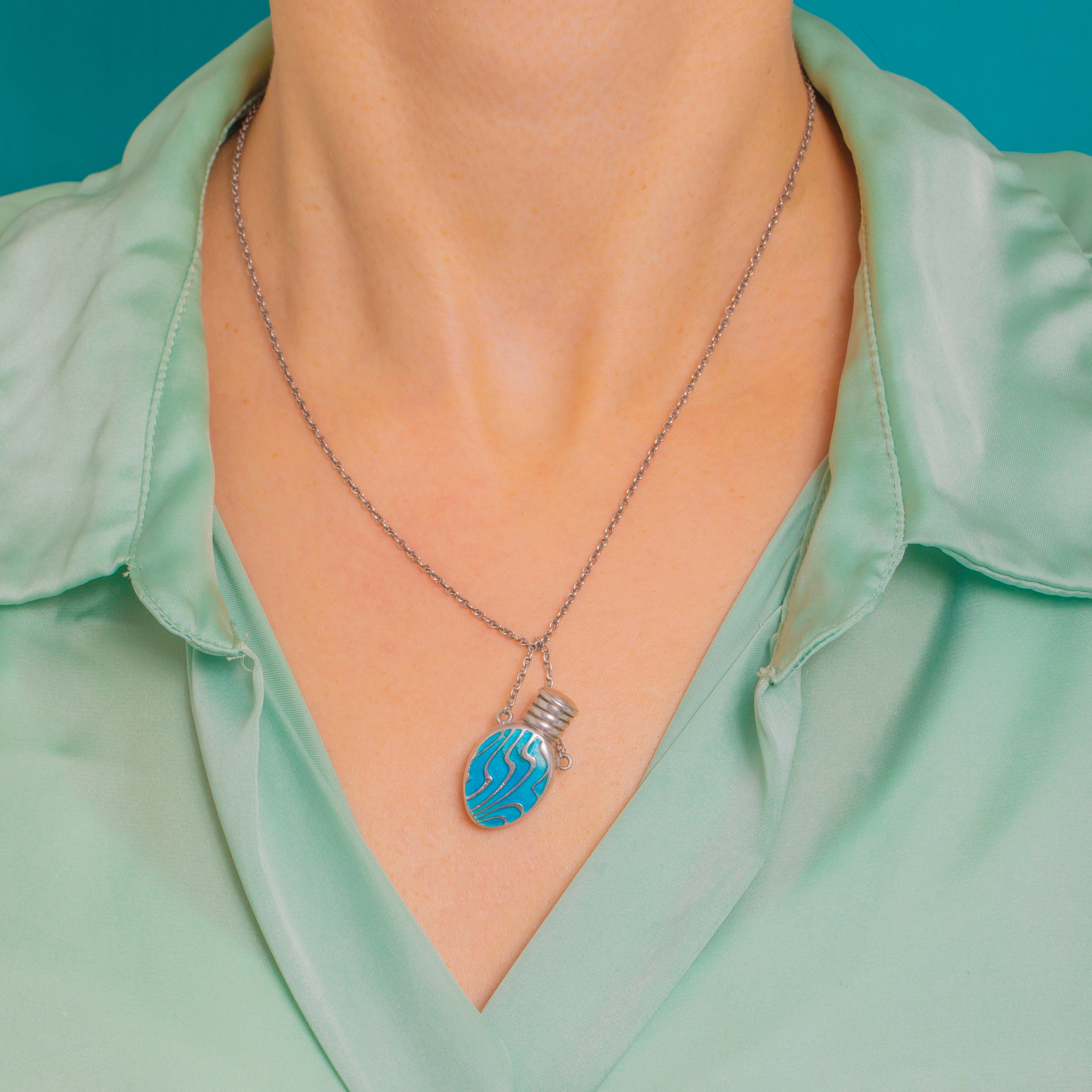 Arts and Crafts Silver Blue Enamel Perfume Bottle Pendant