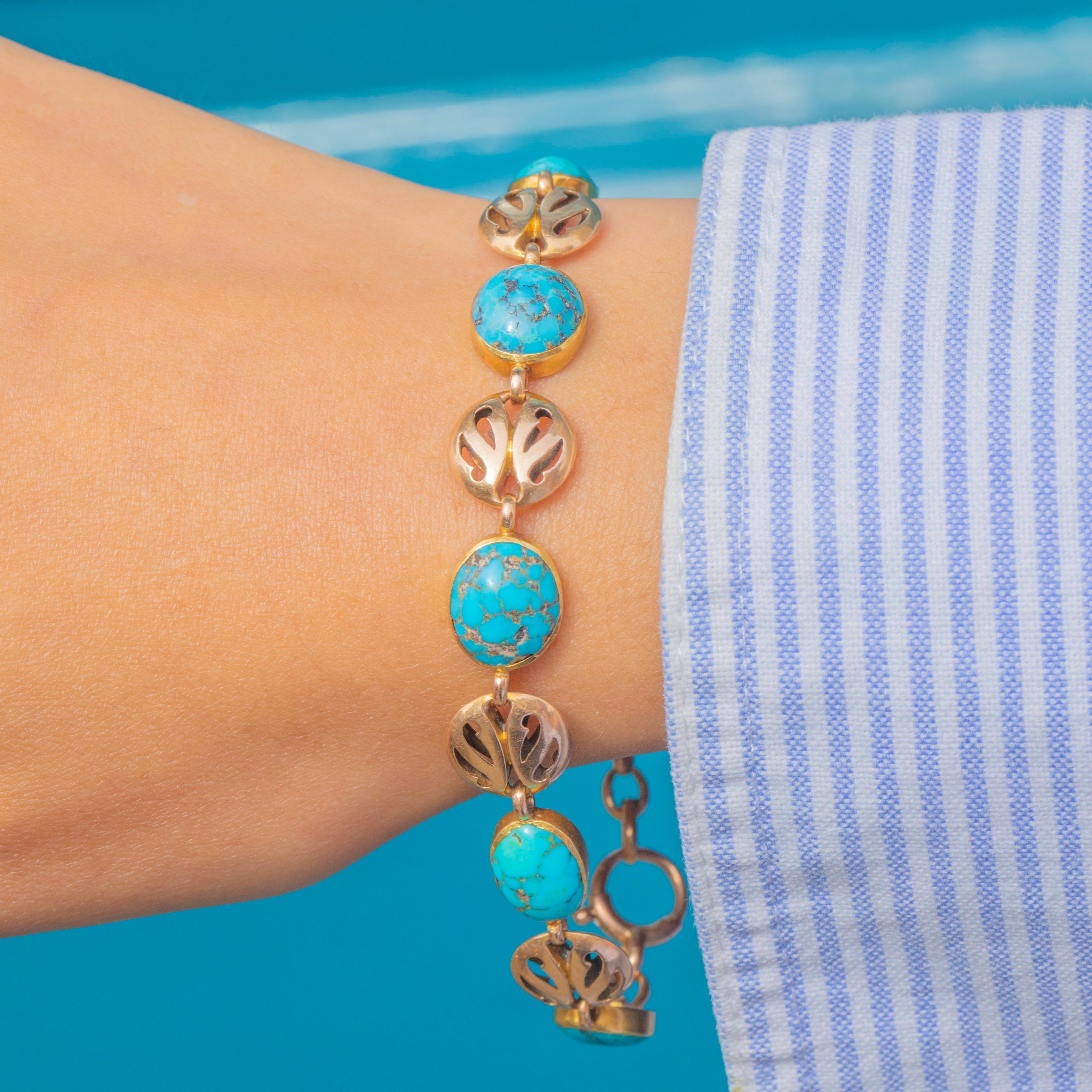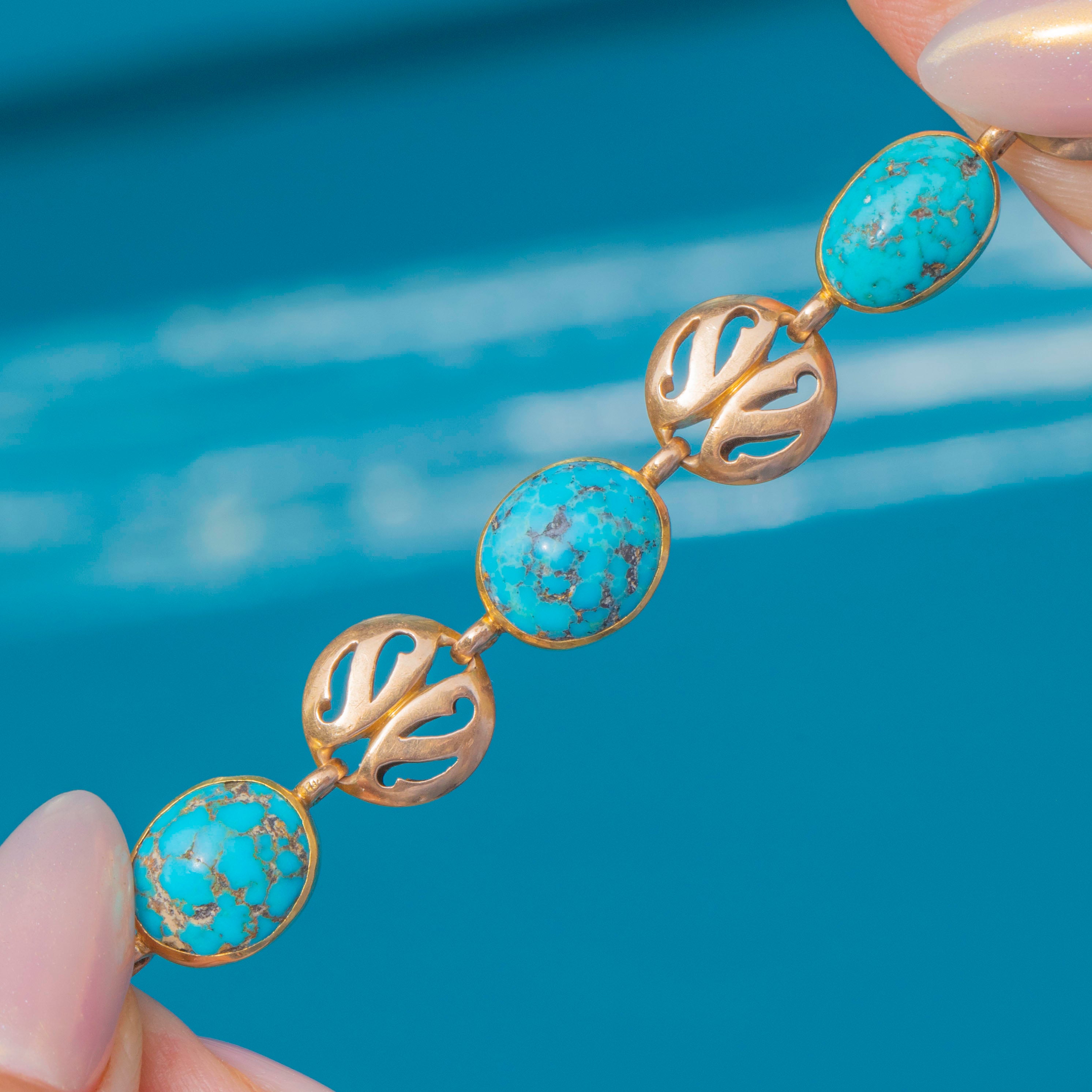 EXCELLENT: The bracelet is in superb condition. The Turquoise stones are intact and vibrant, and the Gold settings are secure. There is one minor repair beneath a single link, discreet and stable, ensuring the piece remains fully wearable and beautifully presented.