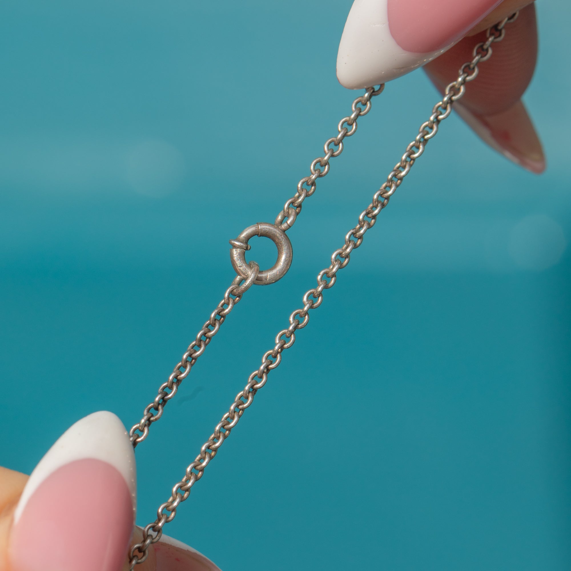 EXCELLENT: No chips, cracks, or missing parts to the glass stones. The Silver setting and chain are in beautiful condition with only minimal, age-appropriate wear.