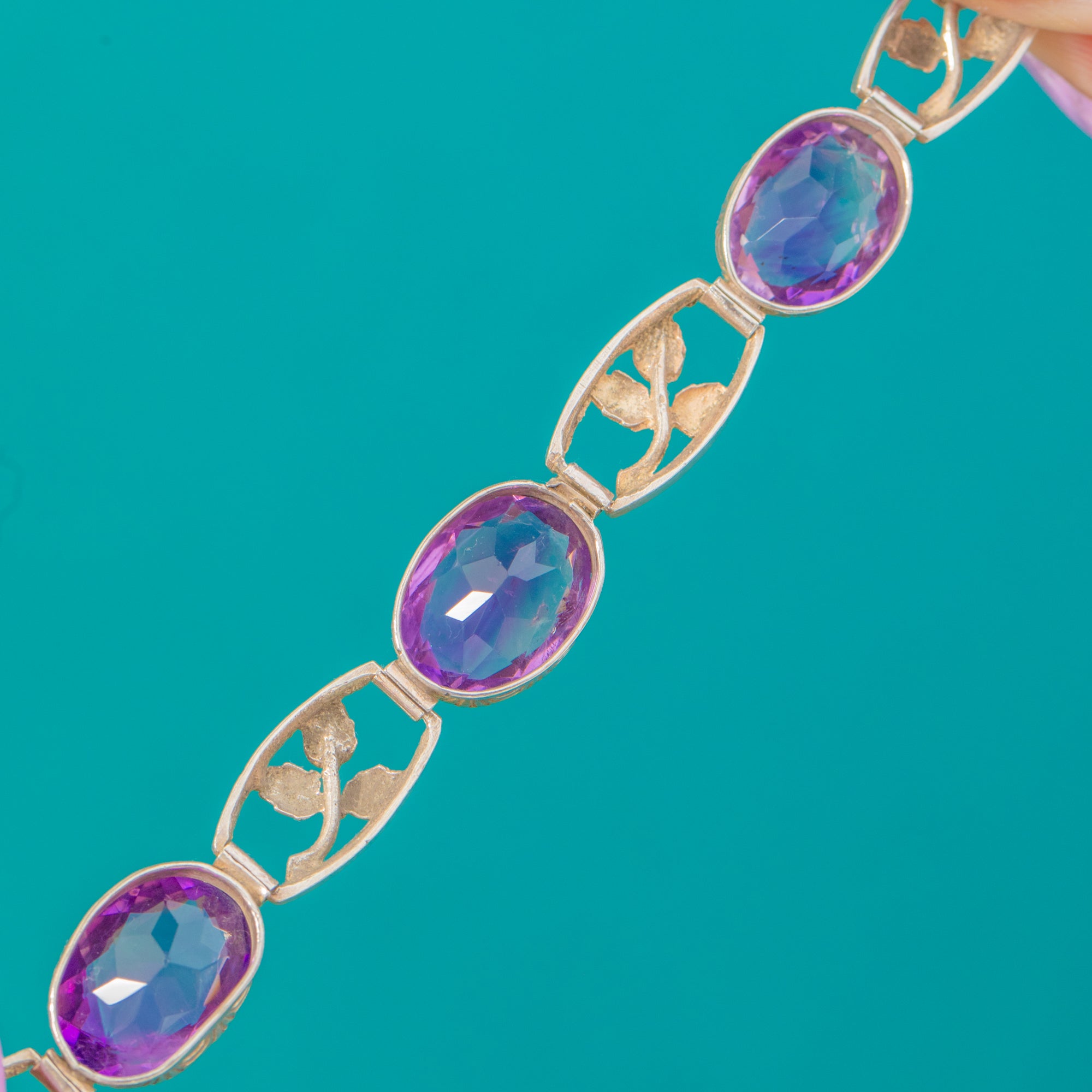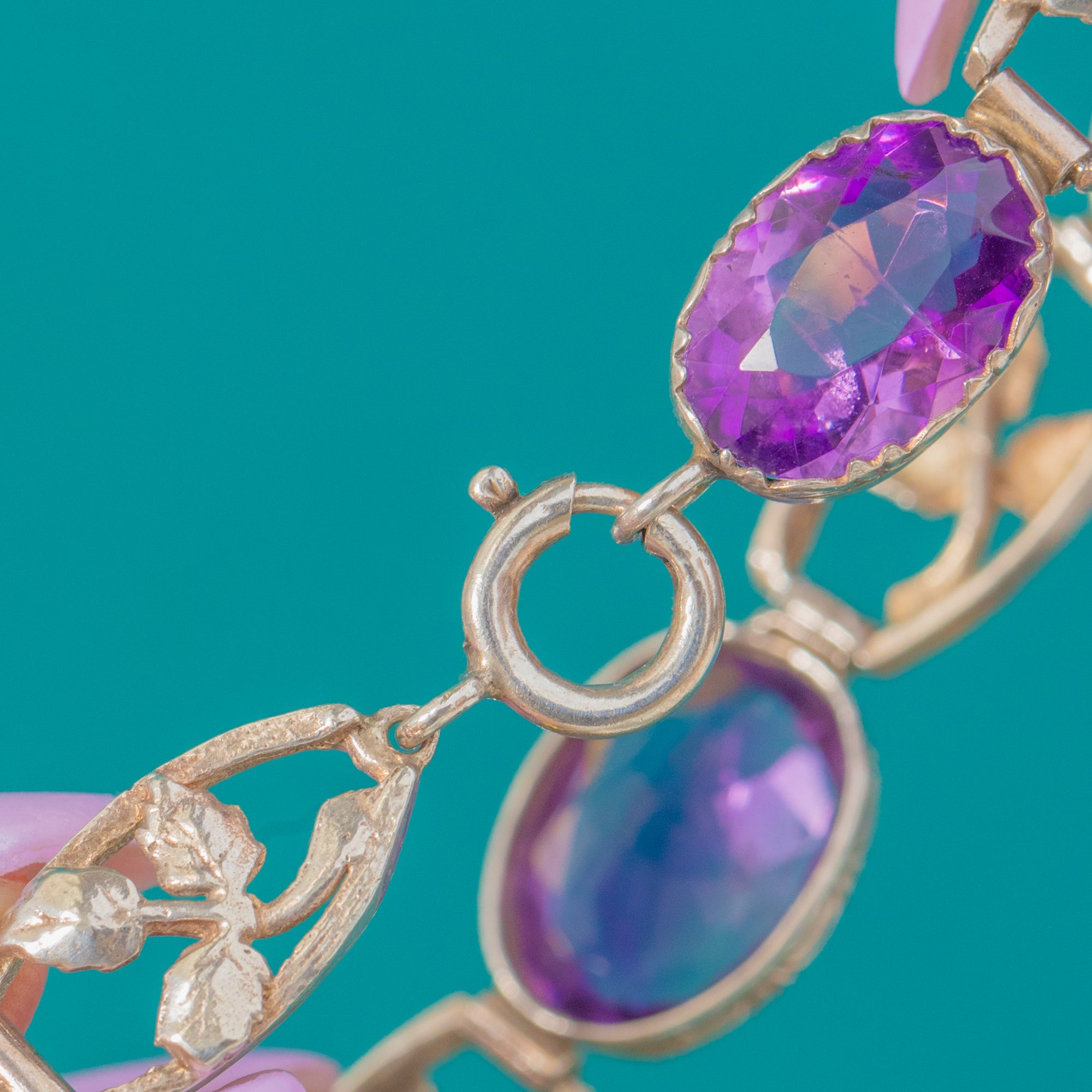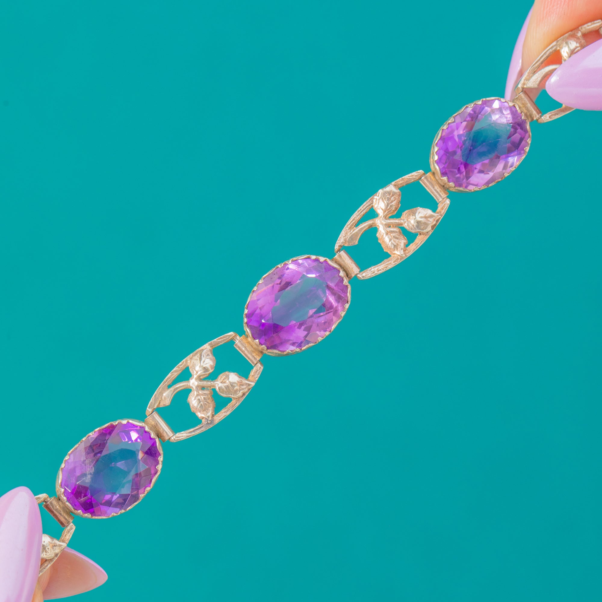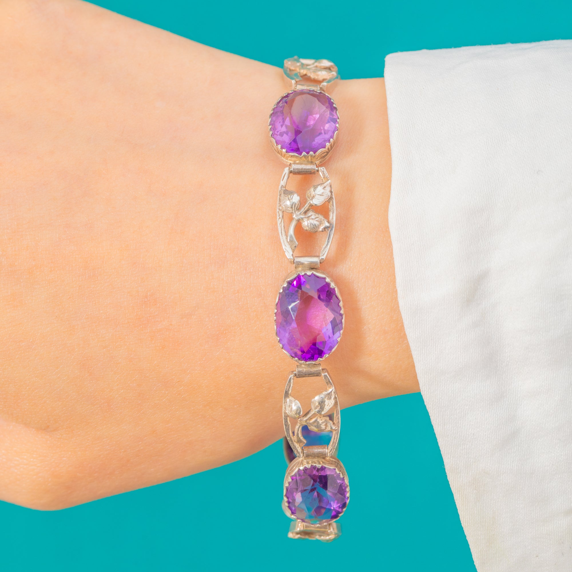 Richly hued Amethysts and romantic foliate links make this Arts and Crafts bracelet a delight to behold! .. Vivid violet oval gems are cradled in scalloped bezel settings and typical cut claws..  alternating with airy, openwork leaves to create a lyrical, botanical rhythm around the wrist.