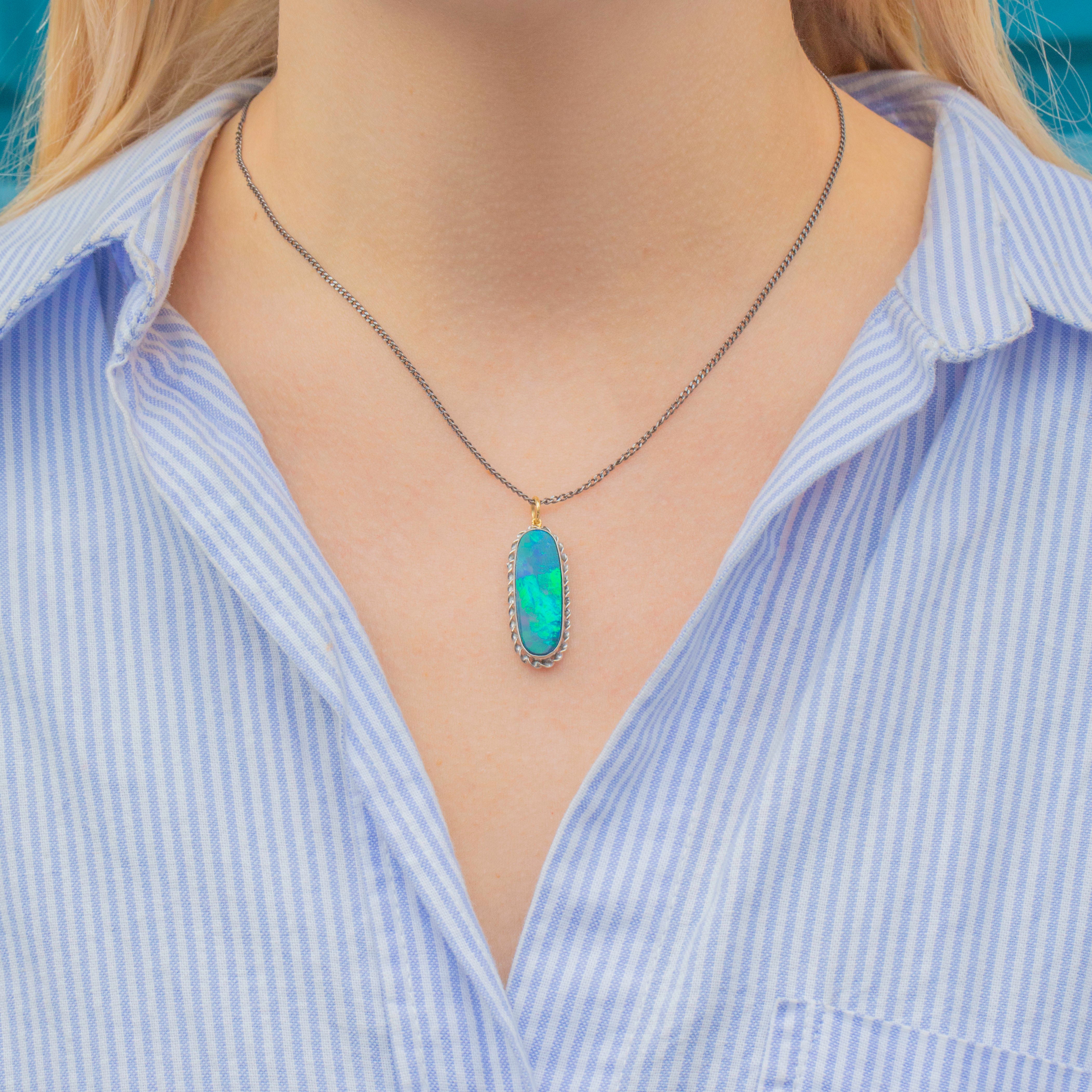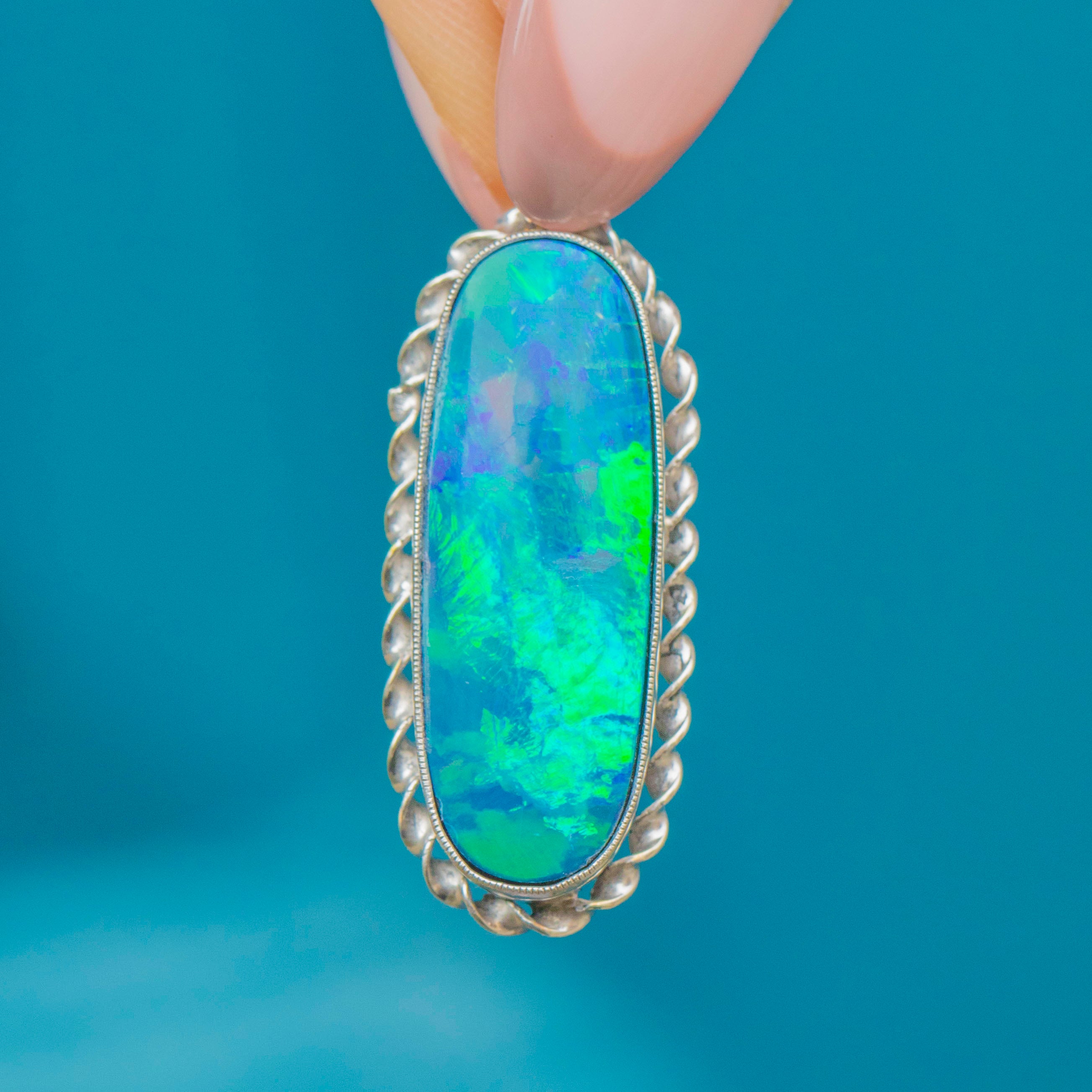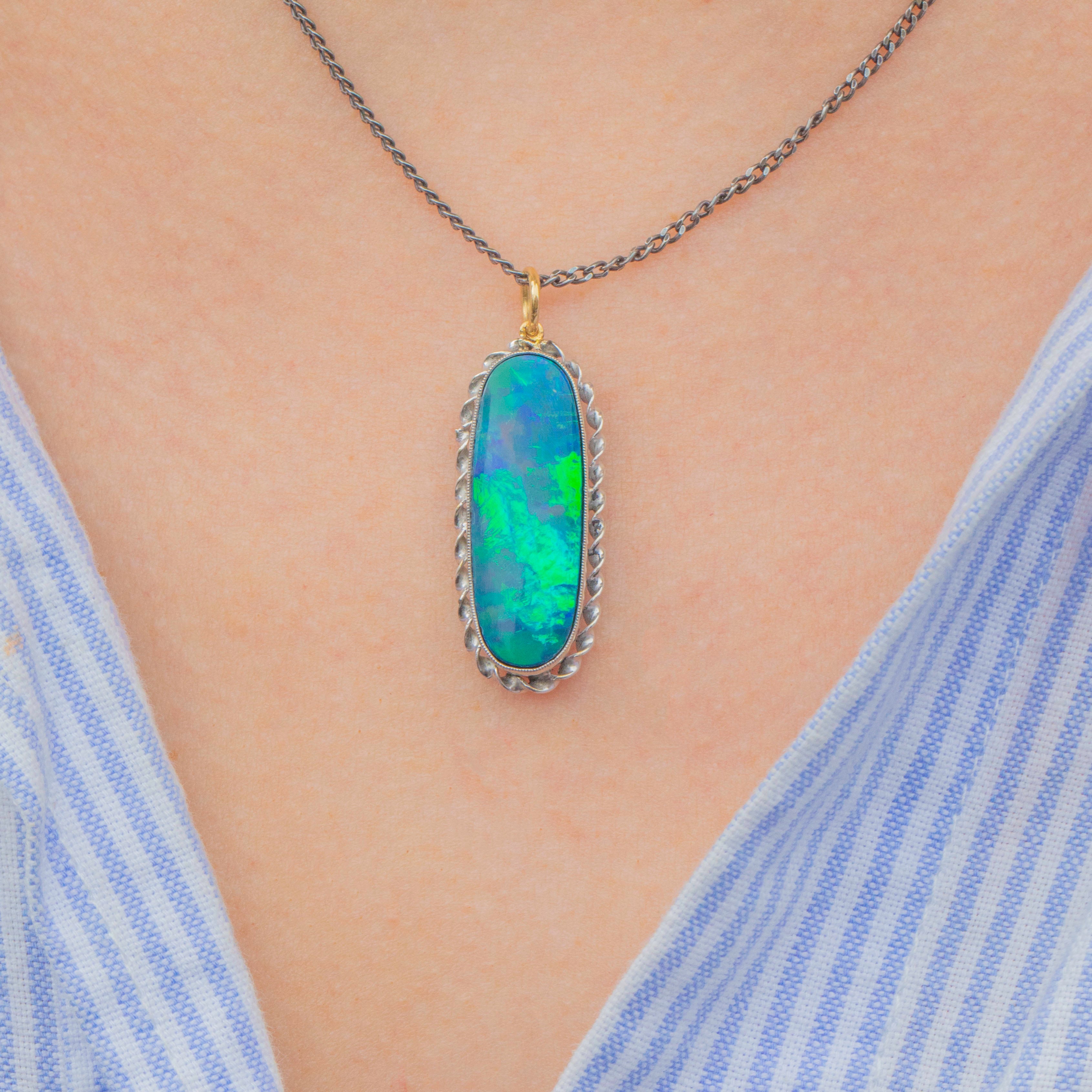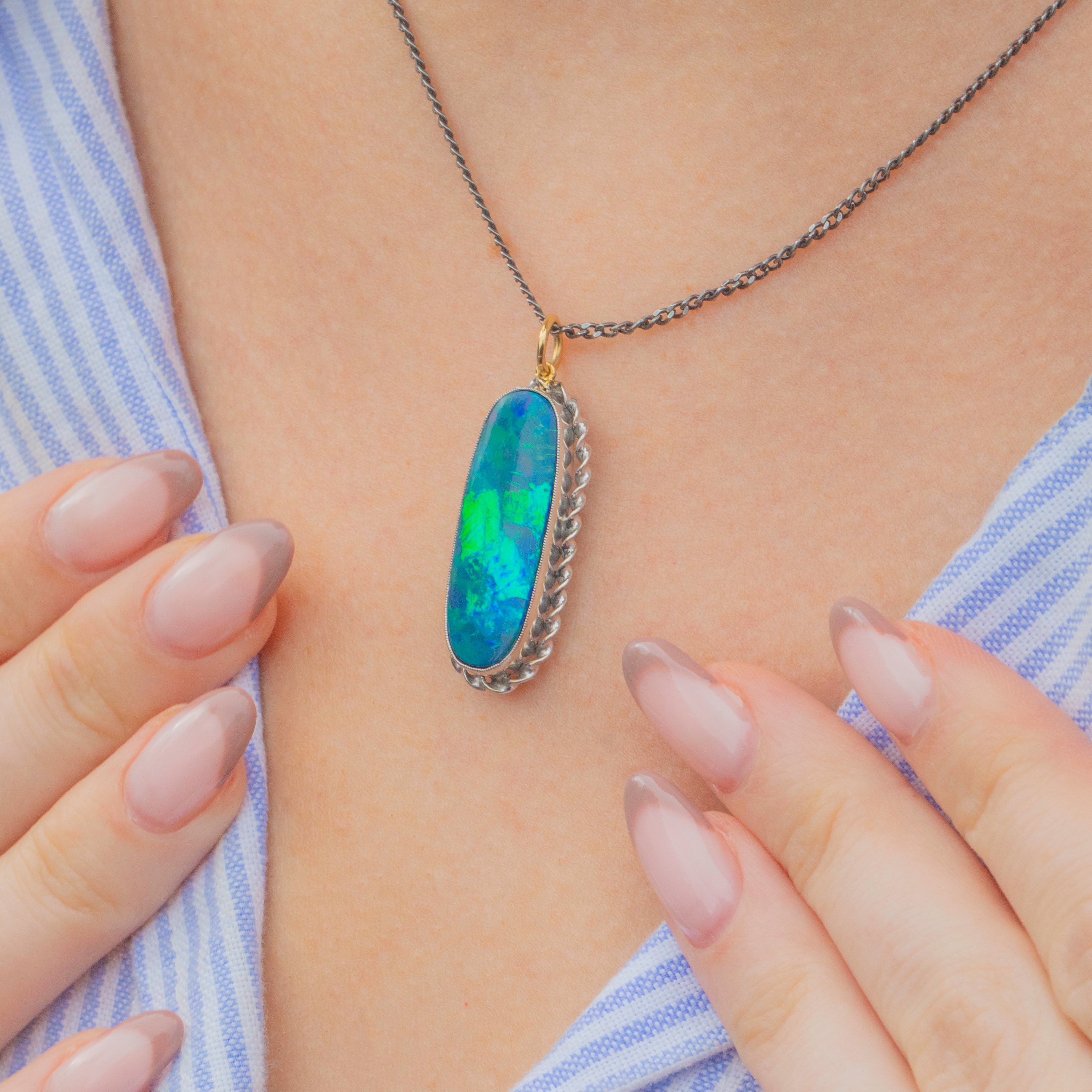 This outstanding Arts & Crafts Silver Opal Doublet pendant will instantly bring the wow factor to any outfit! Bursting with iridescent midnight blue and forest green hues, the large oval Opal cabochon reveals pops of bright orange and yellow under the light.