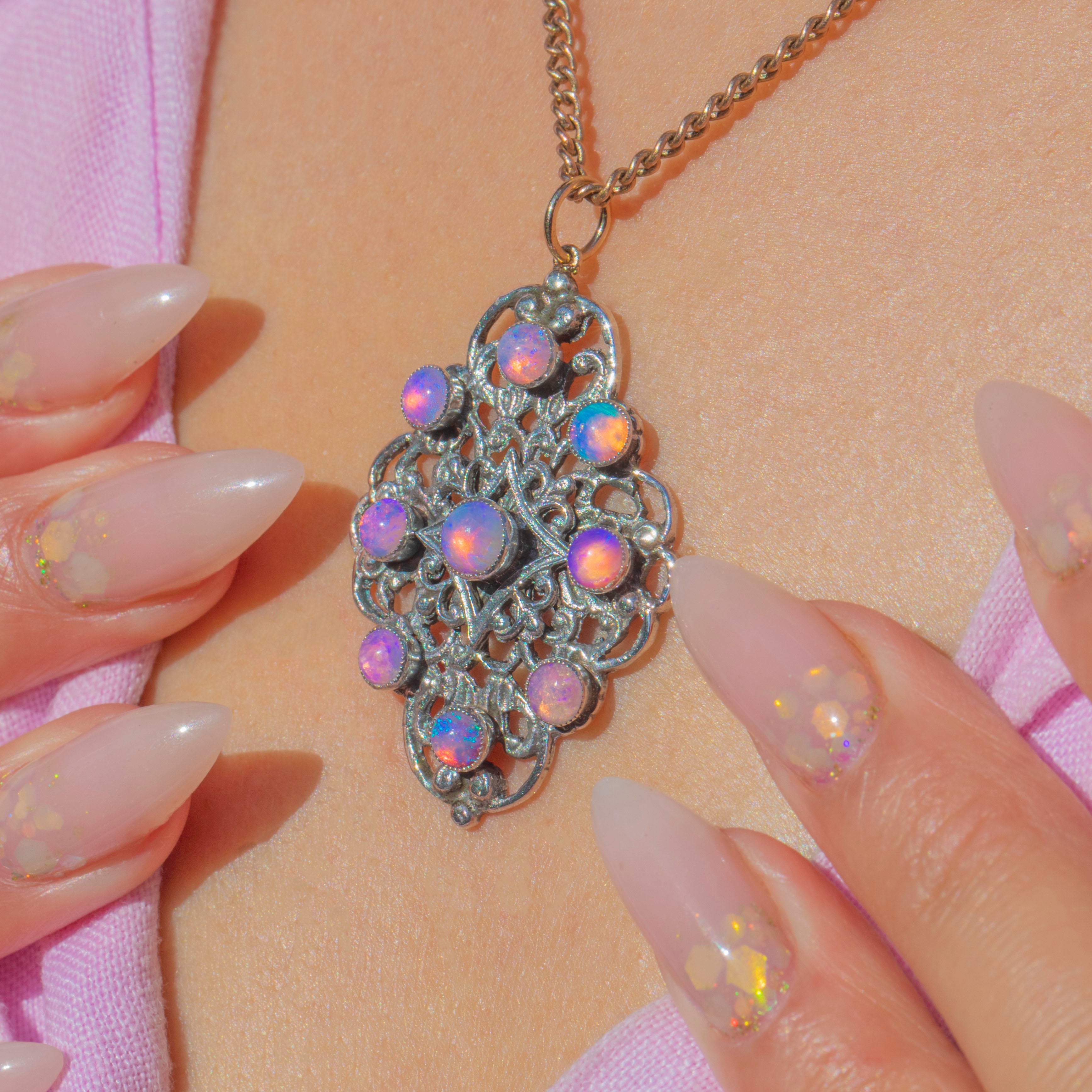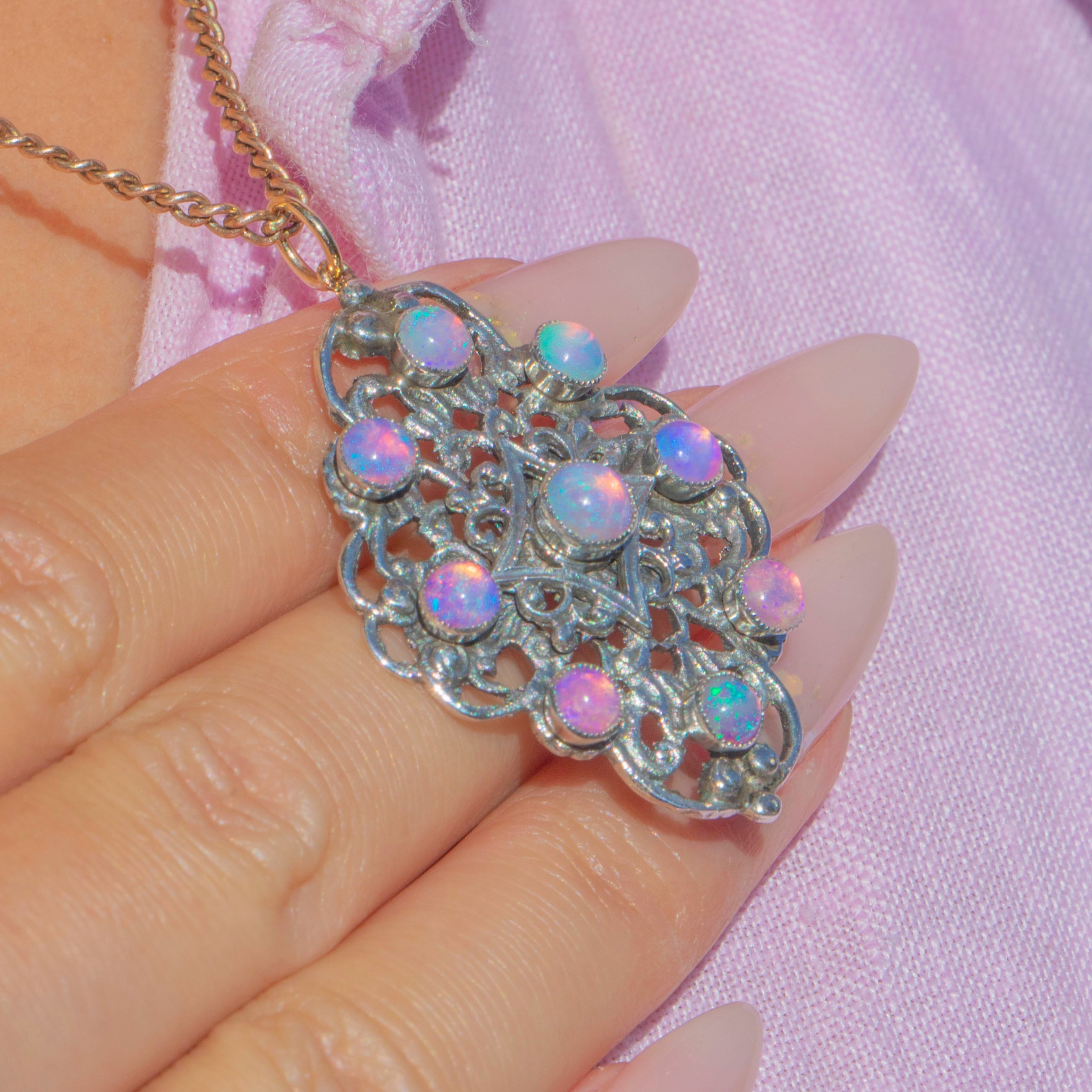 This charming Austro-Hungarian pendant is crafted in charming Silver filigree with a 9ct Gold jump ring, and set with glowing Pink "Dragon's Breath" Opaline glass! The stones display a delicate blush tone that shifts in the light, creating a soft and ethereal appearance. They are arranged in an ornate Silver frame, showcasing the decorative craftsmanship for which Austro-Hungarian jewels are celebrated.