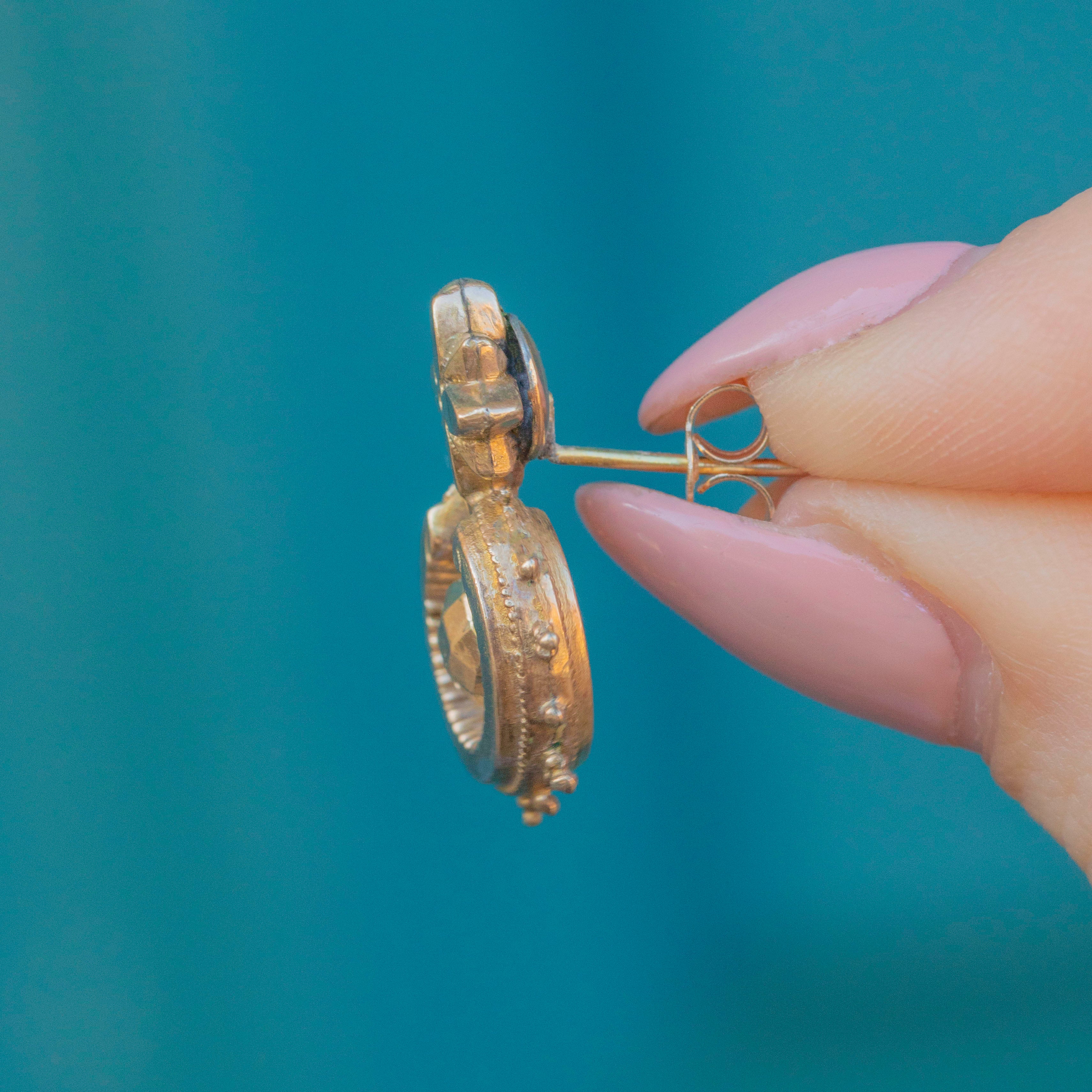 VERY GOOD. These authentic Victorian 9ct Gold drop earrings are in very good condition. The Gold is buttery with only some variation in hue, which is not noticeable while the earrings are worn. There is some minor surface wear in keeping with age, but each component is securely affixed and the butterfly backs are snug-fitting allowing you to wear these antique Gold drop earrings confidently!