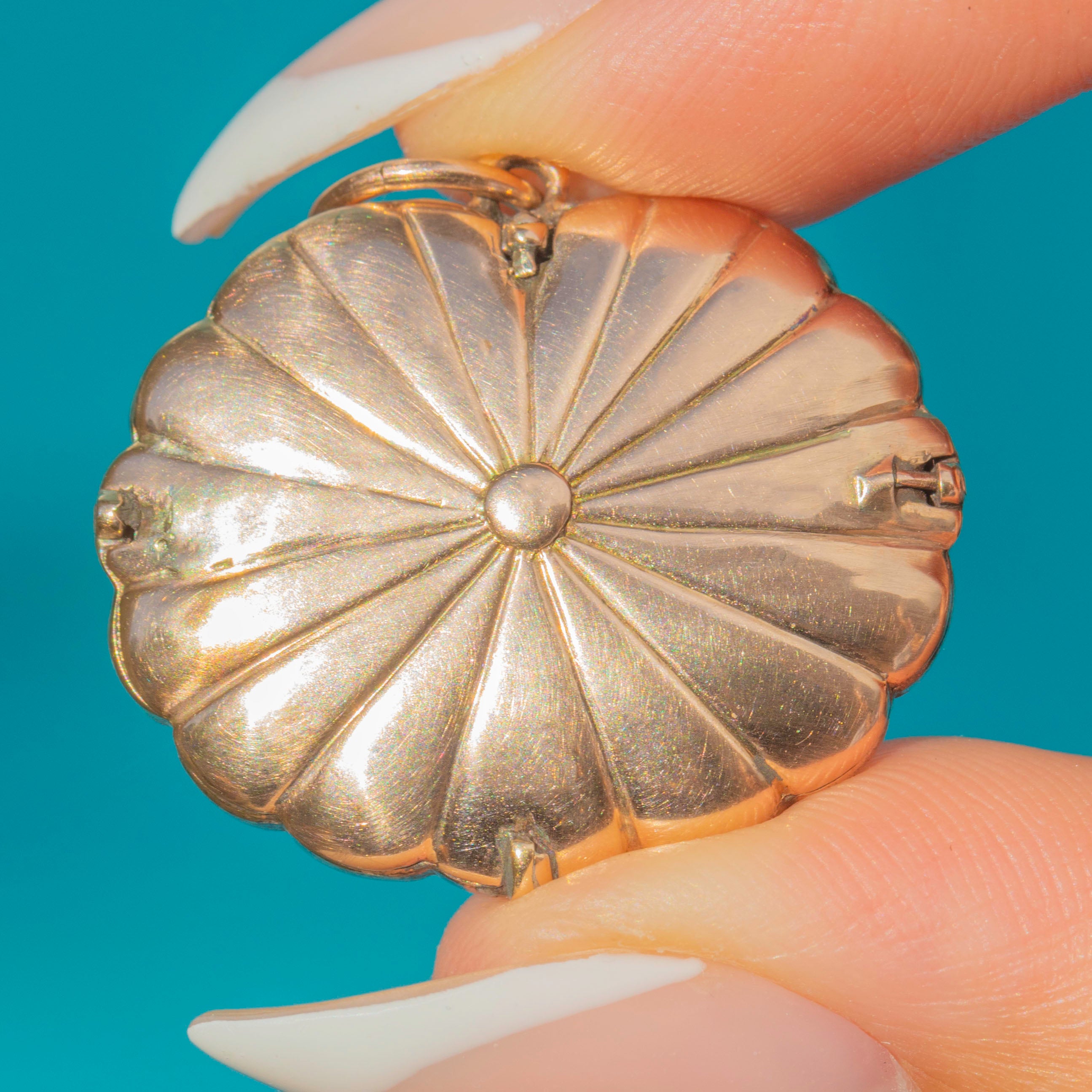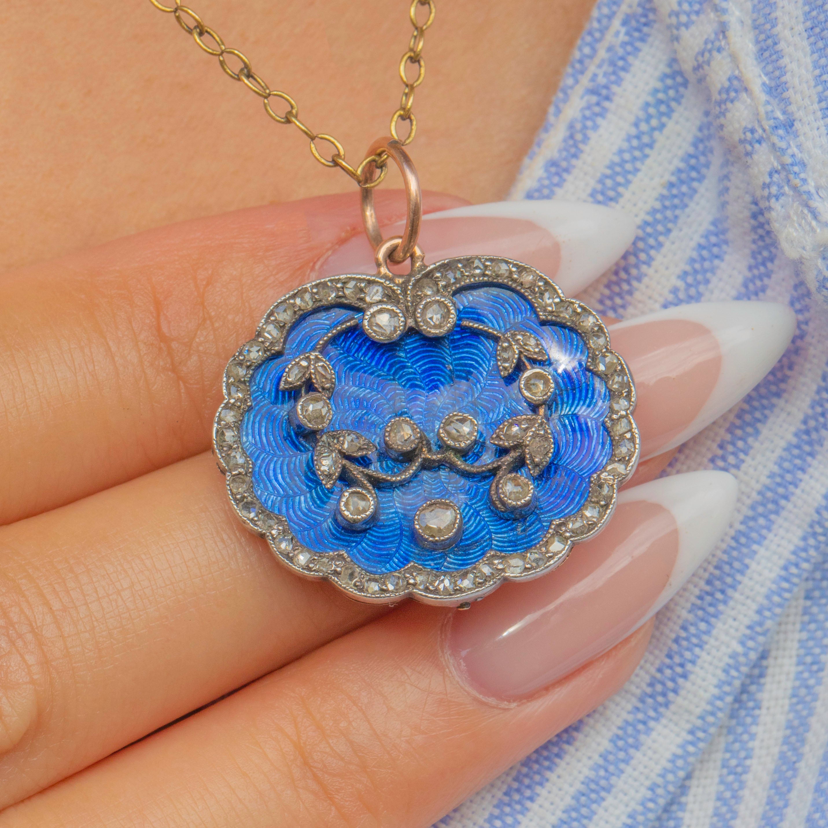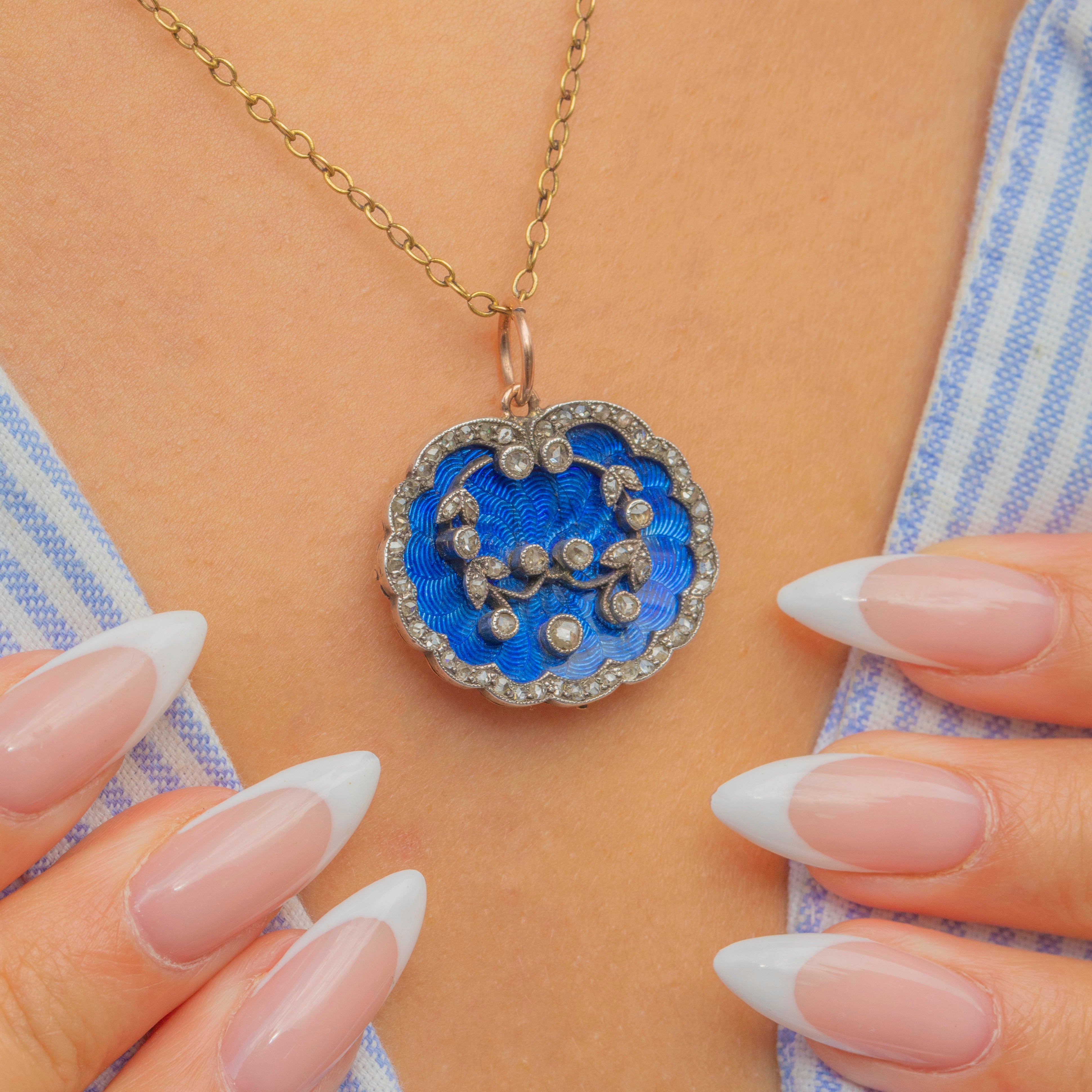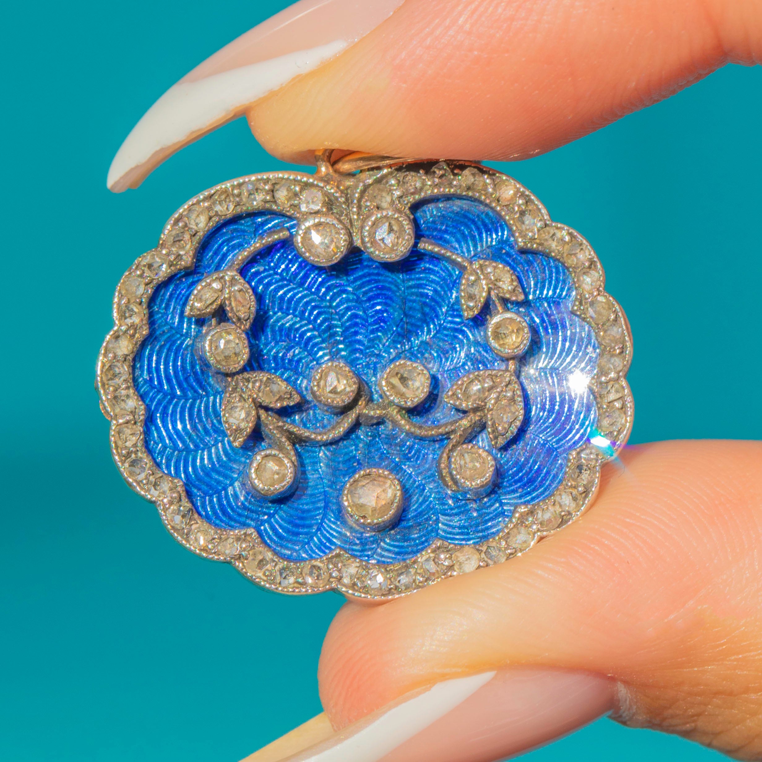A glorious Belle Époque pendant with electric blue guilloché enamel framed by a scalloped border of Rose Cut Diamonds. The floral garland across the centre adds depth and texture, while the rich 15ct Gold back and Silver settings give that classic two-tone antique look. Vivid colour, crisp chasing, and lovely proportions make this a collector’s piece that still wears effortlessly.