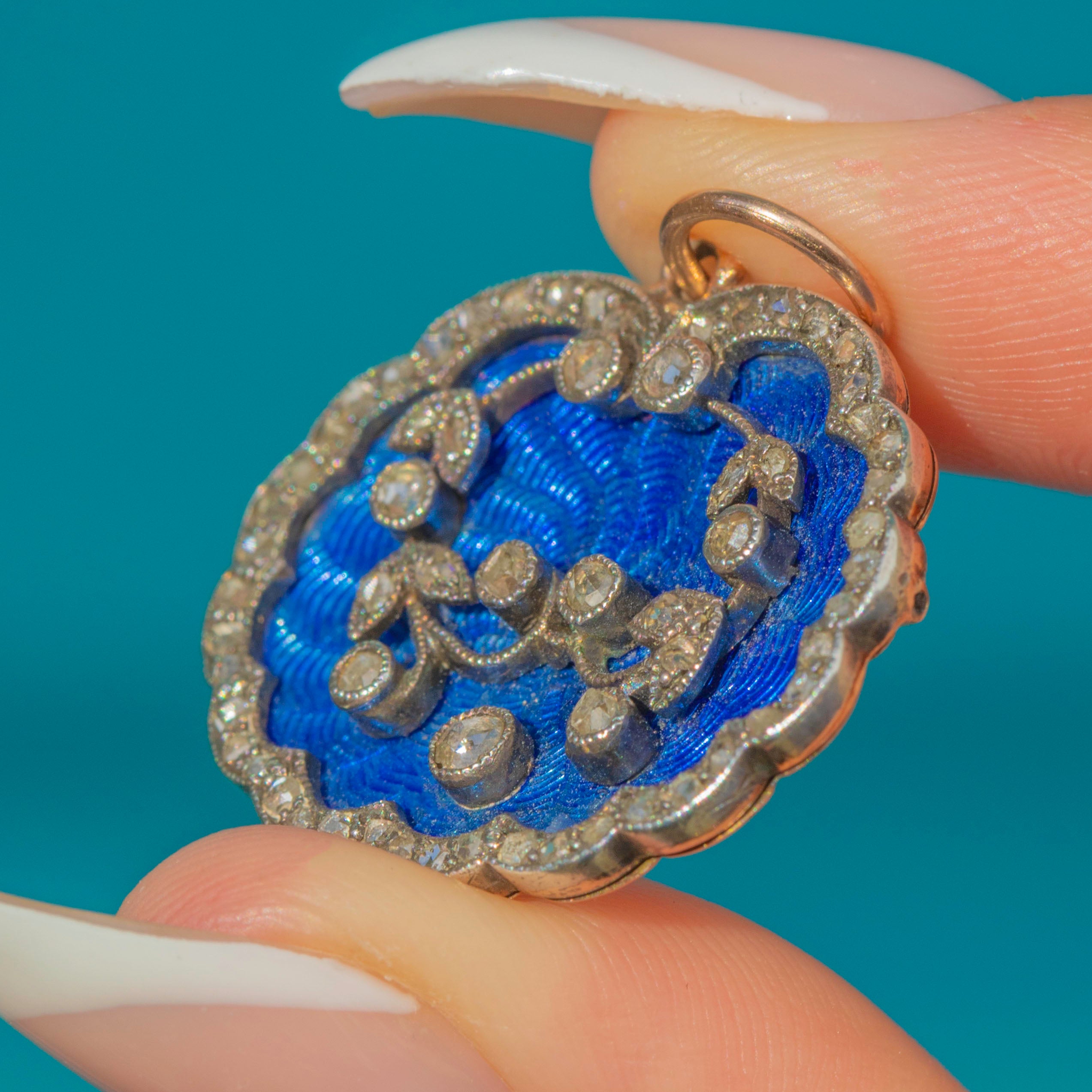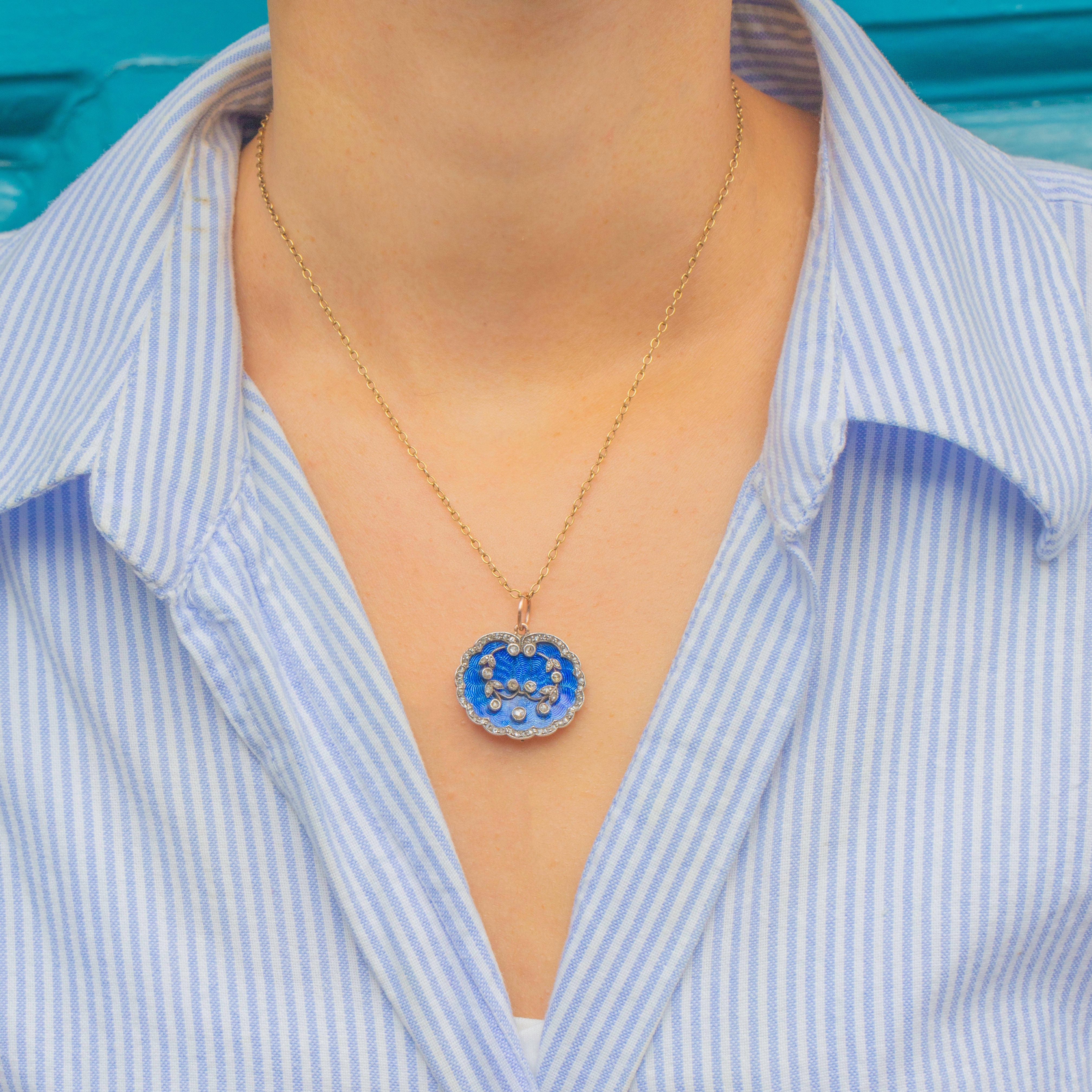 Belle Époque 15ct Gold & Silver Blue Guilloché Enamel & Rose-Cut Diamond Pendant, c.1890