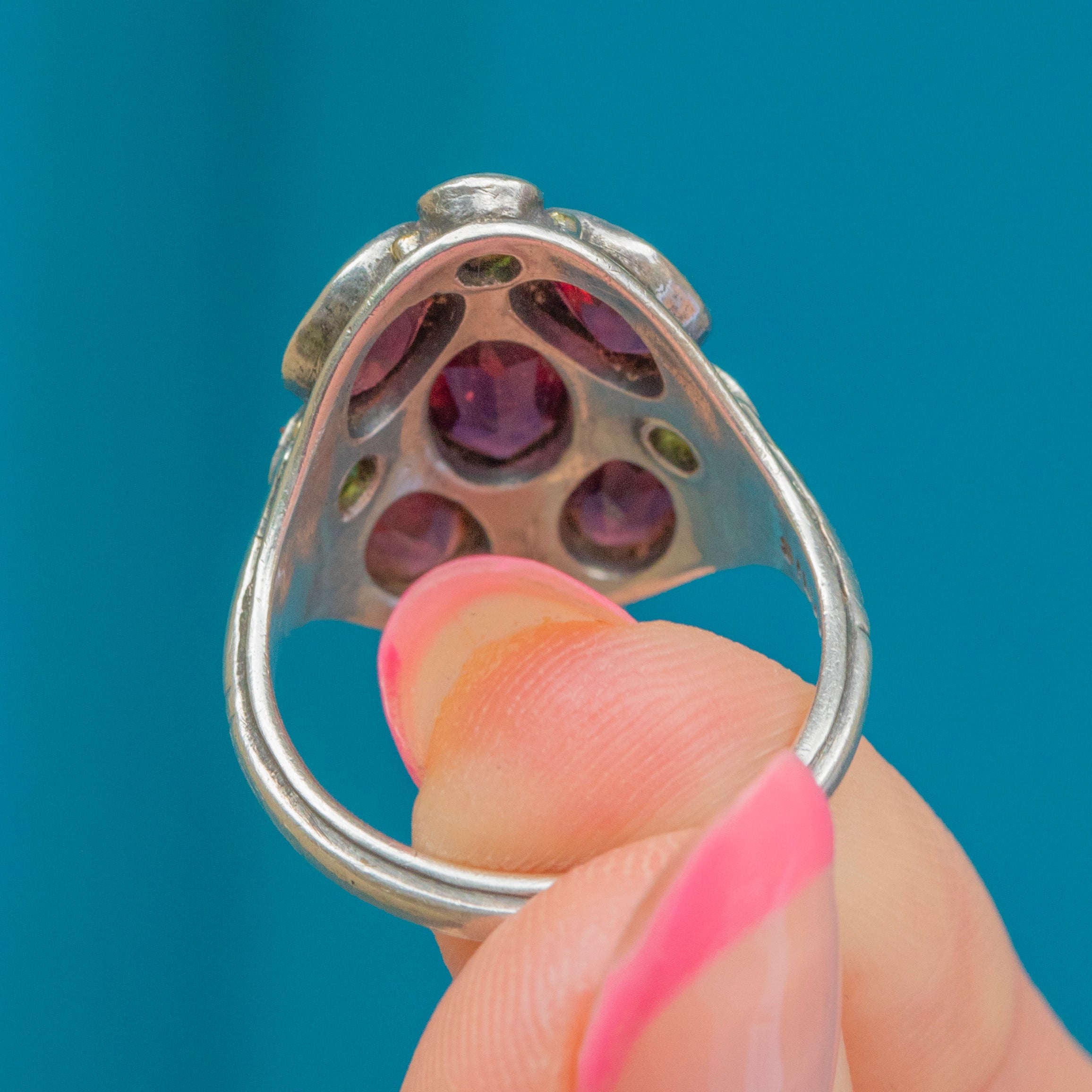 Signed by Bernard Instone, this Arts & Crafts Garnet cluster ring is so distinctive. Taking a naturalistic form, this Silver ring is inlaid with cherry red and chartreuse green Garnets!