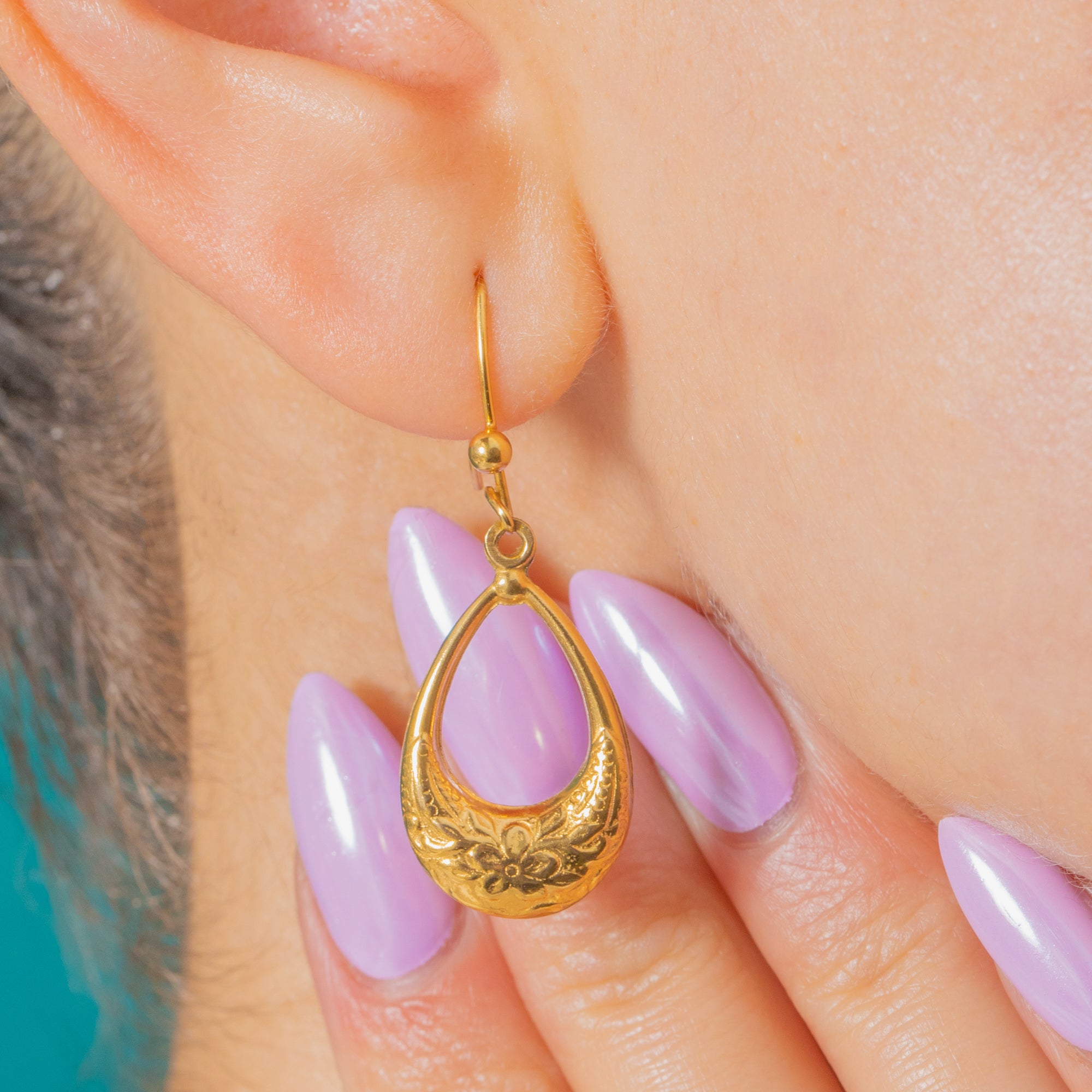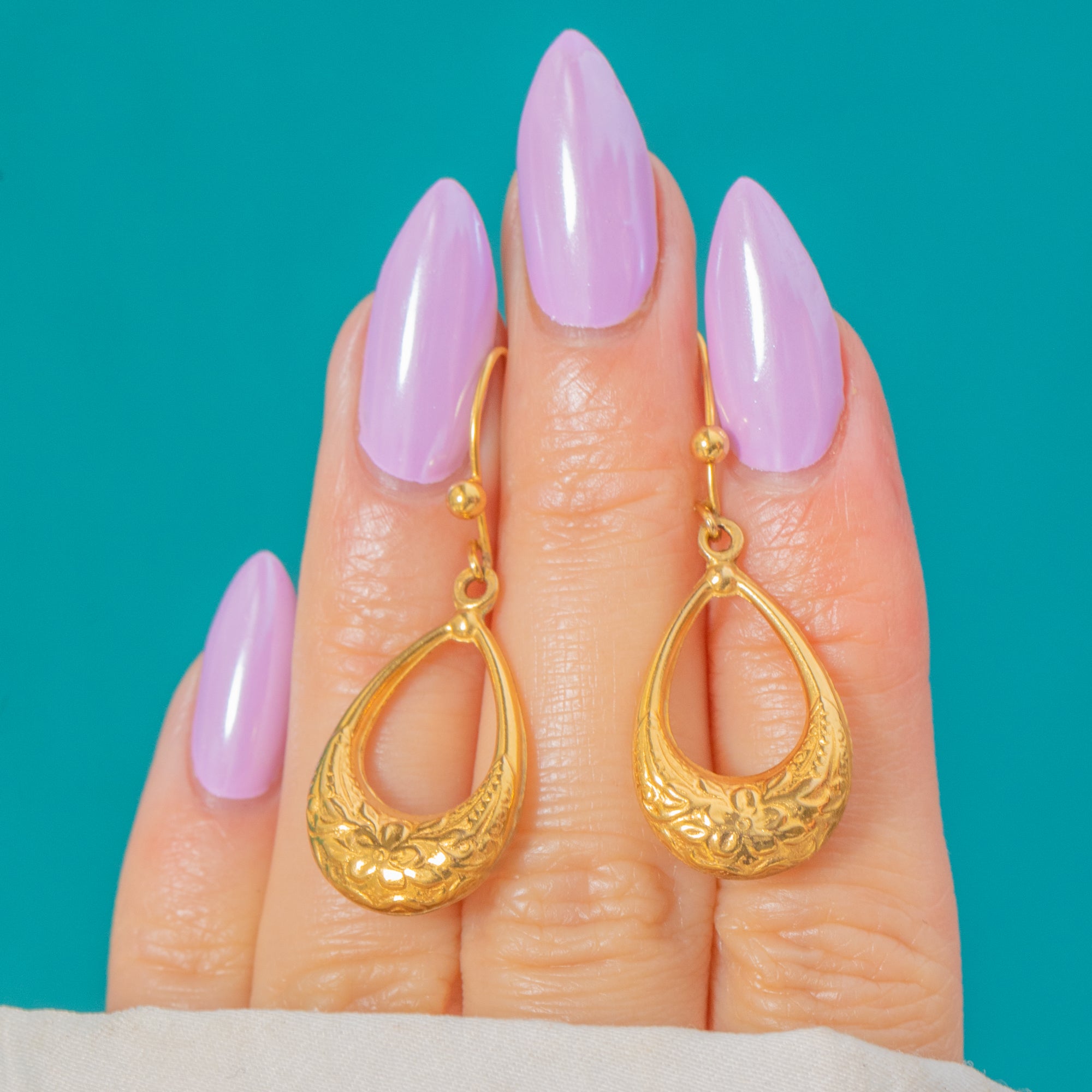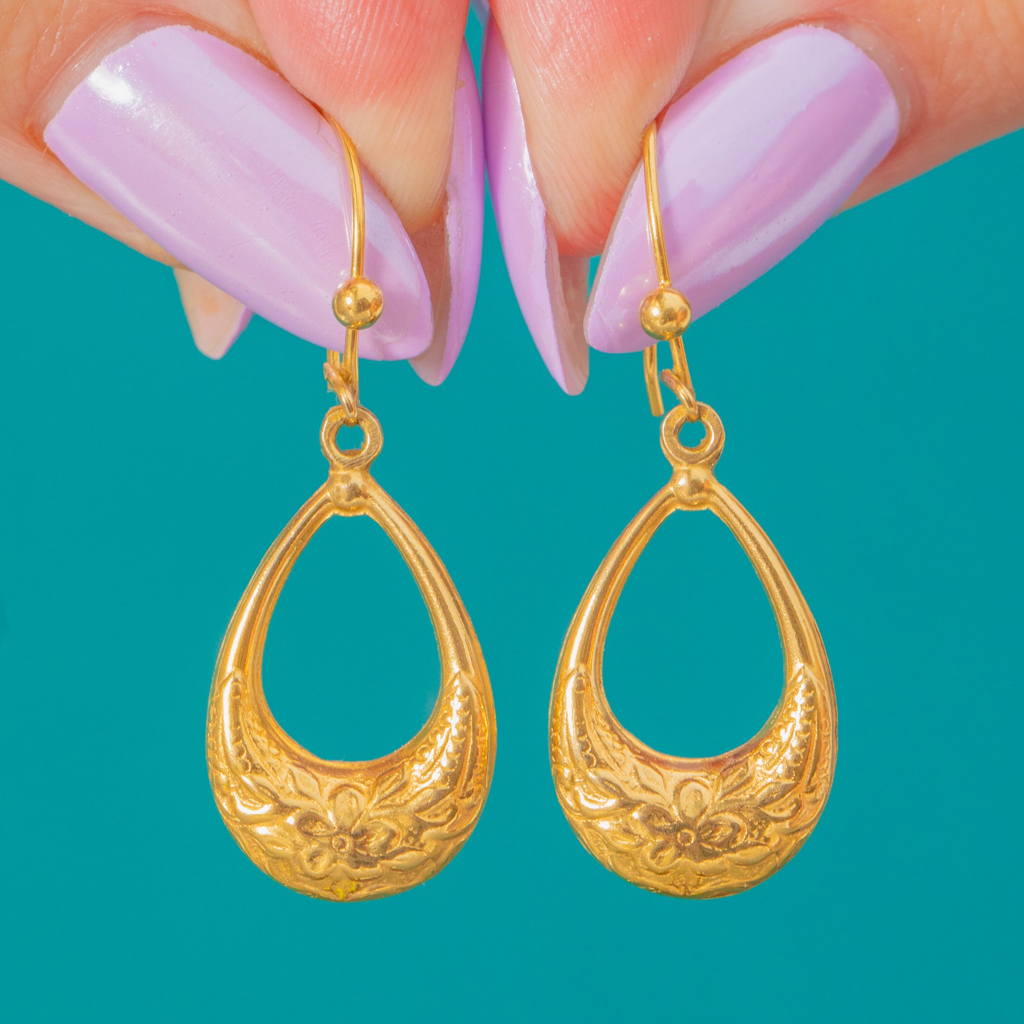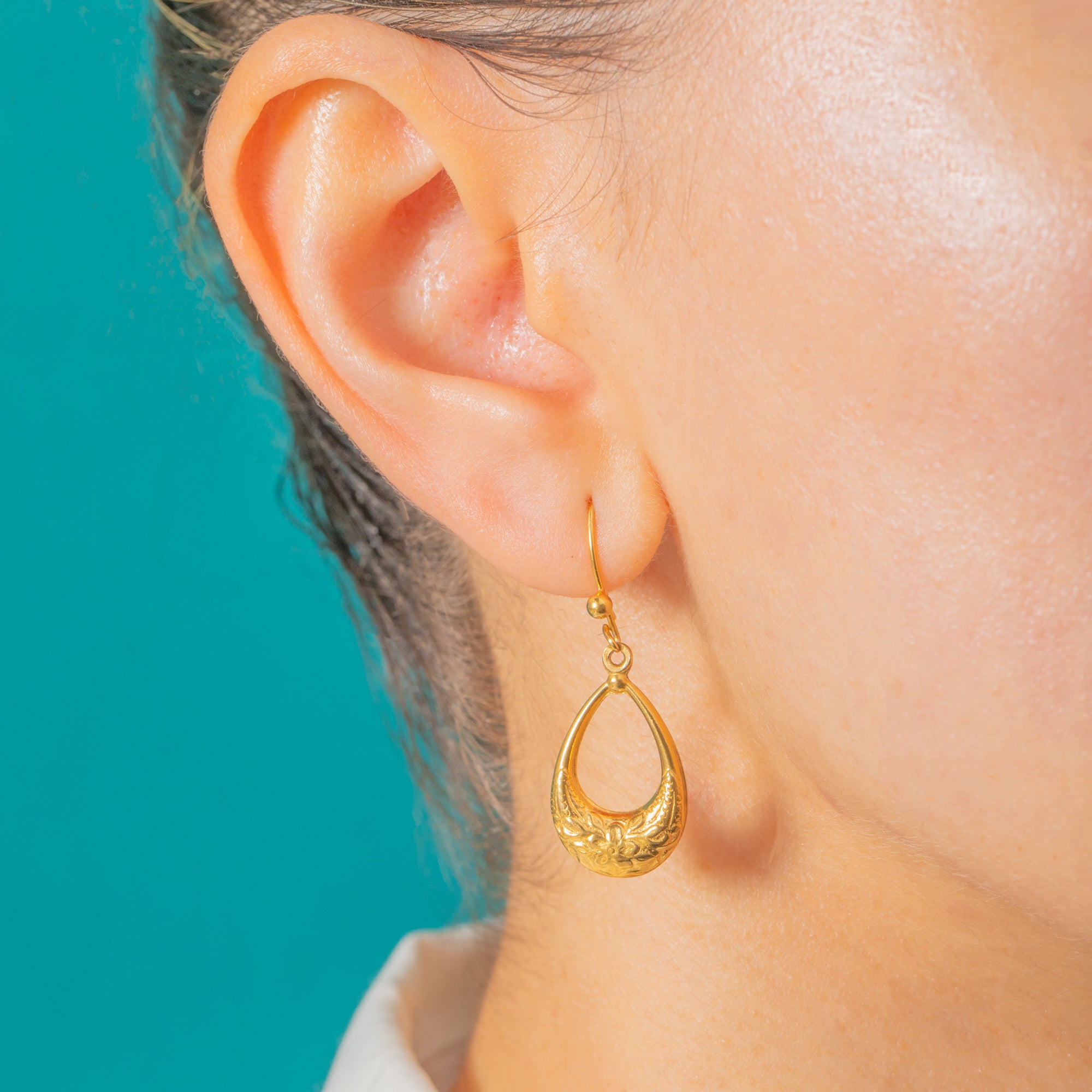 Bright 9ct Gold Floral Engraved Open Drop Earrings