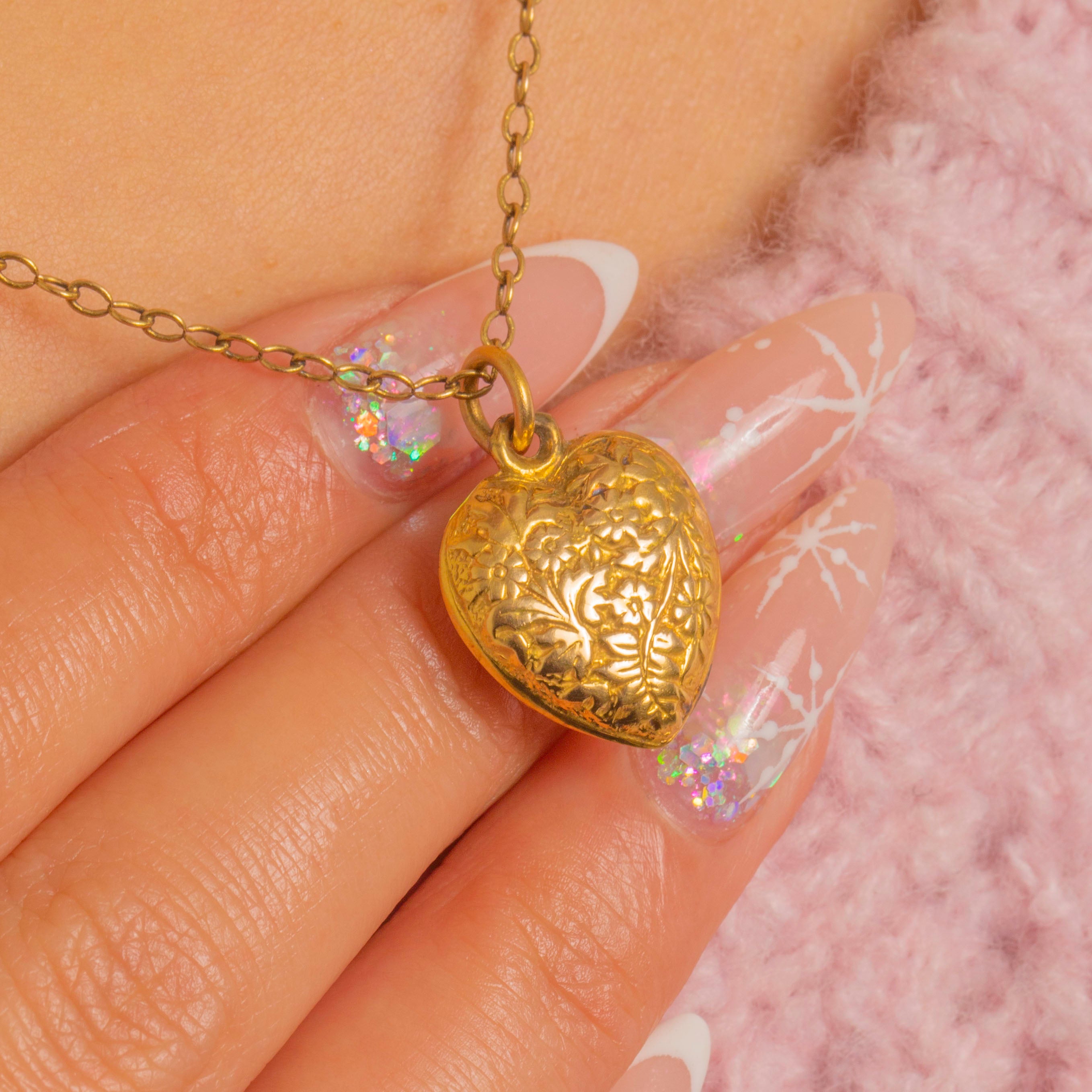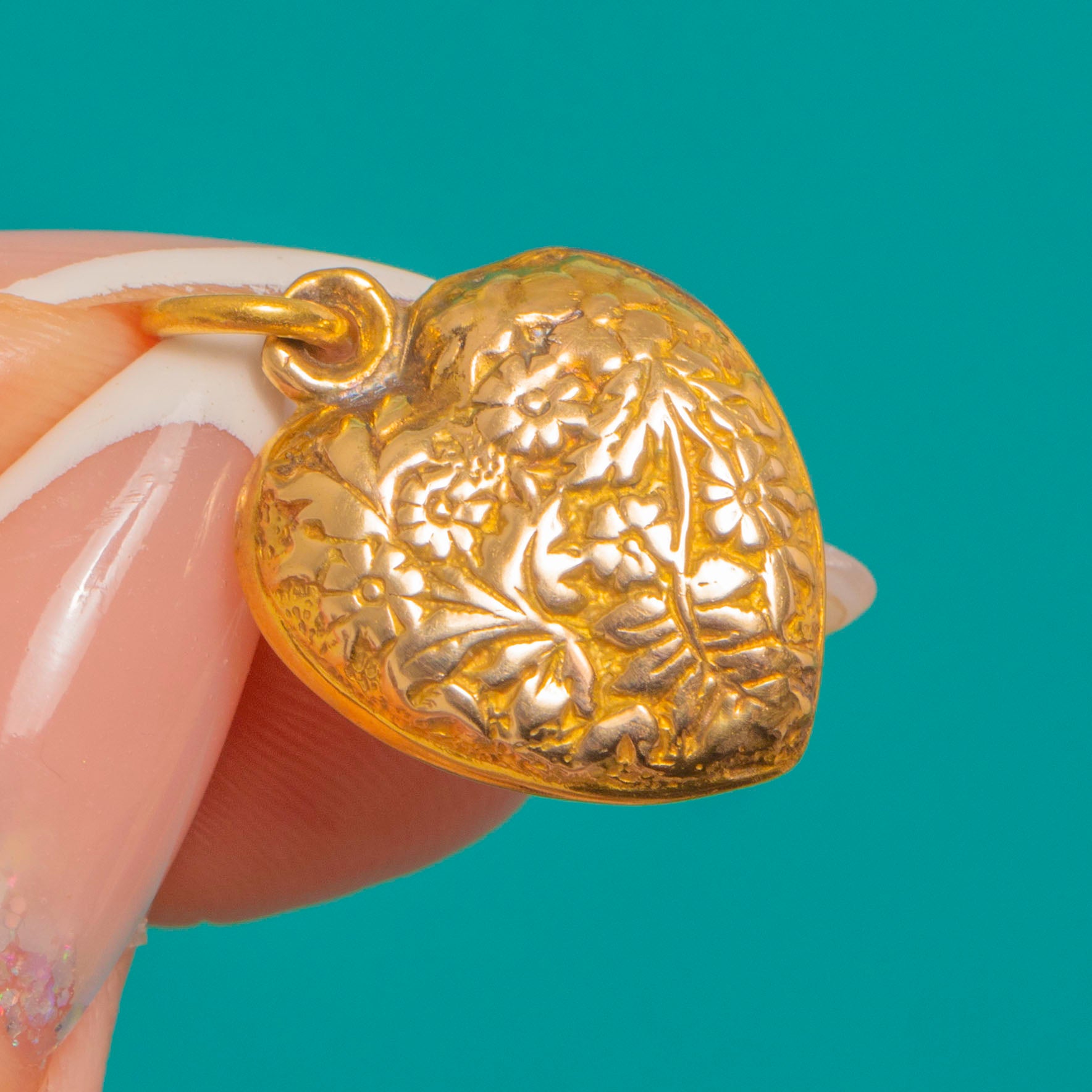 Crafted as a hollow, two-part heart with a visible perimeter seam, the front is pressed and finely chased to create its charming botanical motif. An integral hasp with a round jump ring makes it effortless to style; the gentle patina in the recesses highlights every curve and scroll for that coveted antique glow.
