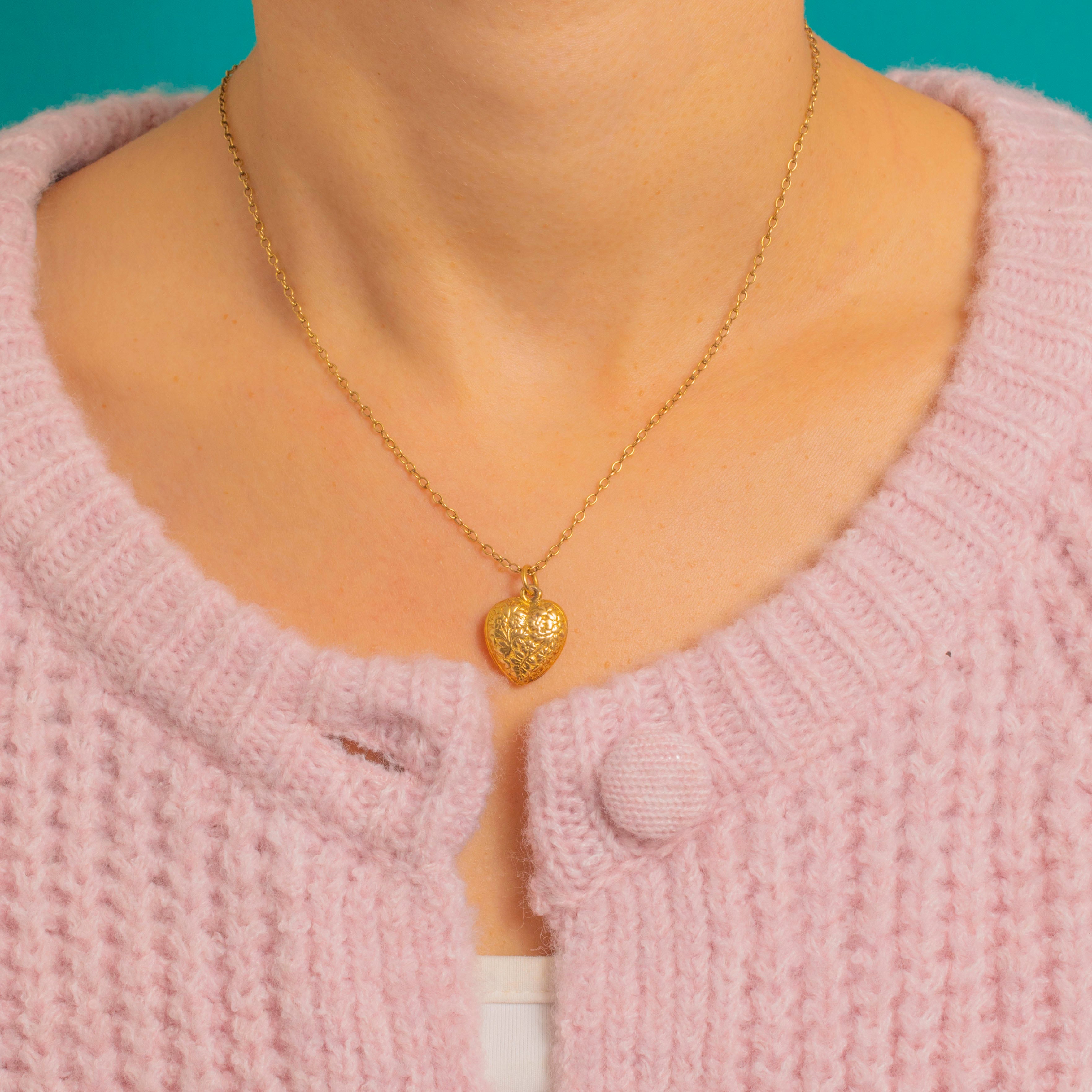 A timeless Victorian puffy heart pendant in buttery 9ct Gold, its softly domed silhouette adorned with romantic raised foliate and floral details. The relief catches the light beautifully, while the heart’s petite scale adds an elegant whisper of sentiment.