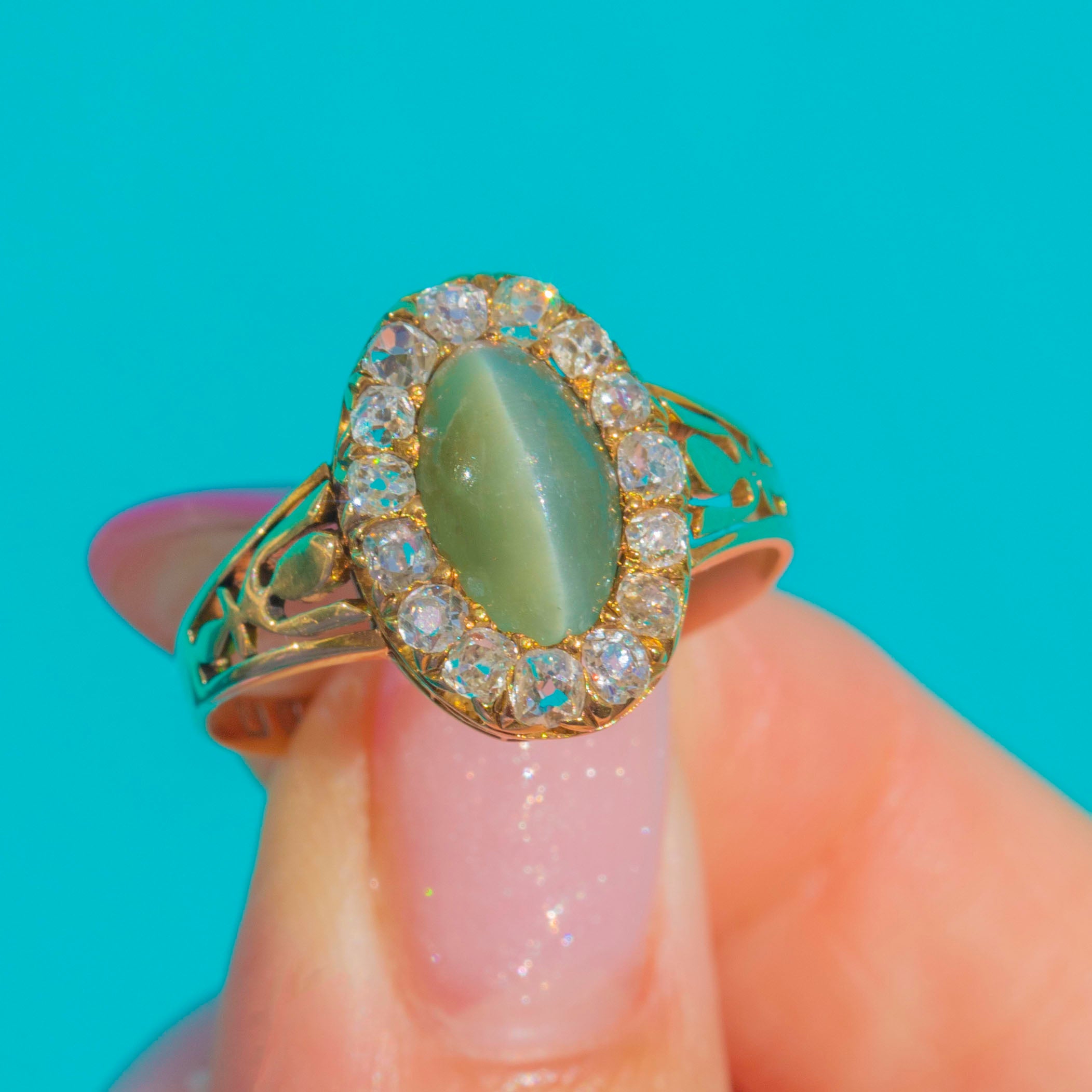 Victorian Cat's Eye Chrysoberyl Diamond Halo Ring in 18ct Gold
