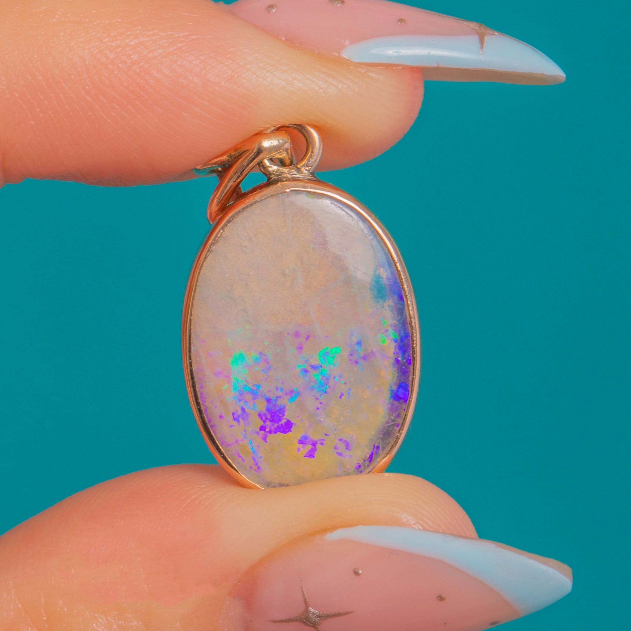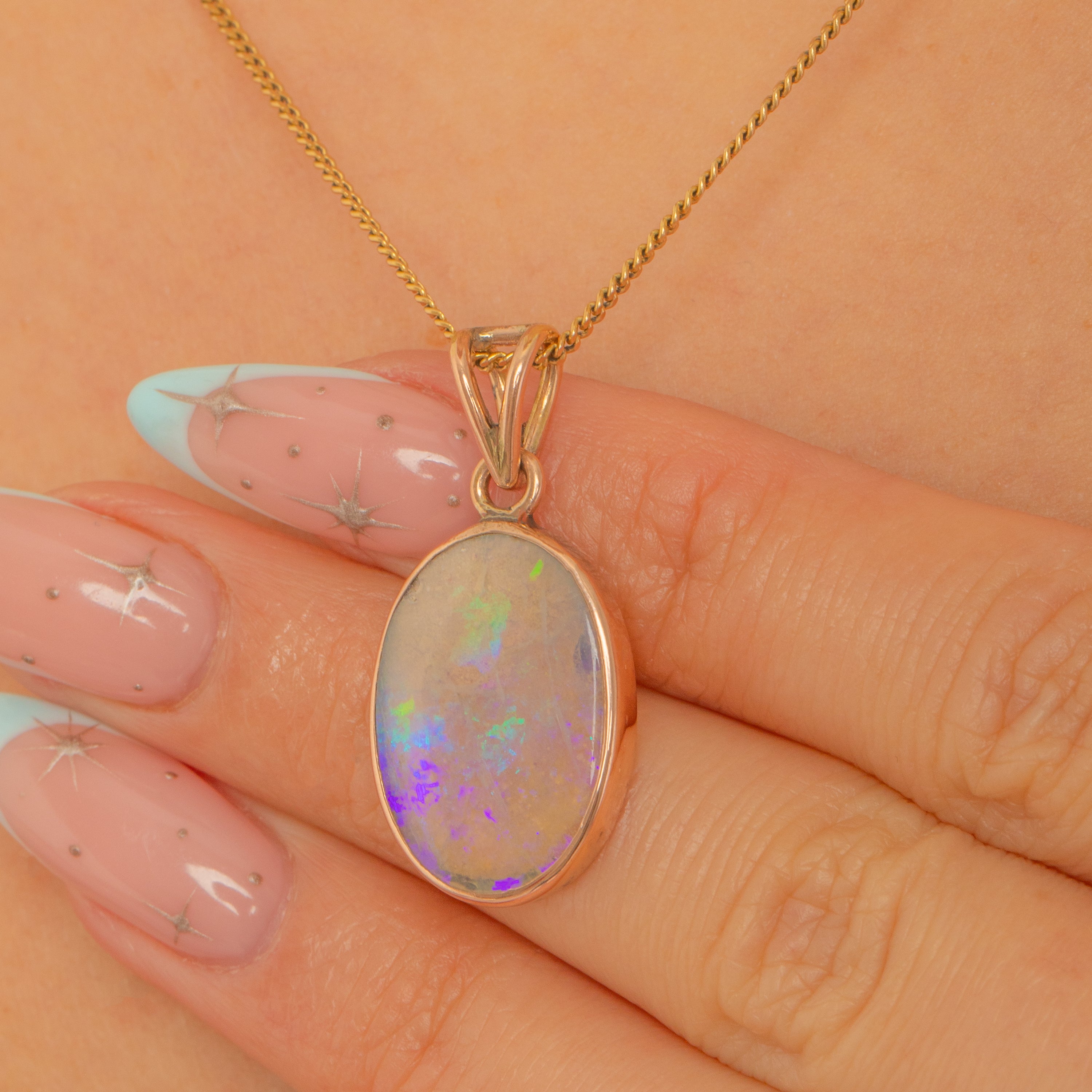 A luminous Art Deco opal pendant, bezel-set in 9ct rosy Gold to spotlight its mesmerising play-of-colour. The oval cabochon shimmers with deep purples, electric greens and flashes of orange, held in a smooth rub-over bezel with an open back to invite the light in and amplify the fire.
