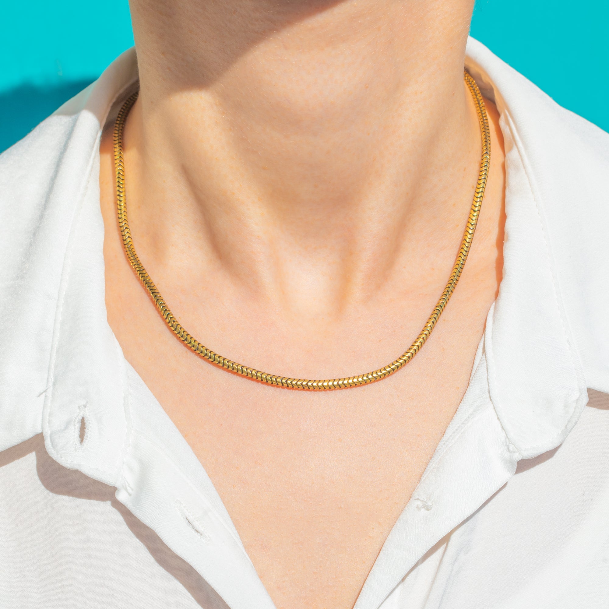 A quintessential Victorian staple, this chunky 15ct Gold snake chain drapes with that coveted liquid silk movement. Its tightly articulated links create a smooth, gleaming ribbon of Gold that sits beautifully at the collar, offering effortless elegance whether worn alone or as a luxe foundation for your favourite pendant.