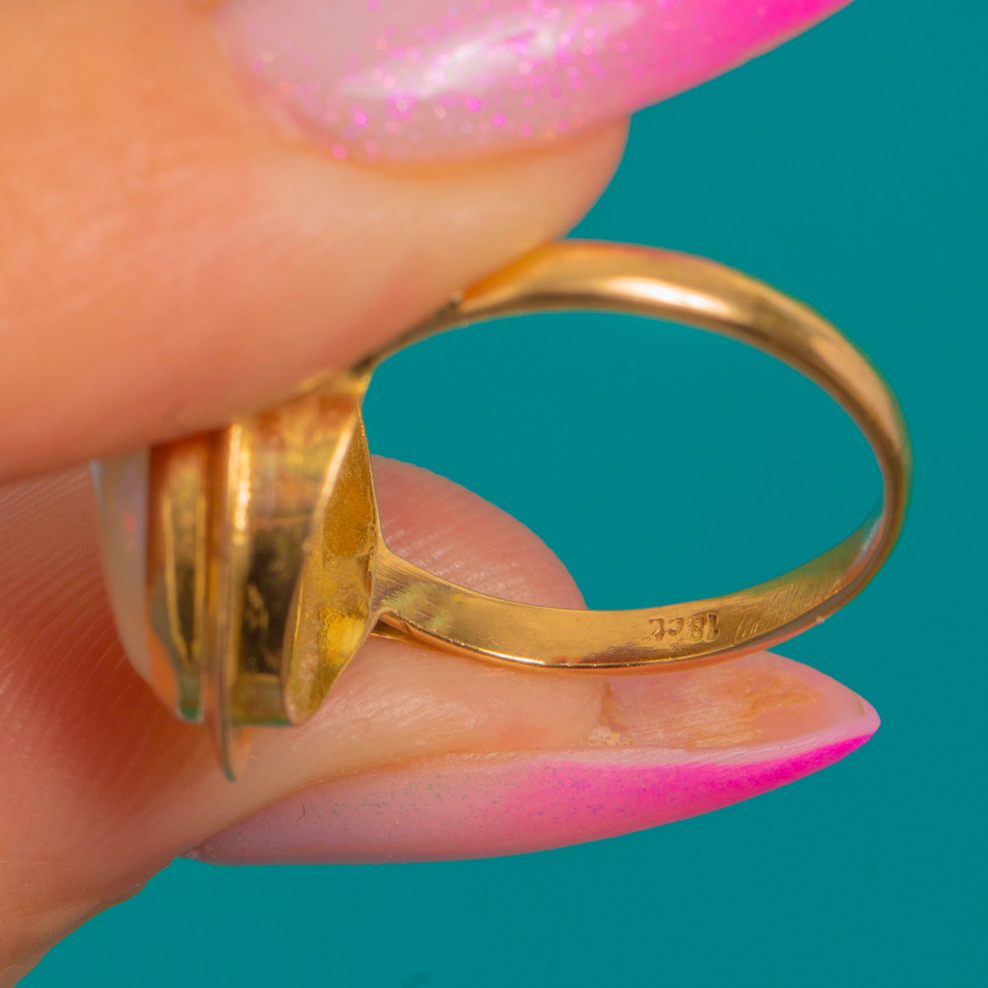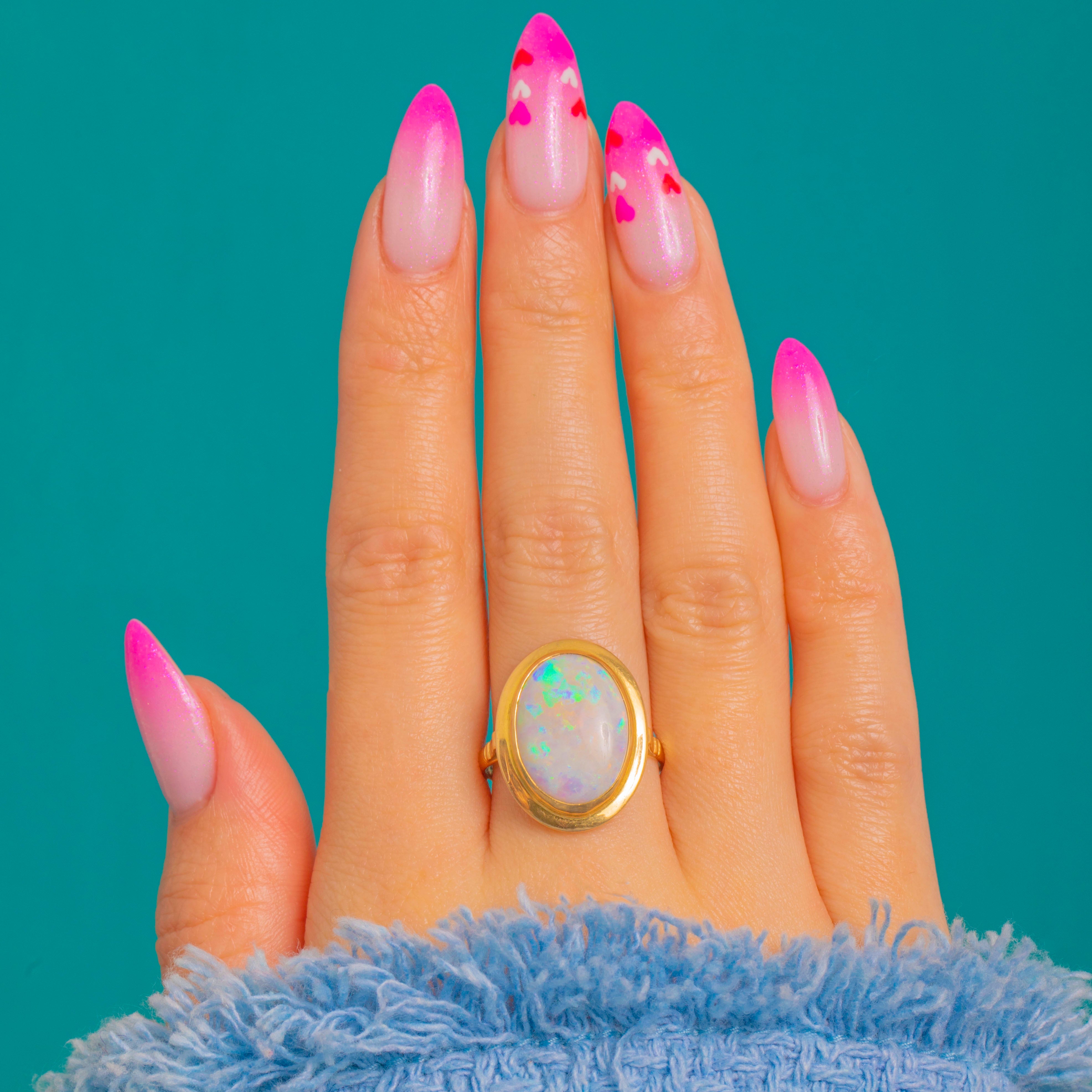 A luminous Mid-Century Opal ring in rich 18ct Gold, designed with that effortless modernist ease we adore. The large natural Opal cabochon glows with pastel play-of-colour, showing vibrant greens and blues with pretty flickers of pink and yellow as the light moves.