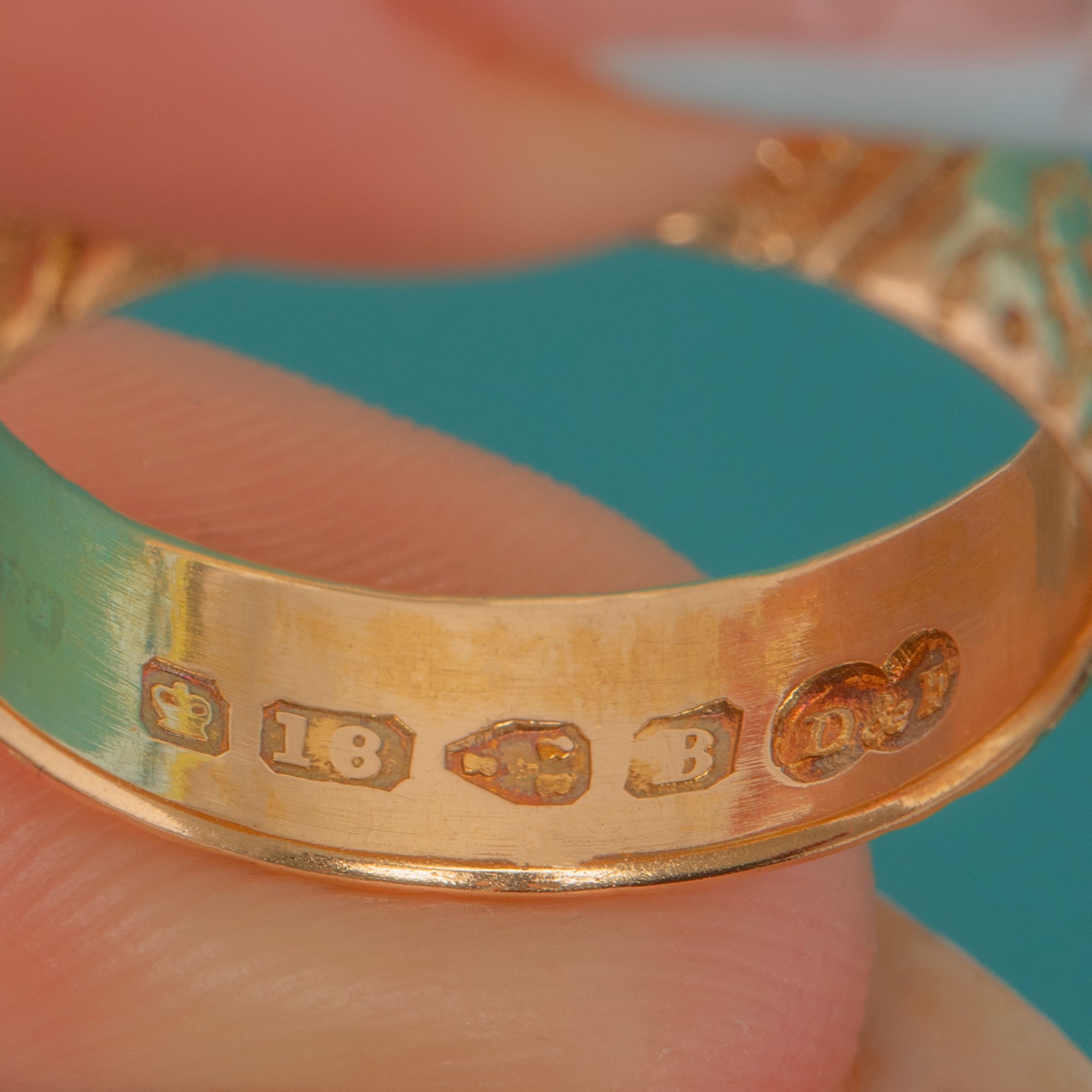 HALLMARKS: Crown, 18, Chester assay mark, date letter B for 1885, D&F maker’s mark.