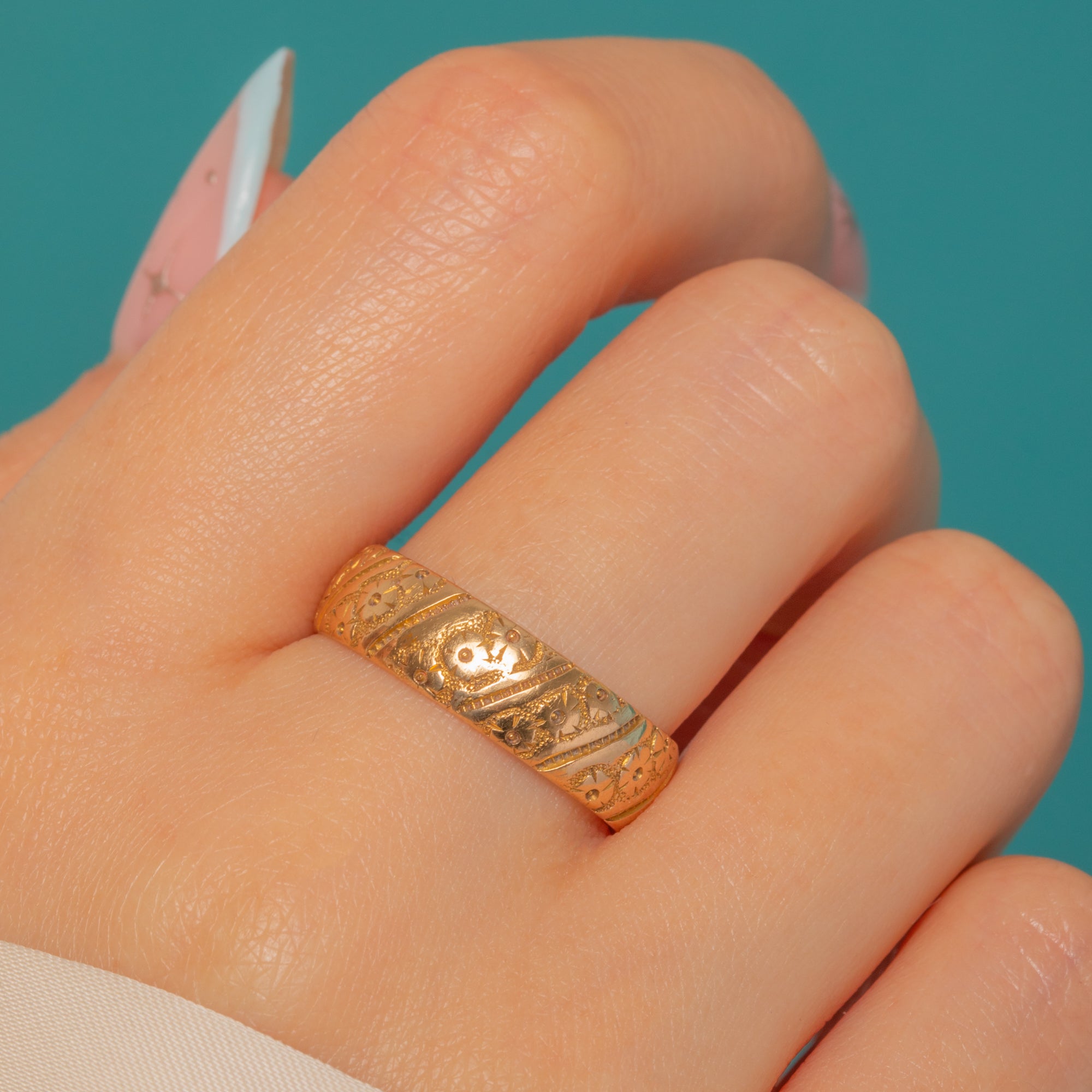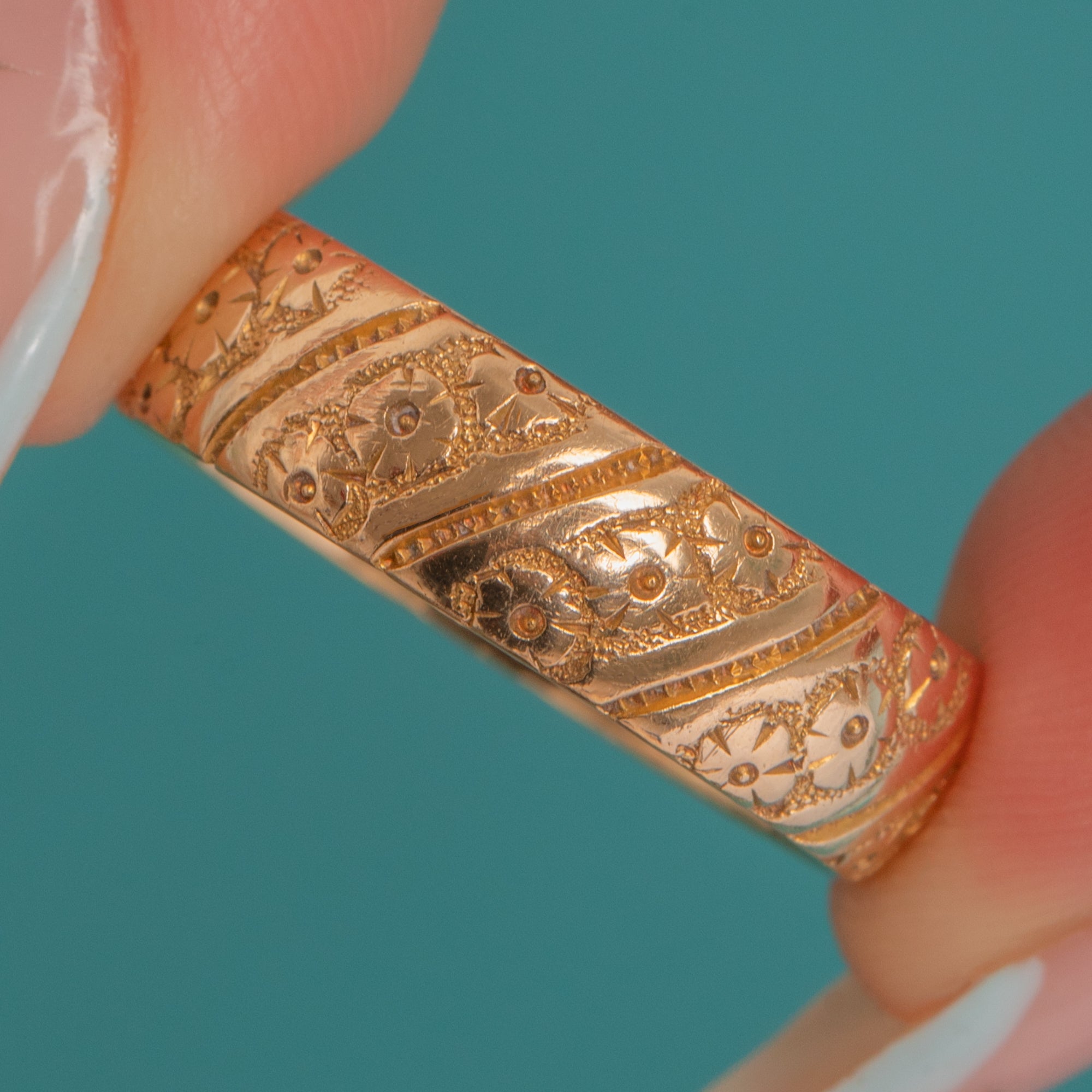A sumptuous Victorian carved band in rich 18ct Gold, this ring is exquisitely hand-engraved with diagonal “ribbon” panels of foliate scrolls and tiny blossom/starburst rosettes. The bright-cut work is framed by textured grounds, all set on a softly domed D-section band for that classic keeper ring profile.