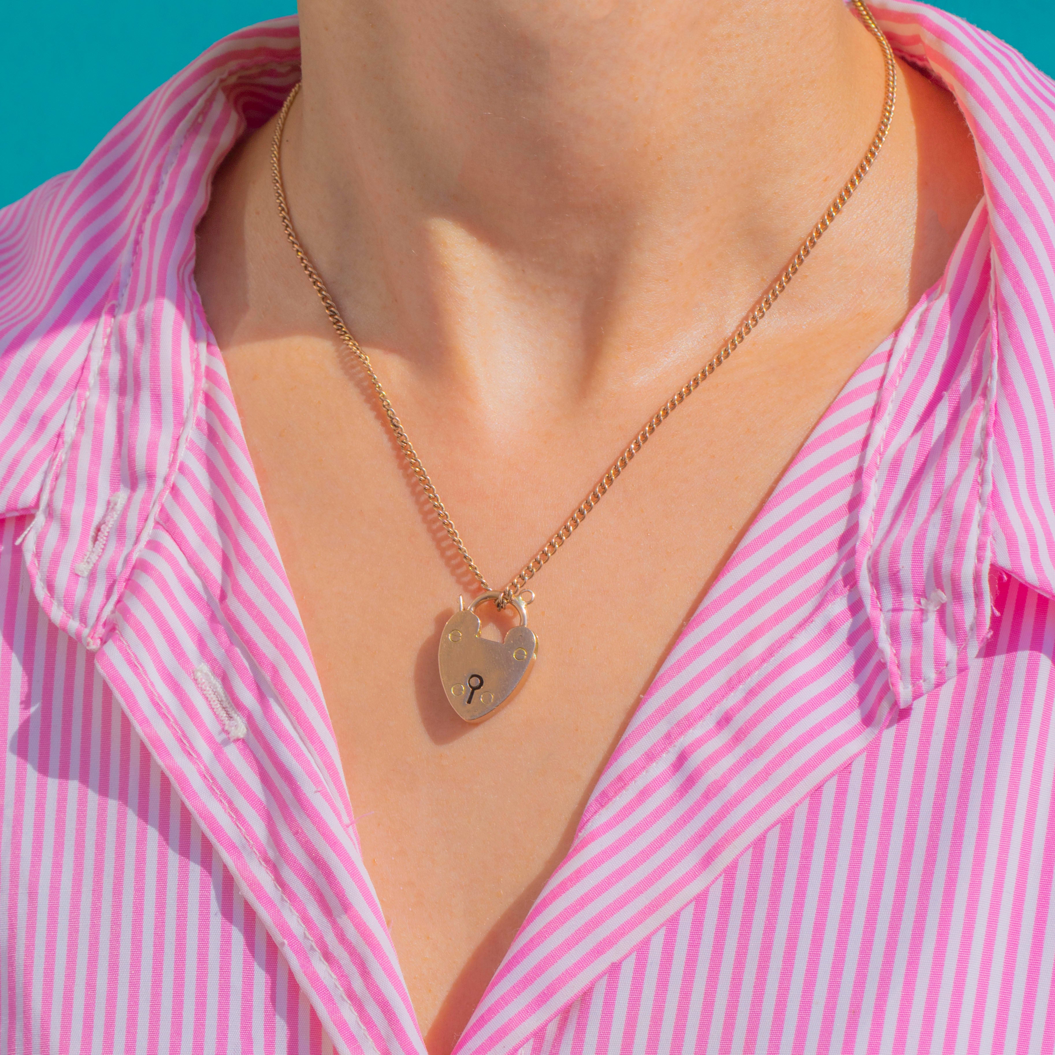 A classic Edwardian heart padlock rendered in 9ct Gold, with a romantic keyhole at its centre and four neat screw-head motifs. The front has a soft satin sheen that contrasts with polished edges, giving this petite charm a chic, tactile presence.