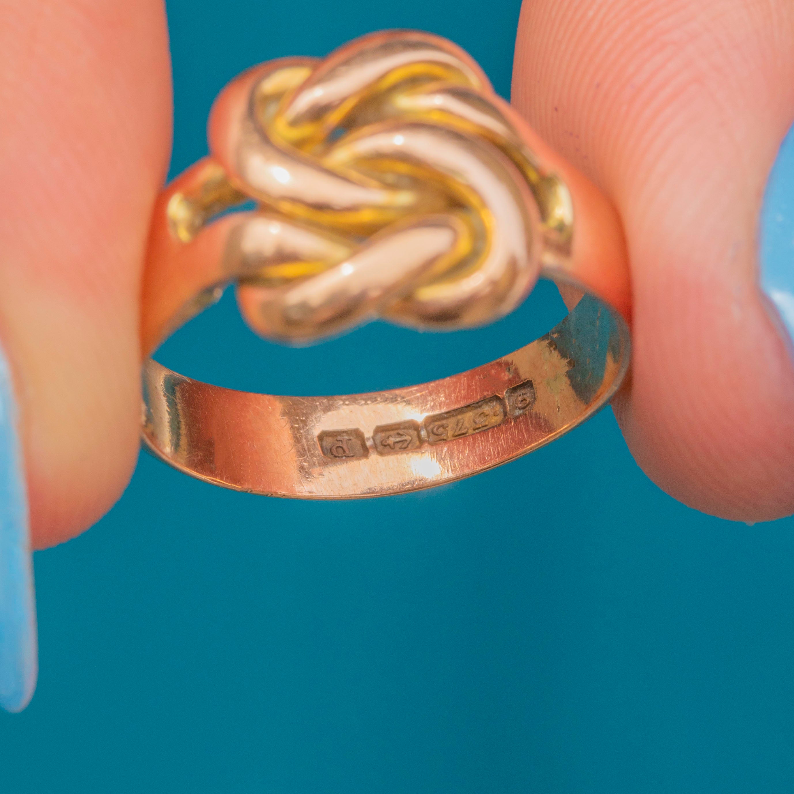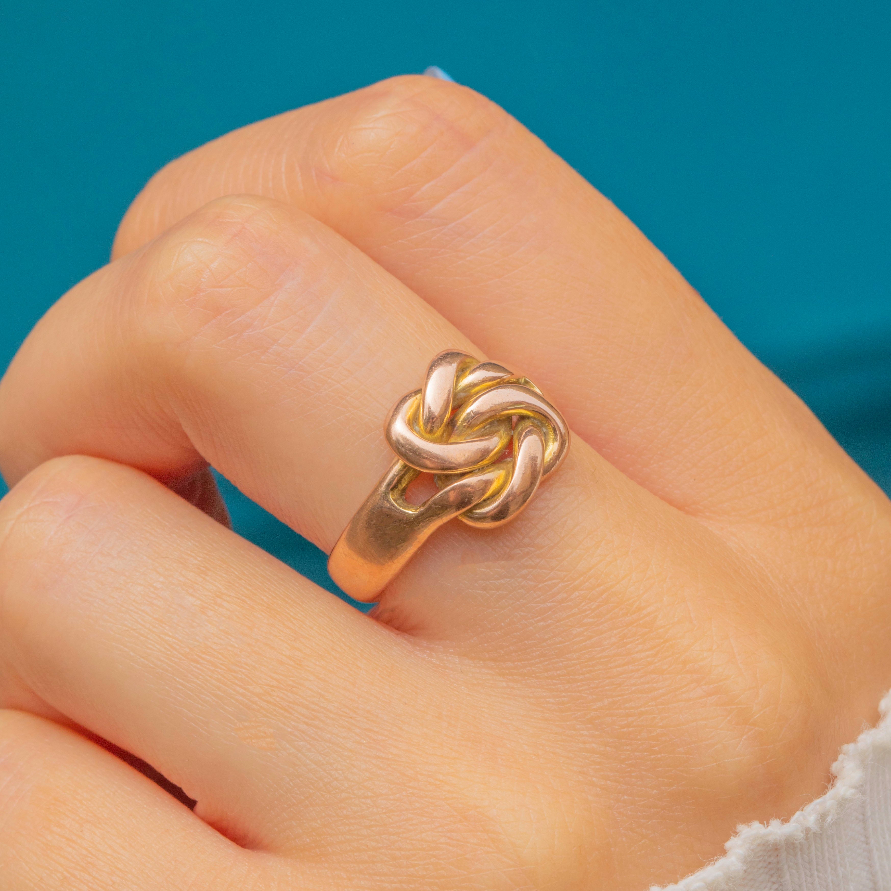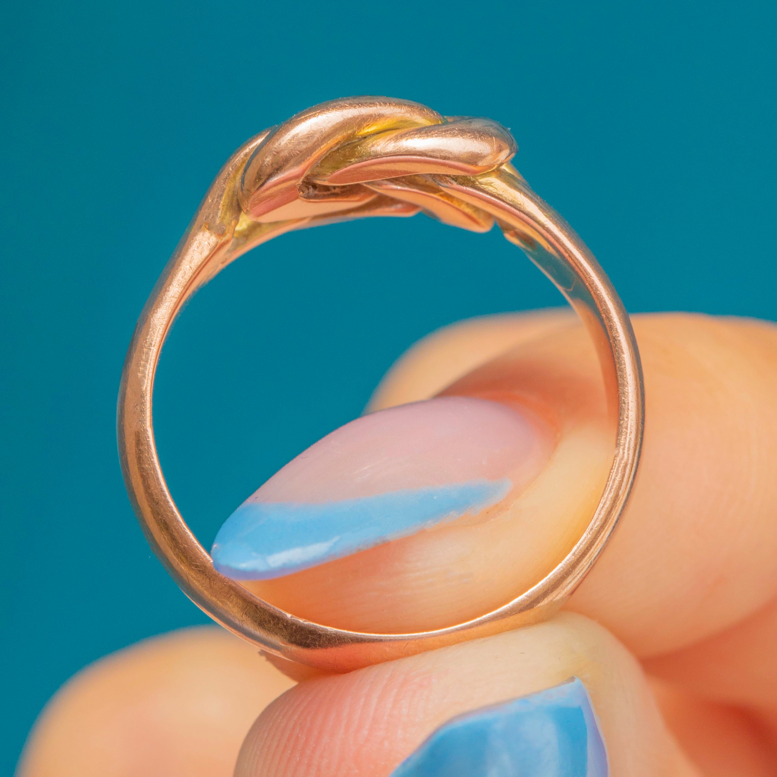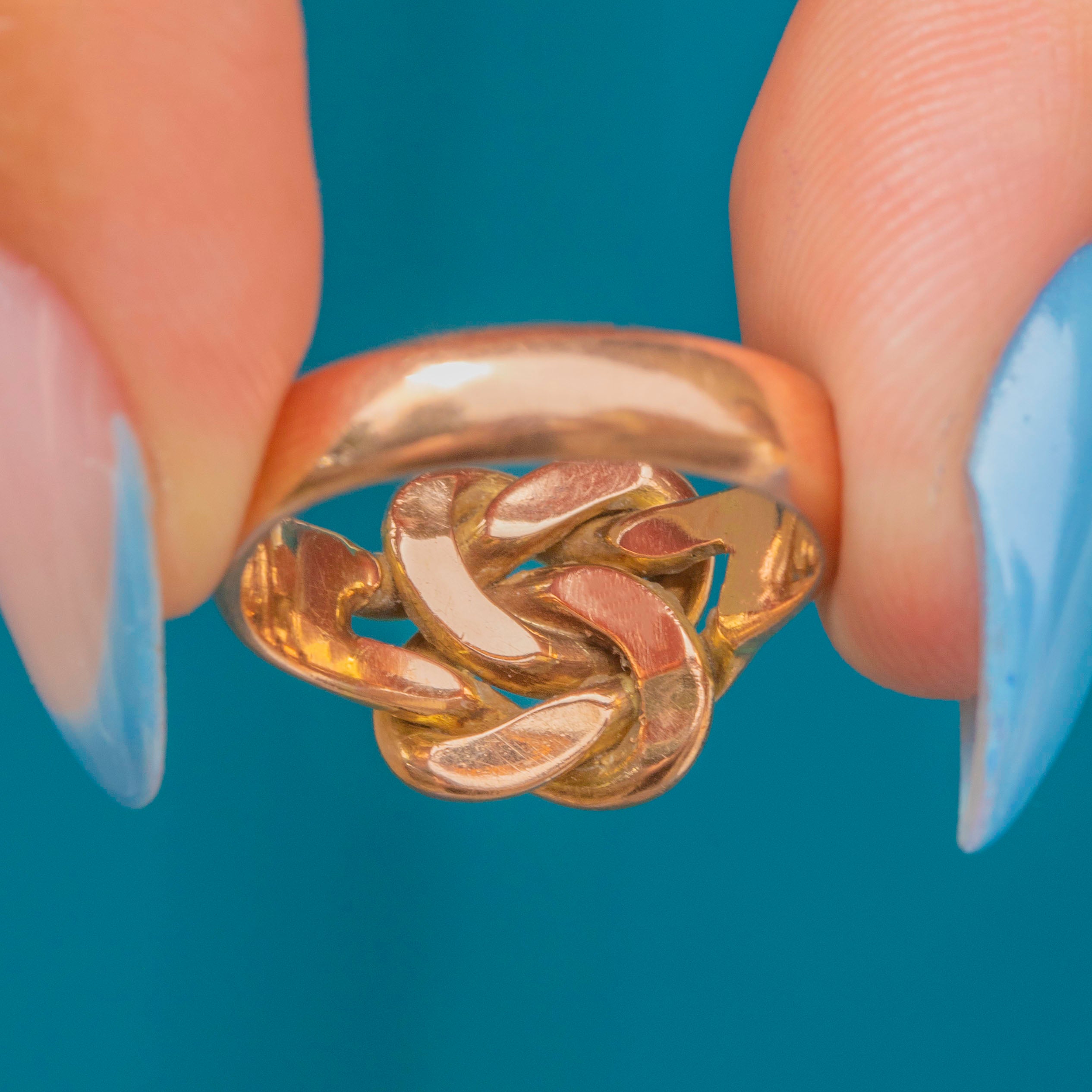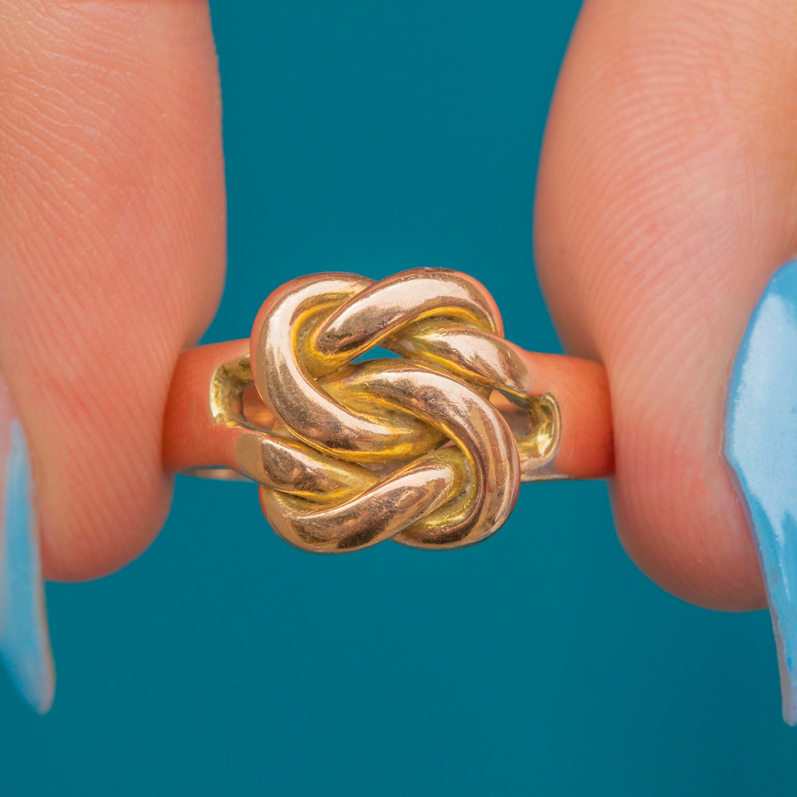 This antique 9ct Gold ring features a lover's knot in its centre, with the chunky ring face steeped in romantic sentiment, symbolic of two lovers intertwined.