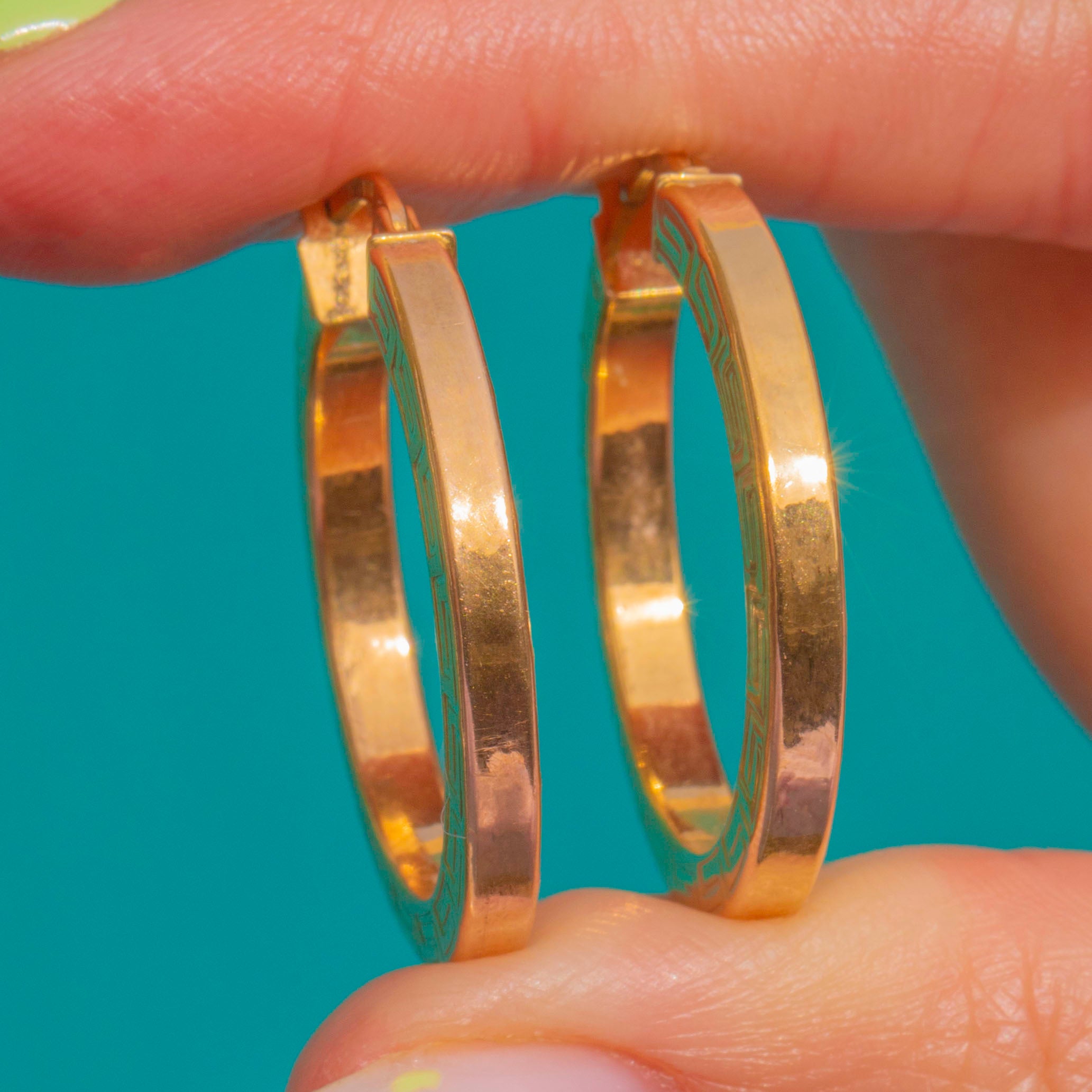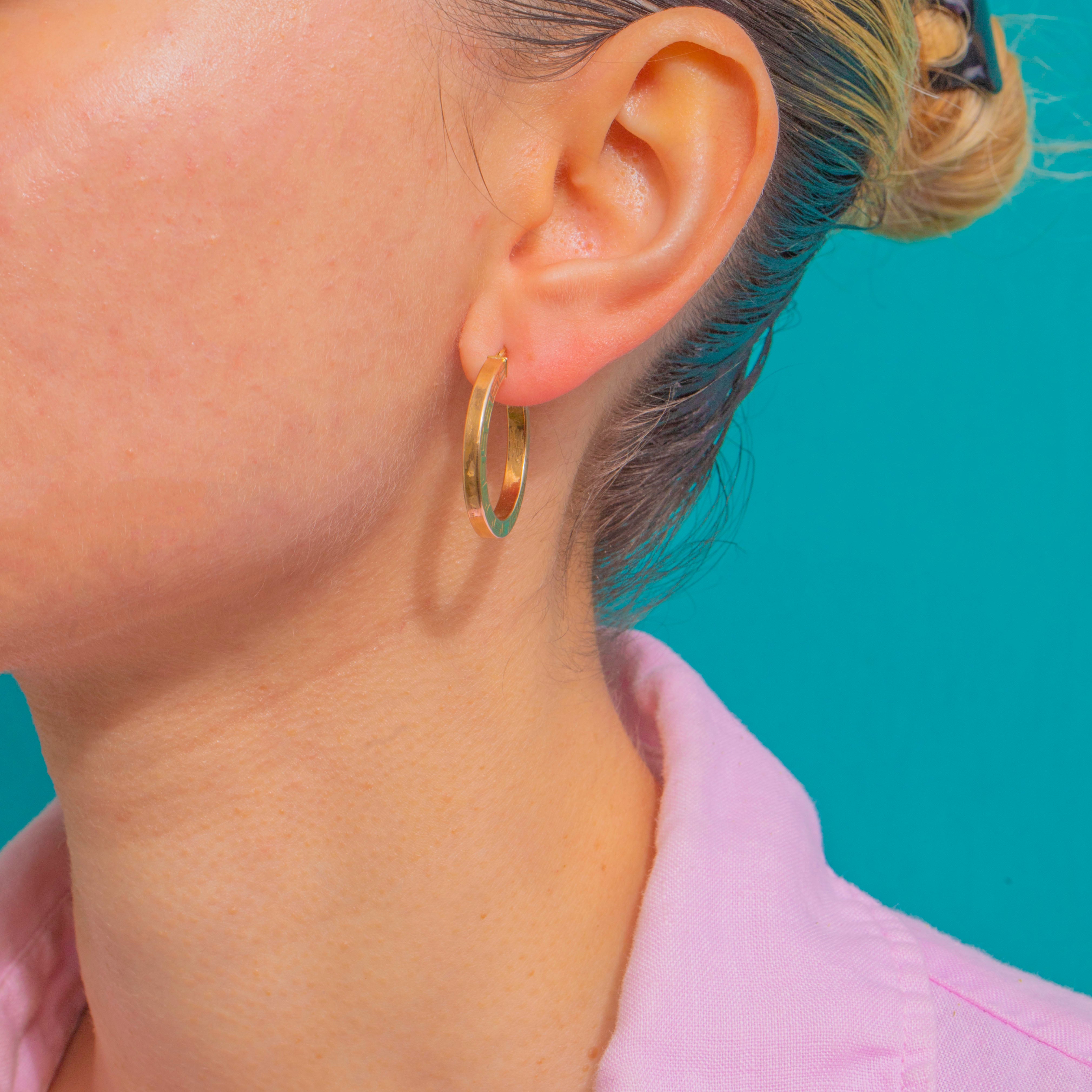 Bold yet beautifully refined, these Vintage 9ct Gold hoop earrings celebrate the timeless Greek key. The flat-band profile gives a clean architectural line, while the continuous meander motif wraps each hoop in warm, high-polish radiance.